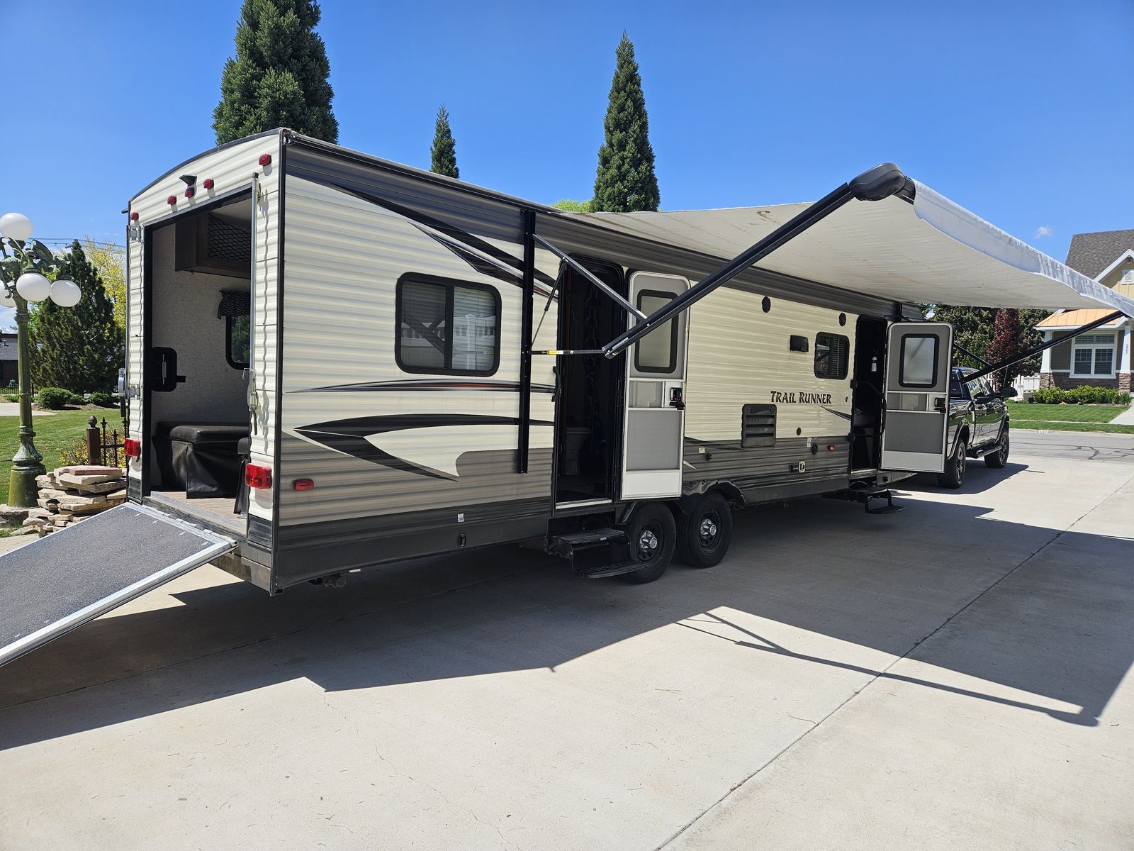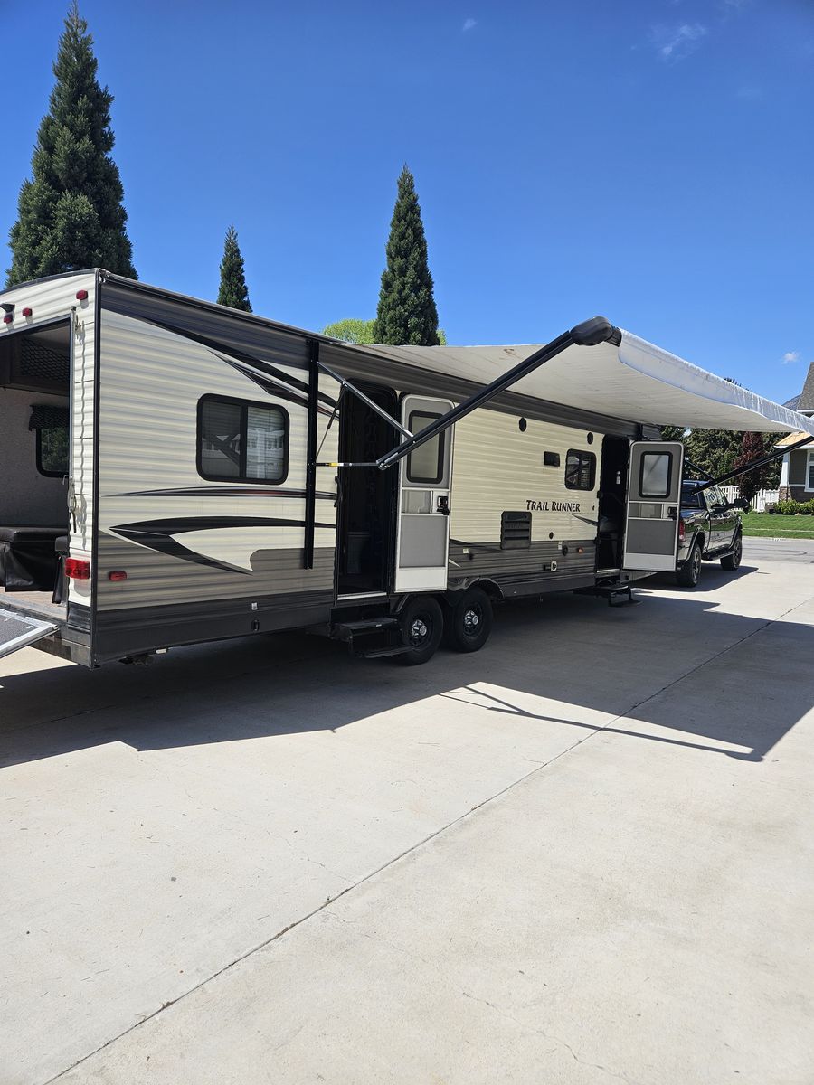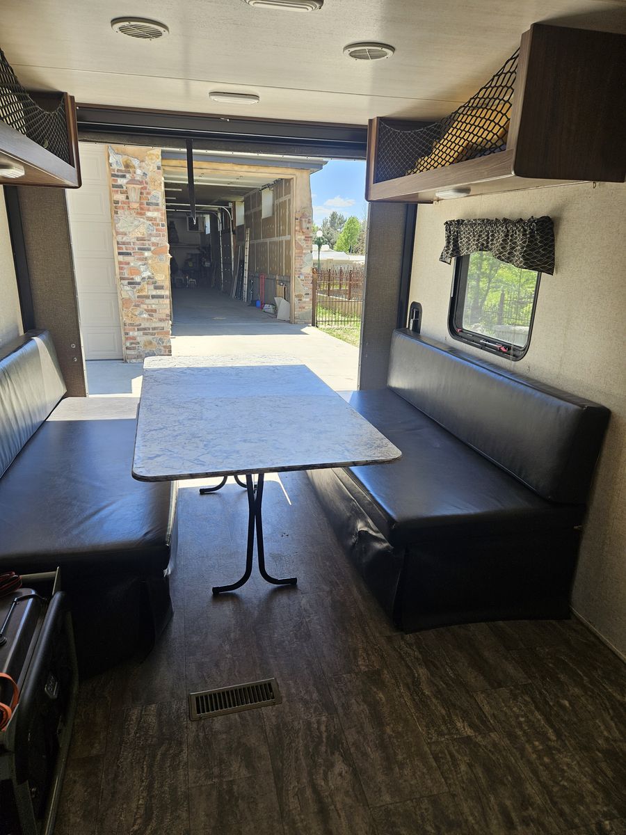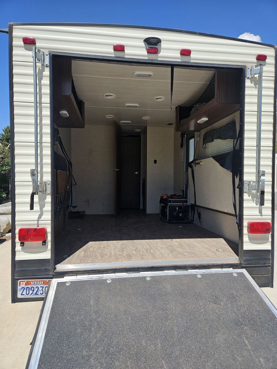 PayPalThis a travel trailer toy hauler with a single slide-out and a U-shaped dinette. It can sleep up to six people and has a base weight of 6,777 lbs. The 28TH model is known for its spaciousness, with one slide-out expanding the living area and a garage space in the back. Key Features and Specifications: Toy Hauler: Designed to accommodate ATVs, motorcycles, or other recreational vehicles in the rear garage space. Sleeping Capacity: Sleeps up to 8 people. Single Slide-Out: Expands the living space with a U-shaped dinette. Interior Height: 80 inches (6 feet 8 inches). Base Weight: 6,777 lbs. Hitch Weight: 1,274 lbs. Fresh Water Capacity: 42 gallons. Garage Dimensions 93 inches (7.75 ft) wide, 132 inches (11 ft) long. Ramp Door Opening 69.5 inches wide, 73 inches tall. Exterior Length 31 feet (box) + 35 feet (overall). It has been stored indoor year round