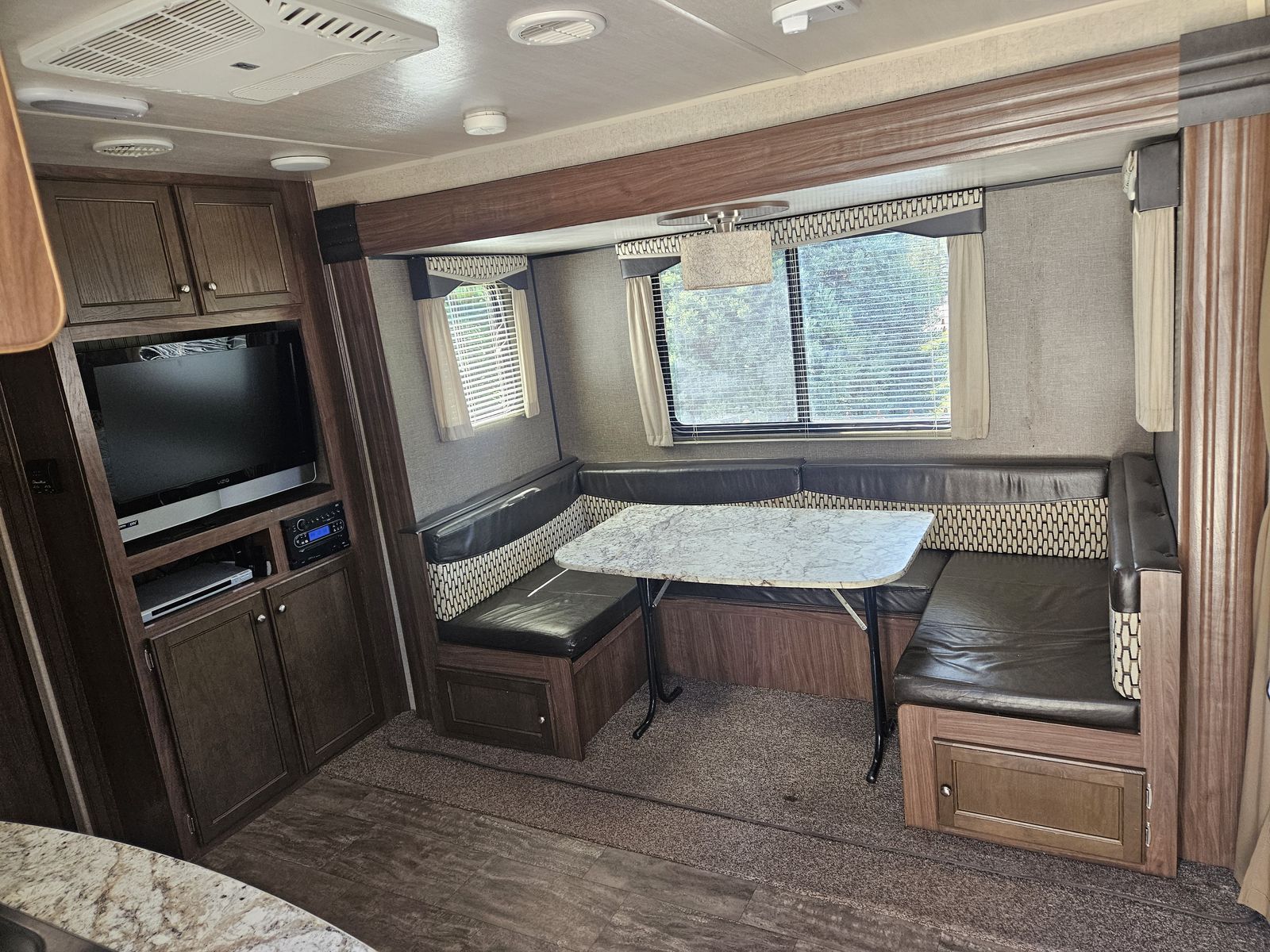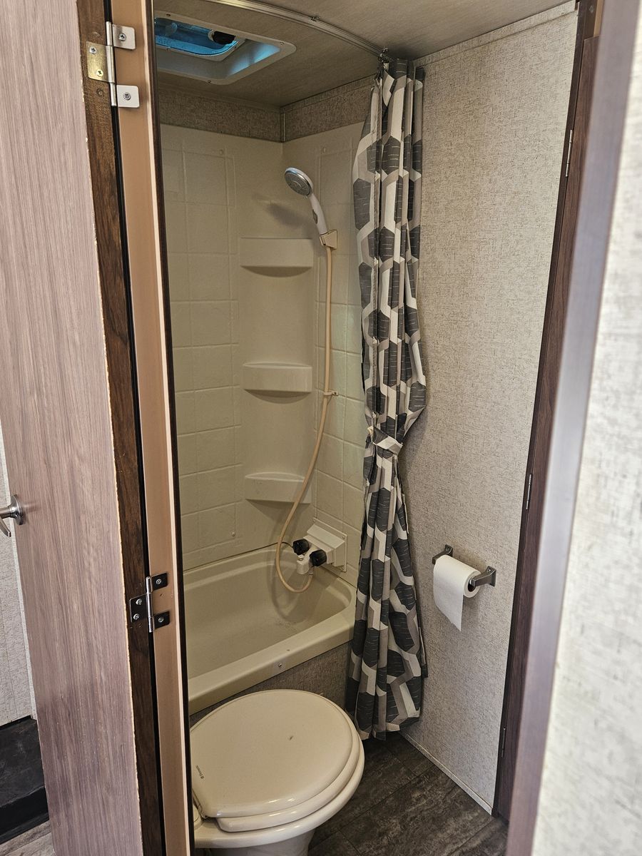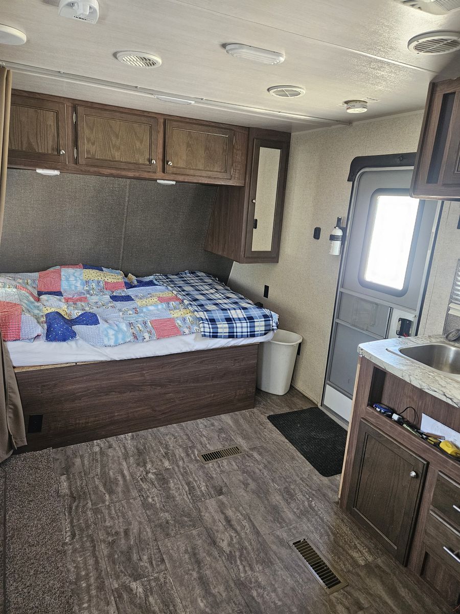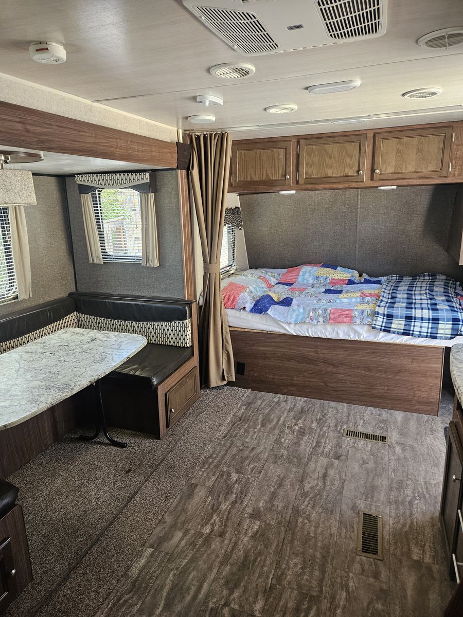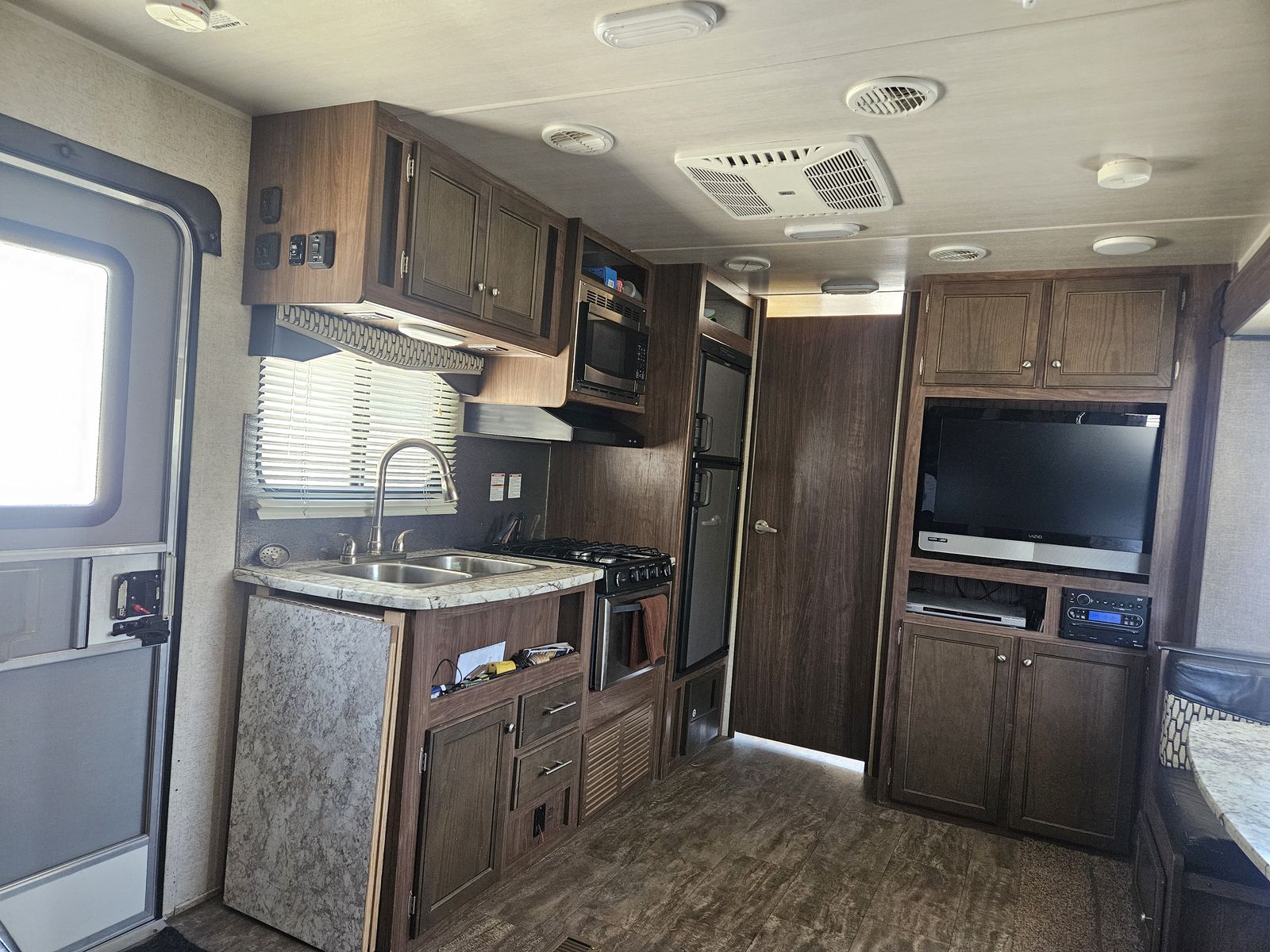 PayPalThis a travel trailer toy hauler with a single slide-out and a U-shaped dinette. It can sleep up to six people and has a base weight of 6,777 lbs. The 28TH model is known for its spaciousness, with one slide-out expanding the living area and a garage space in the back. Key Features and Specifications: Toy Hauler: Designed to accommodate ATVs, motorcycles, or other recreational vehicles in the rear garage space. Sleeping Capacity: Sleeps up to 8 people. Single Slide-Out: Expands the living space with a U-shaped dinette. Interior Height: 80 inches (6 feet 8 inches). Base Weight: 6,777 lbs. Hitch Weight: 1,274 lbs. Fresh Water Capacity: 42 gallons. Garage Dimensions 93 inches (7.75 ft) wide, 132 inches (11 ft) long. Ramp Door Opening 69.5 inches wide, 73 inches tall. Exterior Length 31 feet (box) + 35 feet (overall). It has been stored indoor year round