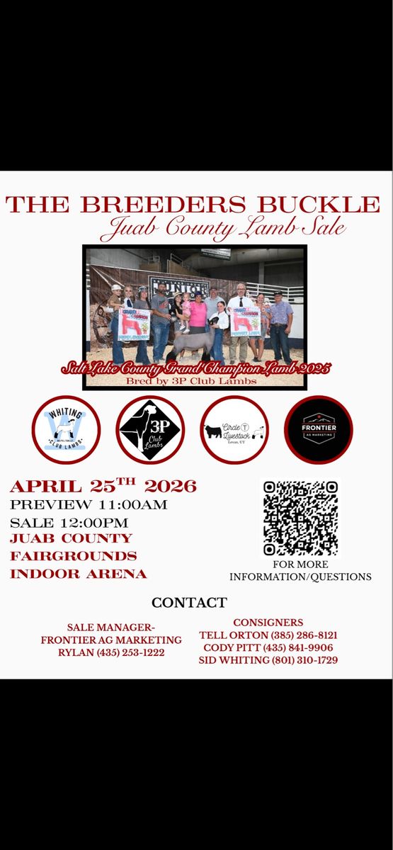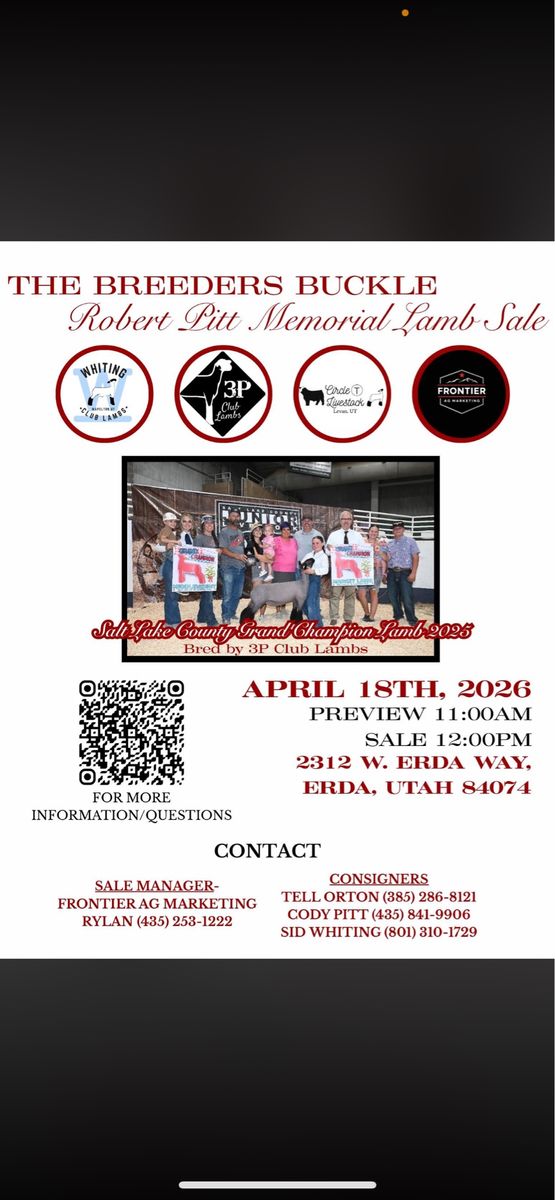 The Breeders Buckle Sale was created to give youth exhibitors another opportunity to compete for something special — a belt buckle. This sale features some of the very best lambs we have raised this year, offering exhibitors a strong chance to compete not only in the market show, but also for the Breeders Buckle. Each lamb in the sale will be identified with a button tag in its ear. When the lambs are shown at the designated show, the group of breeders will evaluate the projects and recognize the exhibitor who has done the best job feeding, managing, and presenting their lamb throughout the season. That exhibitor will take home the Breeders Buckle - a reward for their hard work, dedication, and success in the ring. This sale is about more than great lambs - it's about supporting youth, rewarding effort, and creating another opportunity to win.