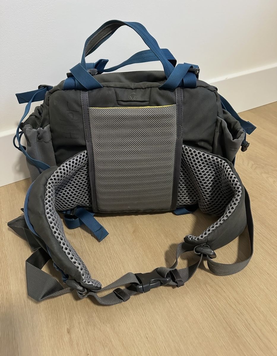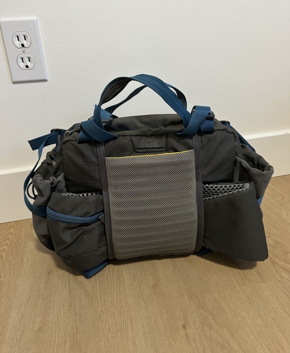 • Built with durable ripstop nylon fabric. • Features a tuck-away waist belt for a messenger-style carry option and a removable shoulder strap. • Includes side reinforced water bottle pockets that fit up to 1L bottles. • Patented Delta Compression System helps distribute loads up to twelve pounds evenly for comfortable carrying. • Contains an interior foam padded sleeve designed for a tablet.