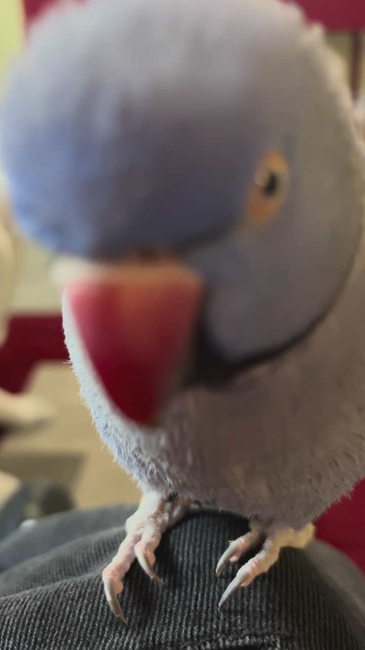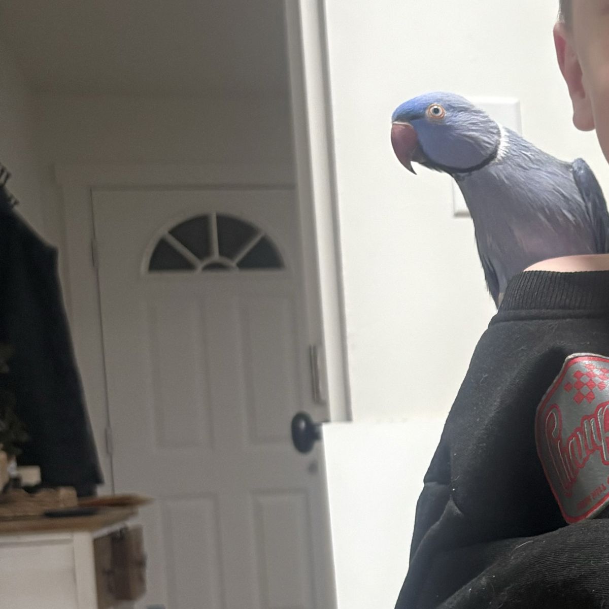Prince is the blue Indian ring neck and about 2 years old! He says so many phases, from “come here” “your so cute” his name and so much more phases and sounds! Prince is a male