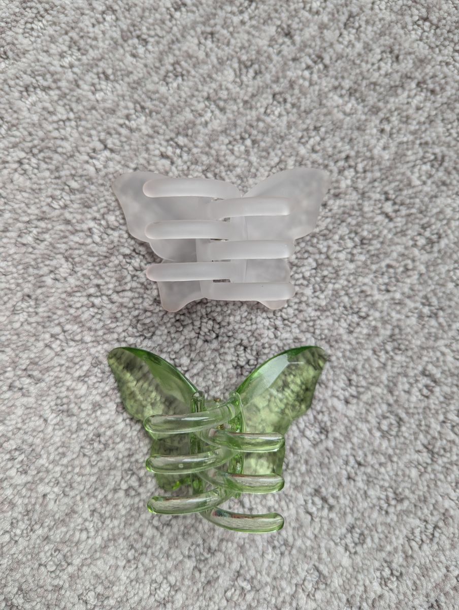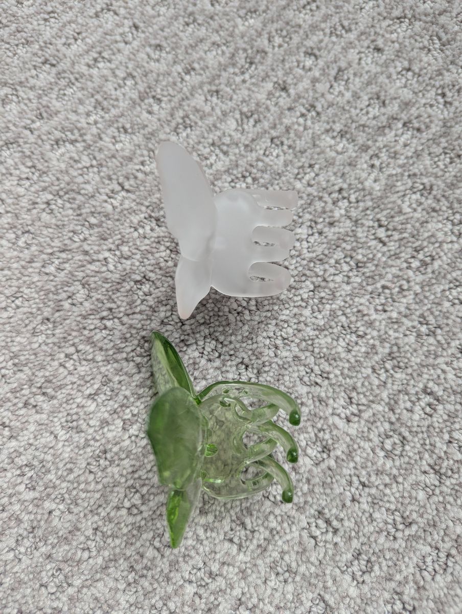 VenmoOne clear green and one frosted white. Small to medium size. In good condition, I just don't have enough hair for these to hold my hair up well!