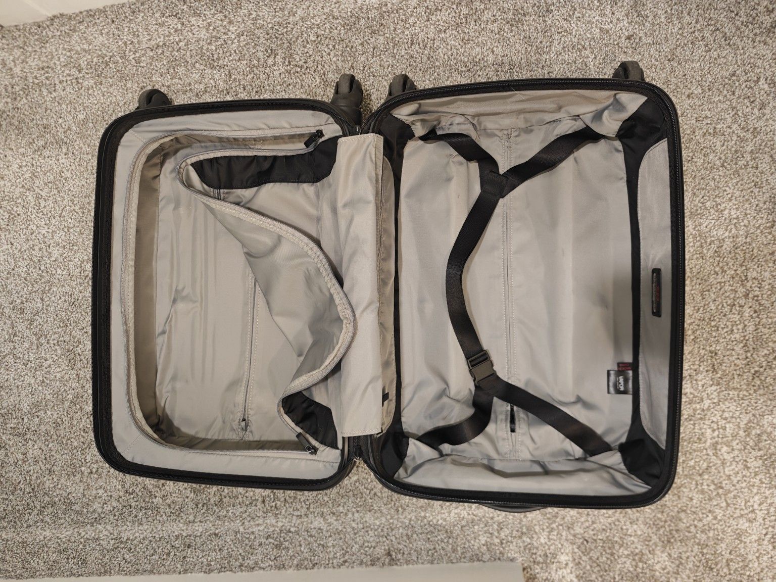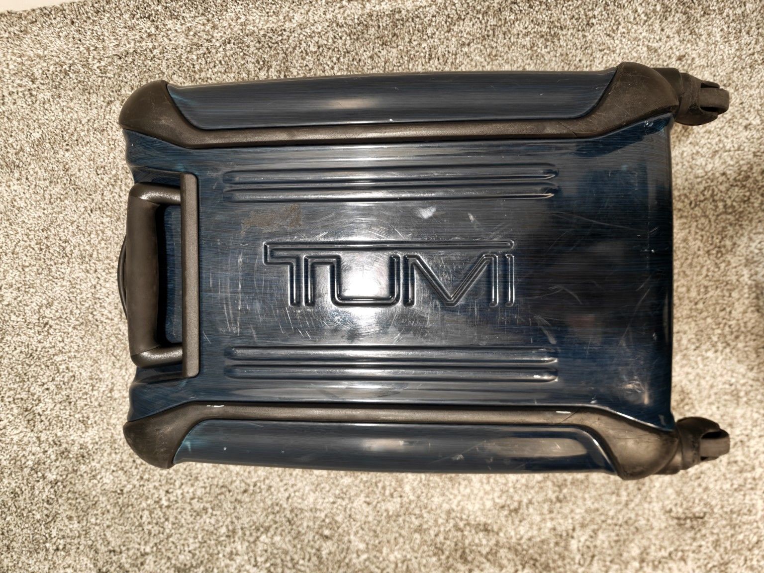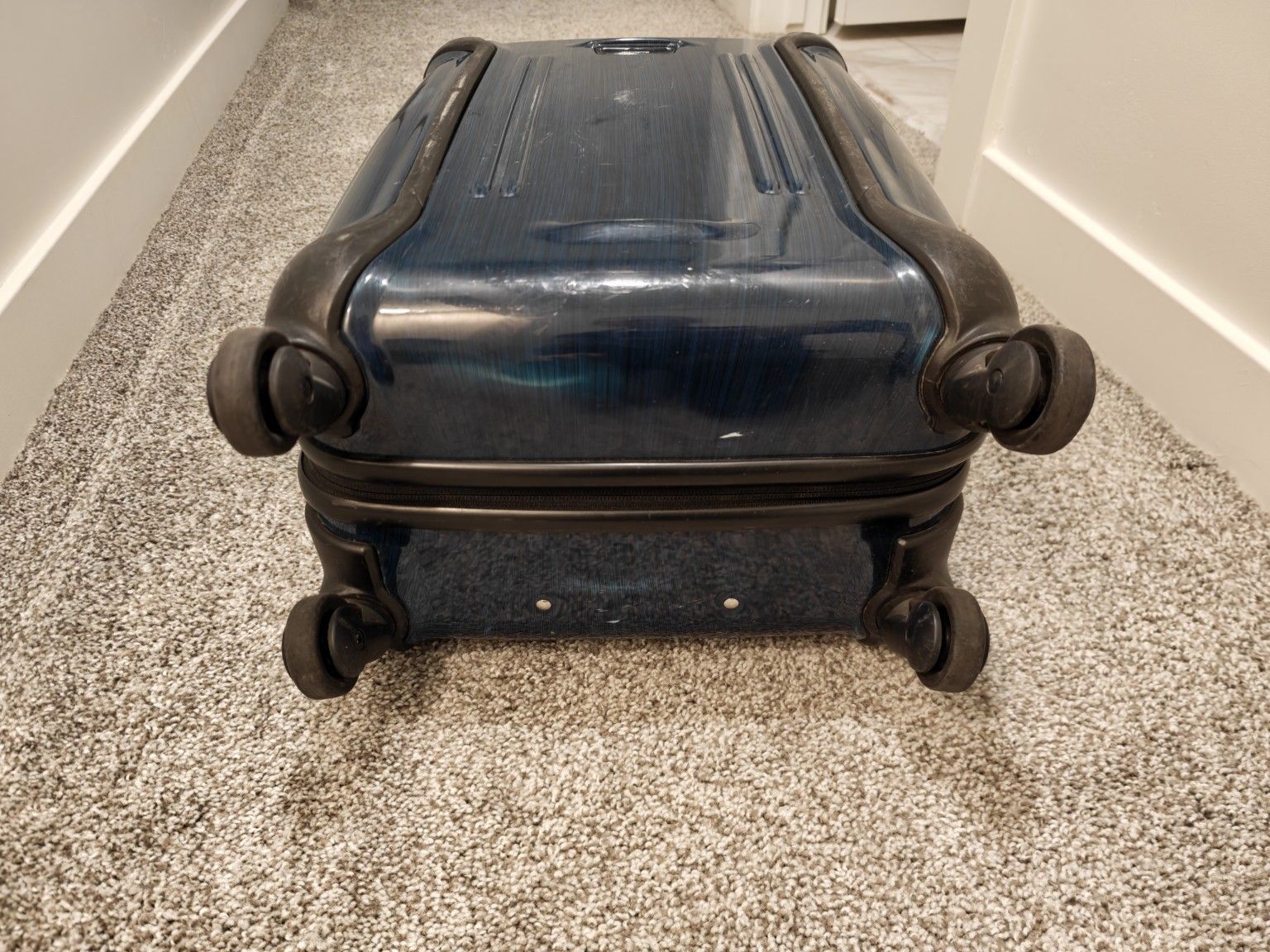VenmoPremium TUMI carry-on suitcase in a sleek midnight blue hard shell with a subtle metallic sheen, offering a modern and sophisticated look.