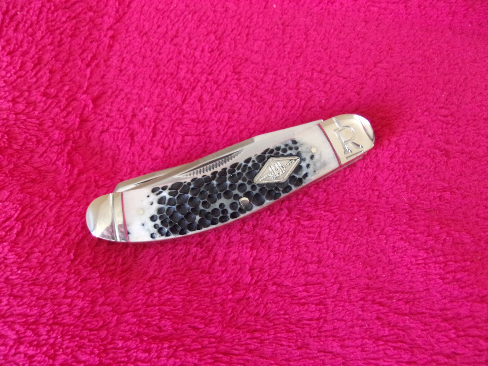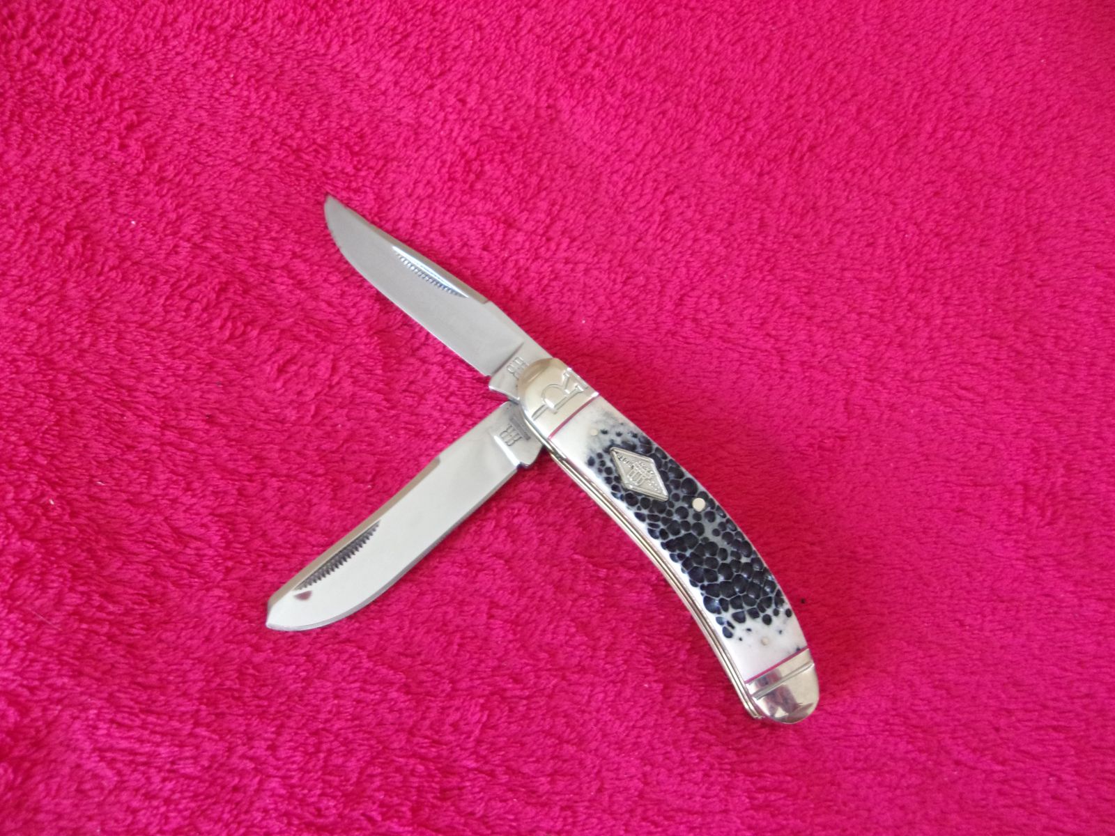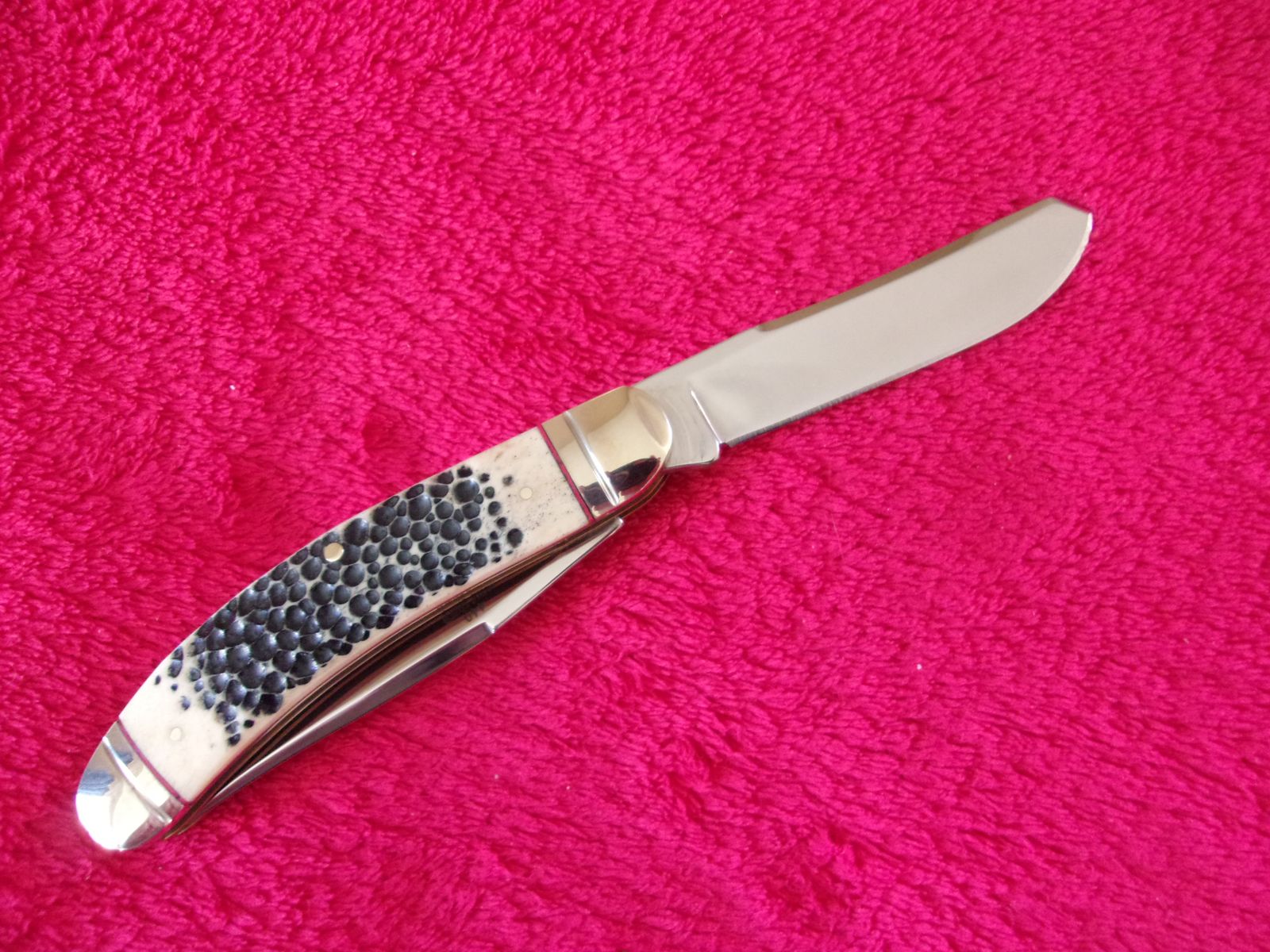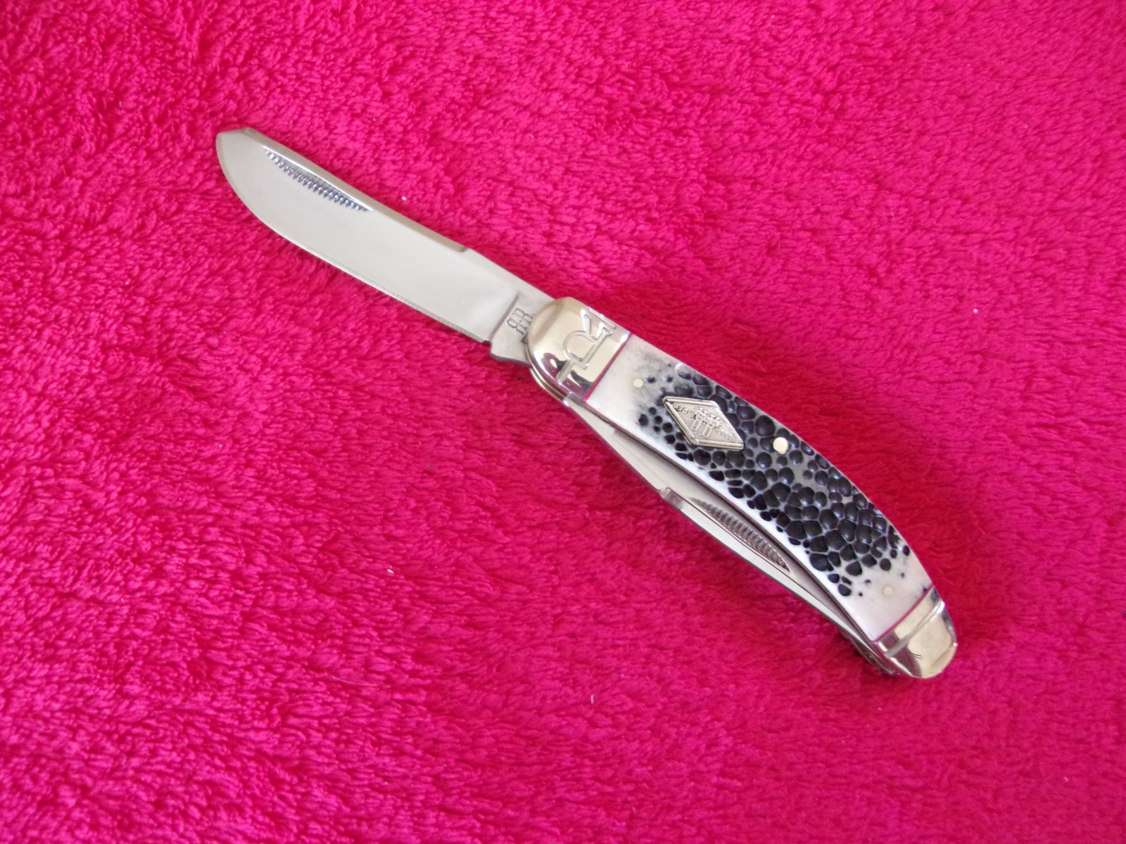 Model - RR1906. Rough Rider 1906 - Sowbelly Trapper Buckshot Bone. 3.75" closed. Stainless clip and Spey blades. Nickel silver bolster(s). Inlay shield. Buckshot bone handle. Boxed.