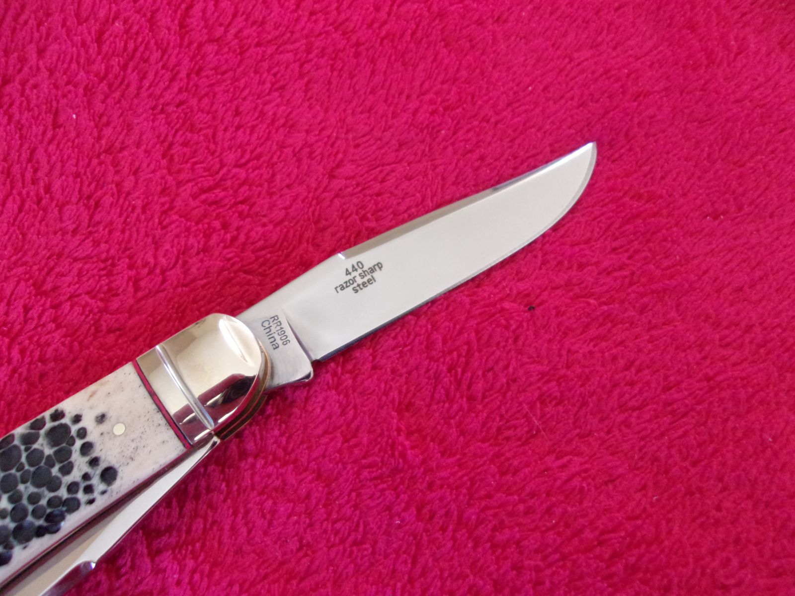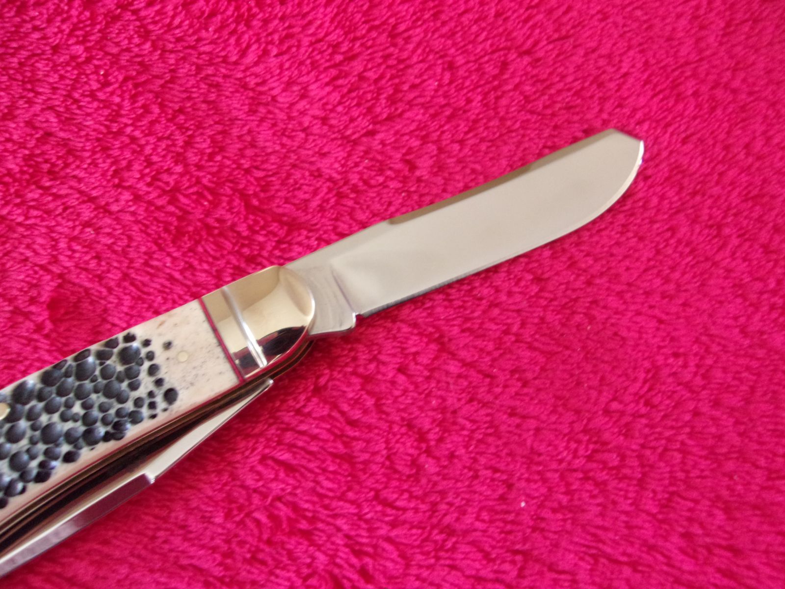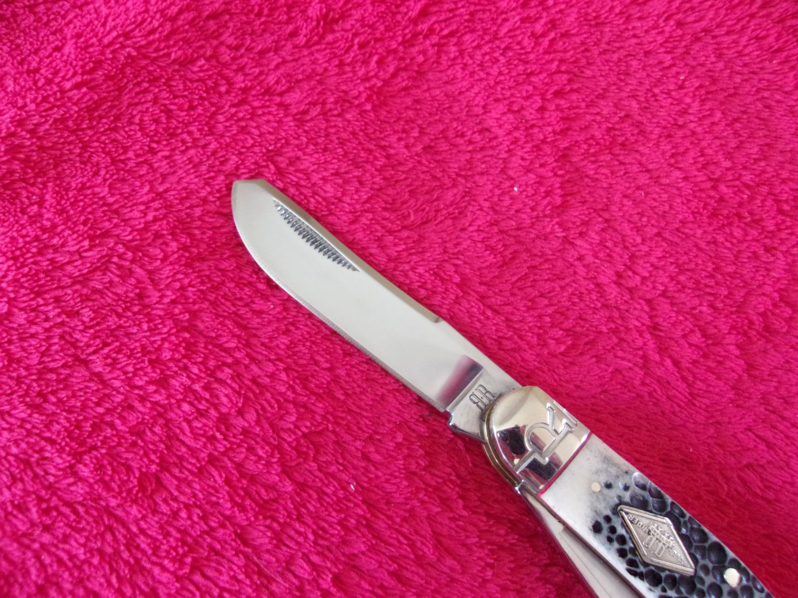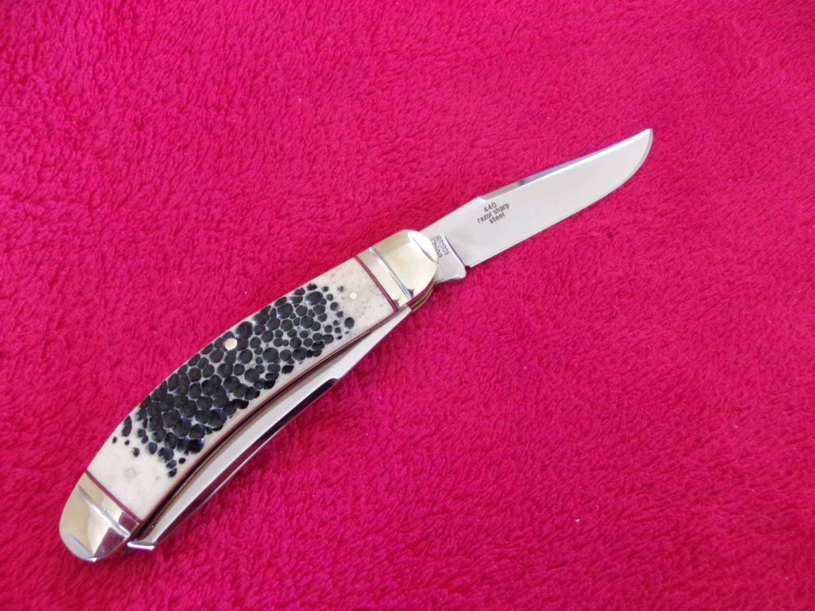 Model - RR1906. Rough Rider 1906 - Sowbelly Trapper Buckshot Bone. 3.75" closed. Stainless clip and Spey blades. Nickel silver bolster(s). Inlay shield. Buckshot bone handle. Boxed.
