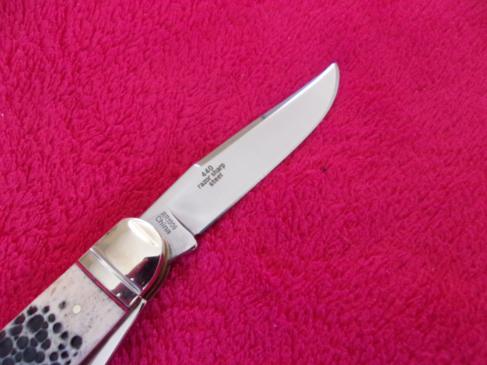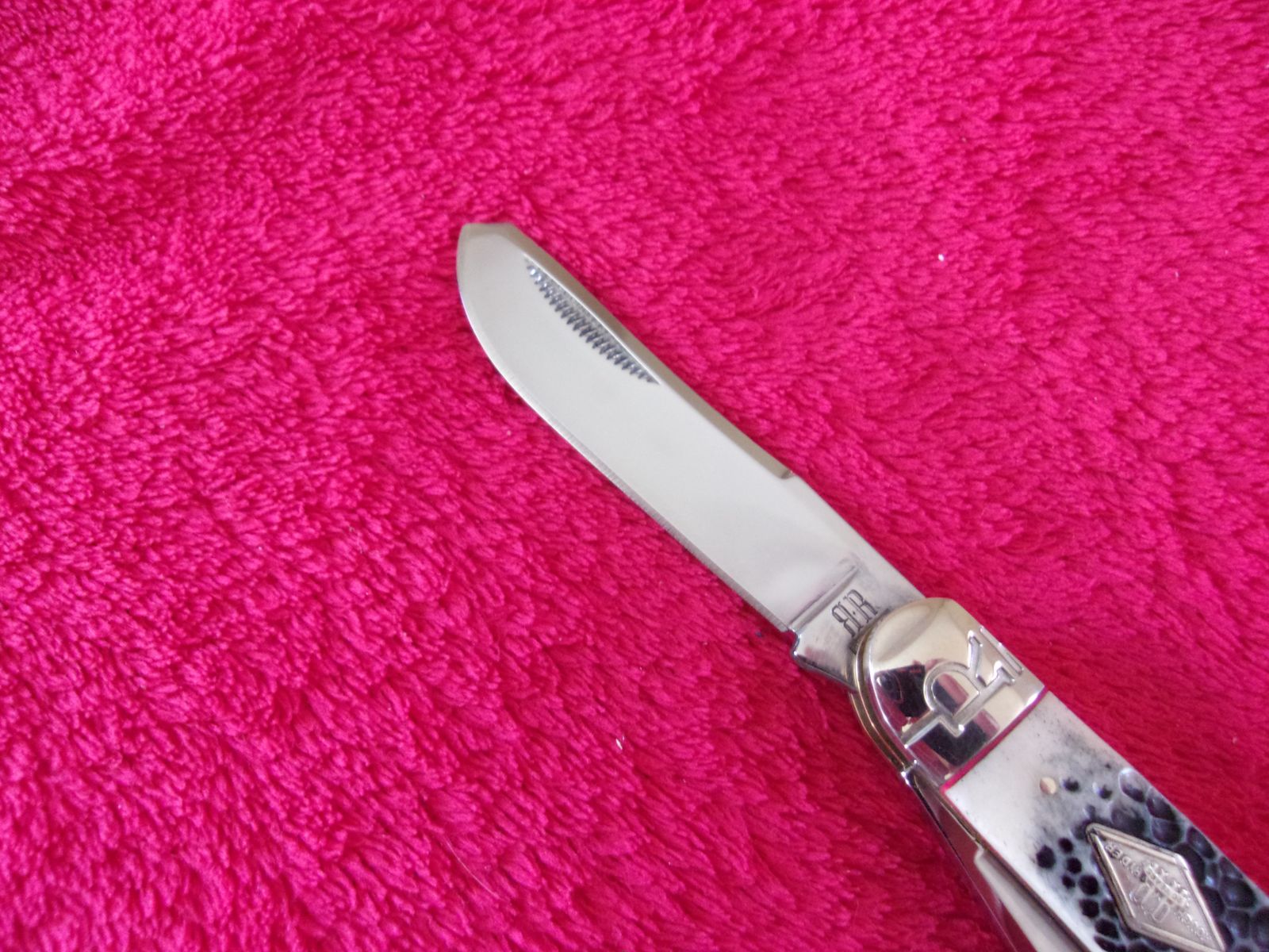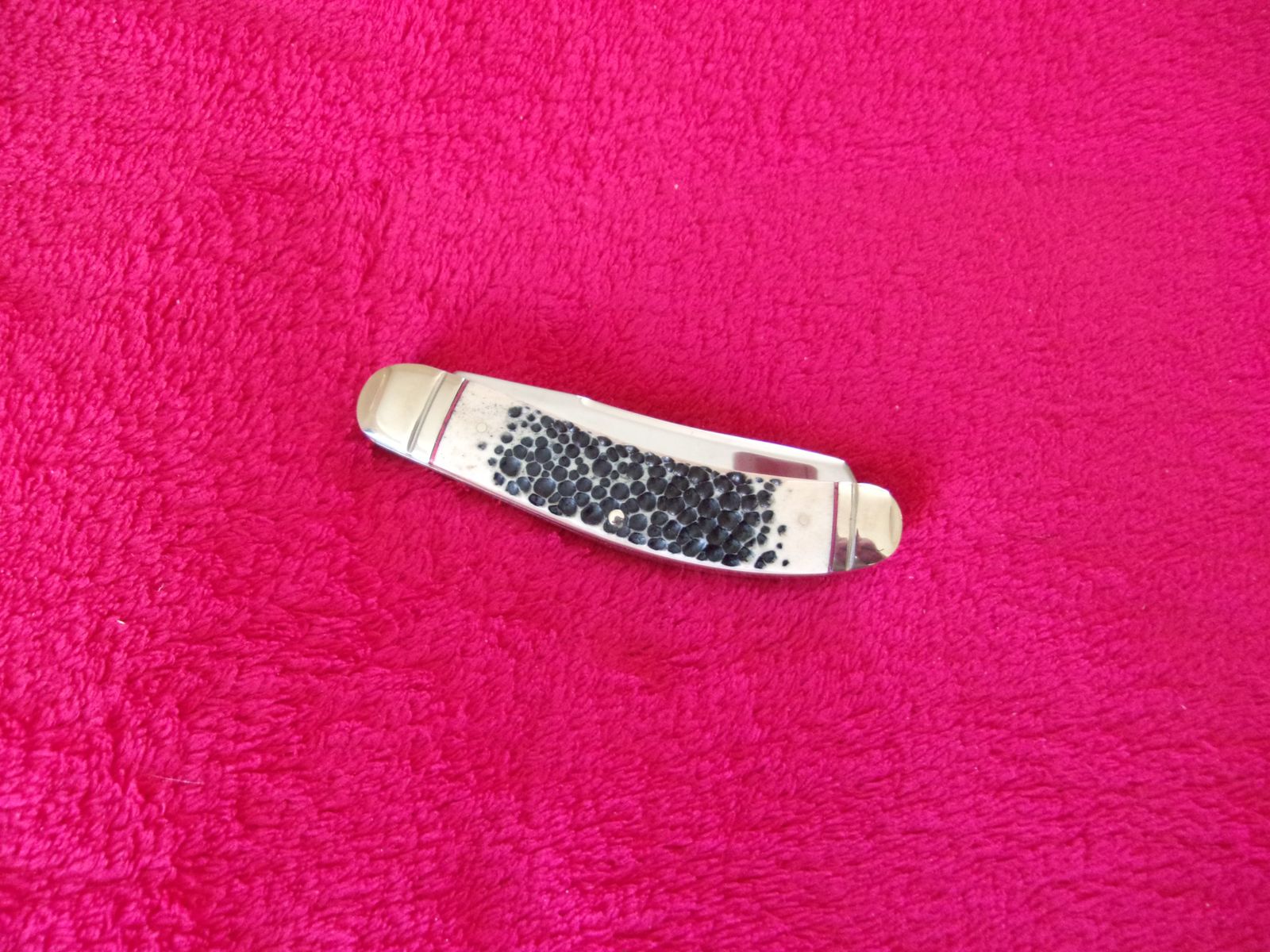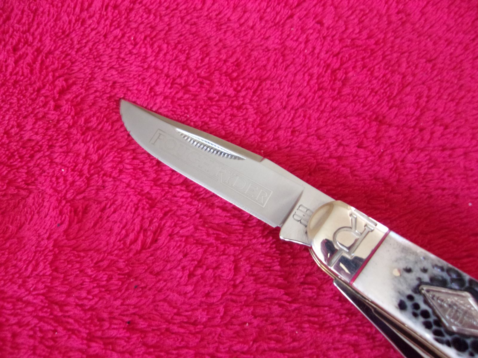 Model - RR1906. Rough Rider 1906 - Sowbelly Trapper Buckshot Bone. 3.75" closed. Stainless clip and Spey blades. Nickel silver bolster(s). Inlay shield. Buckshot bone handle. Boxed.