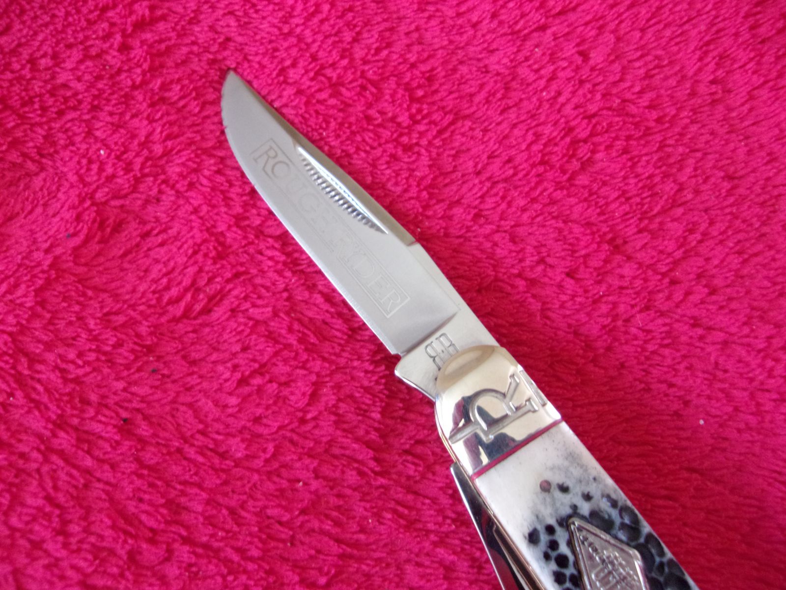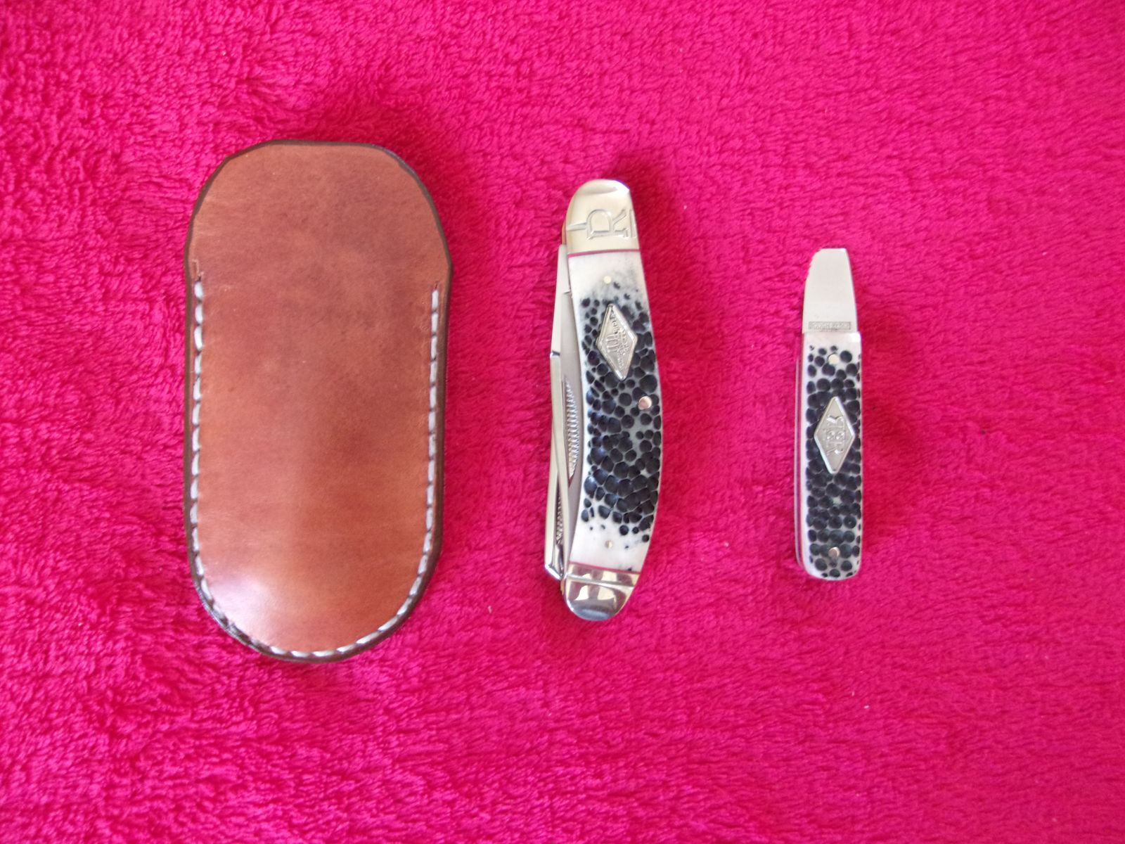 Available out my collection is a Rough Ryder two blade trapper knife with leather pocket pouch and matching blade opener. The knife is new and comes with everything you see in the photo. Below is from the manufacturer.