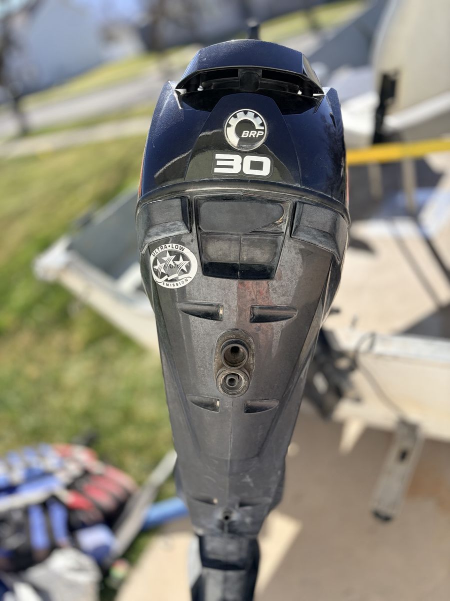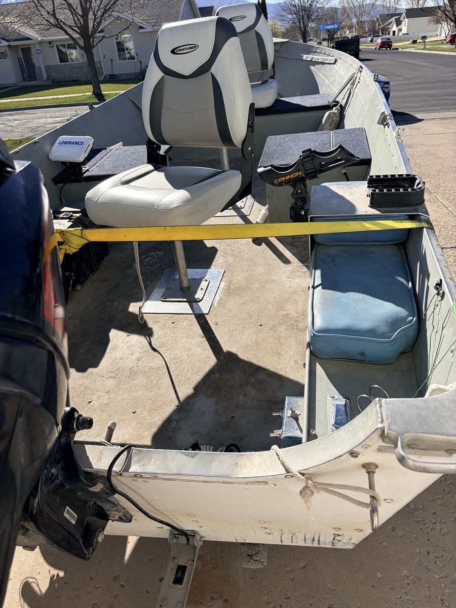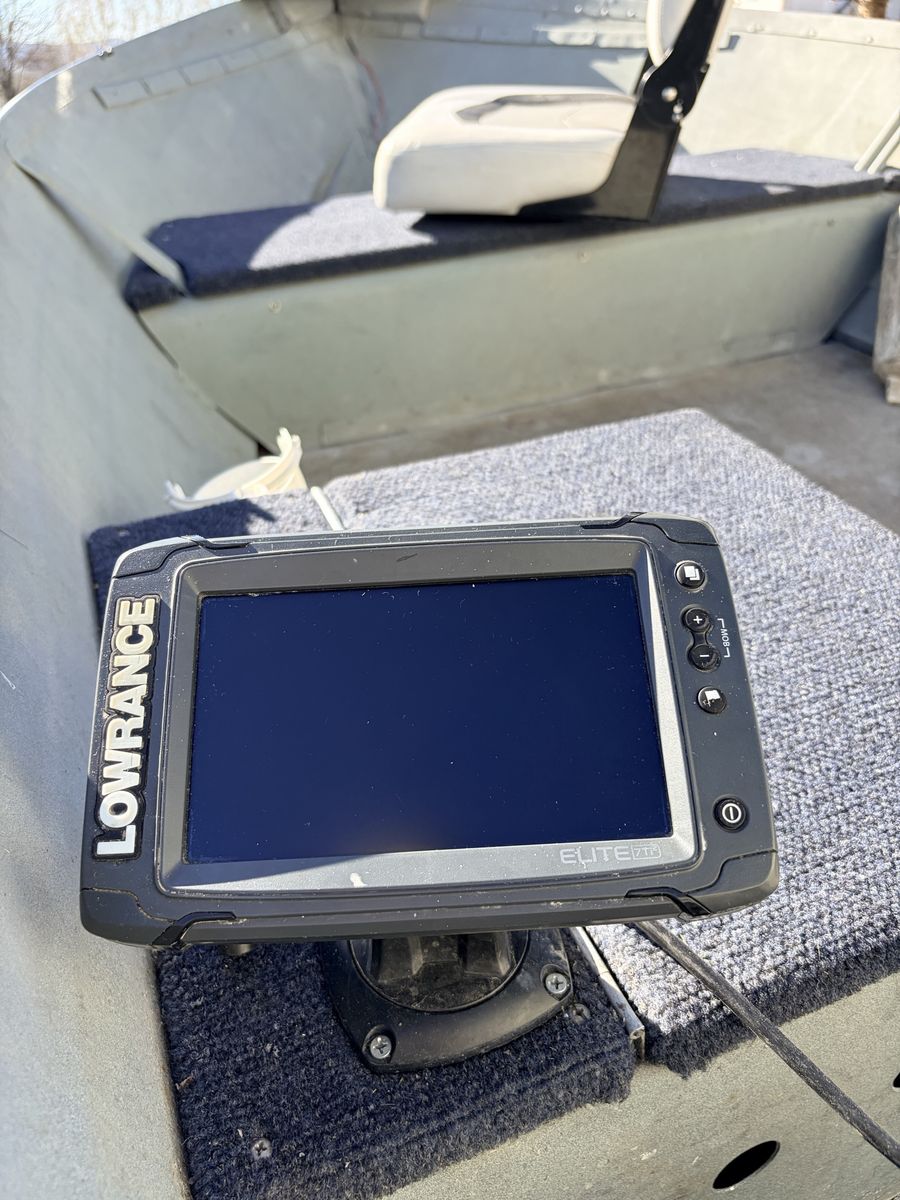 Included: (1) 2016 Evinrude 30 HP E-TEC, 2-cylinder E-TEC Direct Injection motor with power trim and tilt; approx. 150 lb. tiller model, low hours (less than 400), maintained regularly (1) Lowrance Elite-7 Ti (7-inch touchscreen fishfinder/chartplotter featuring built-in CHIRP sonar, DownScan Imaging, and StructureScan HD) (2) Canon downriggers with balls and accessories (3) Canon pole holders (2) Adult lifejackets (1) Safety floatation pad (1) Paddle (1) Bimini top (1) Calkins single axle trailer, 2” hitch