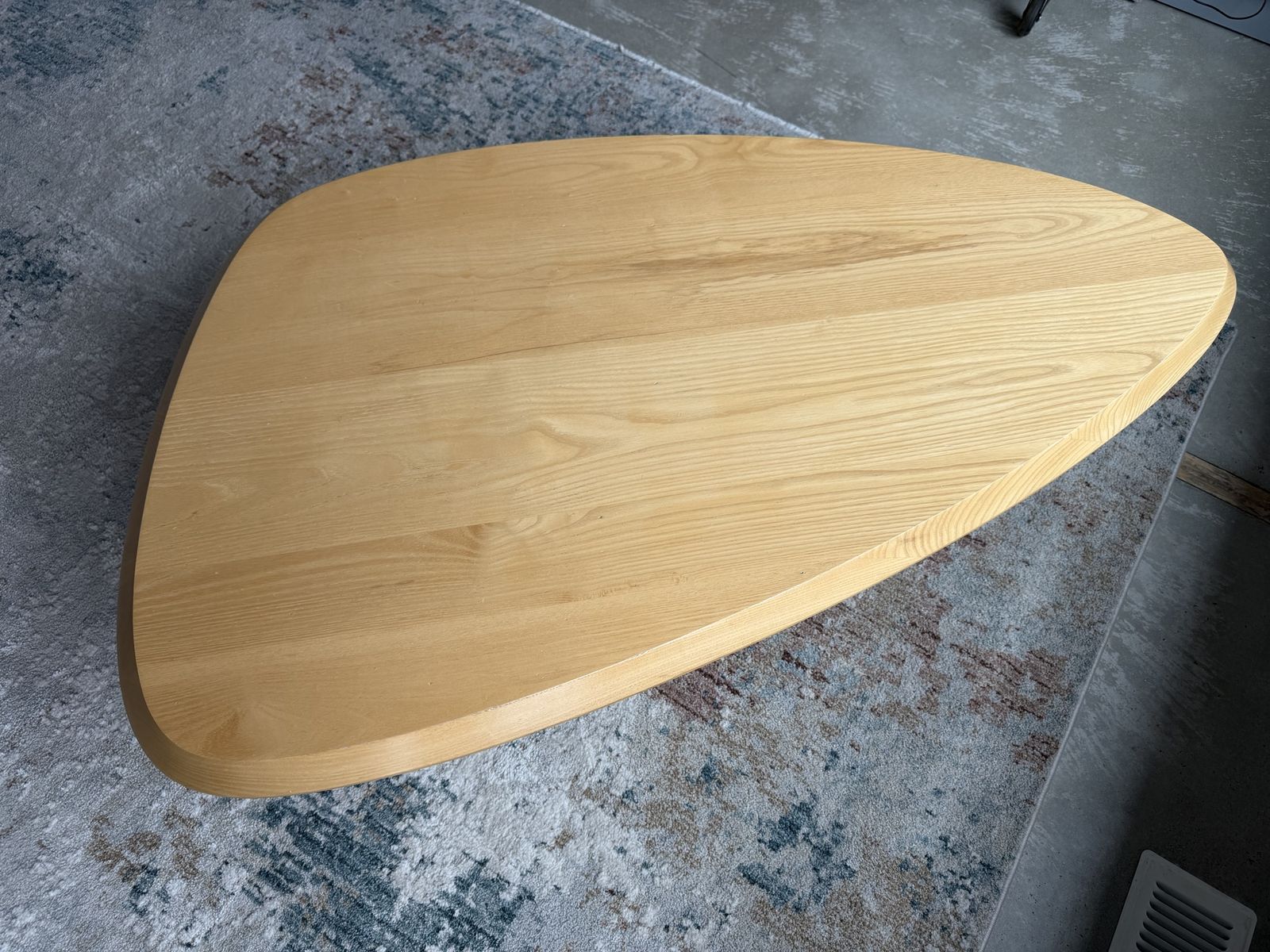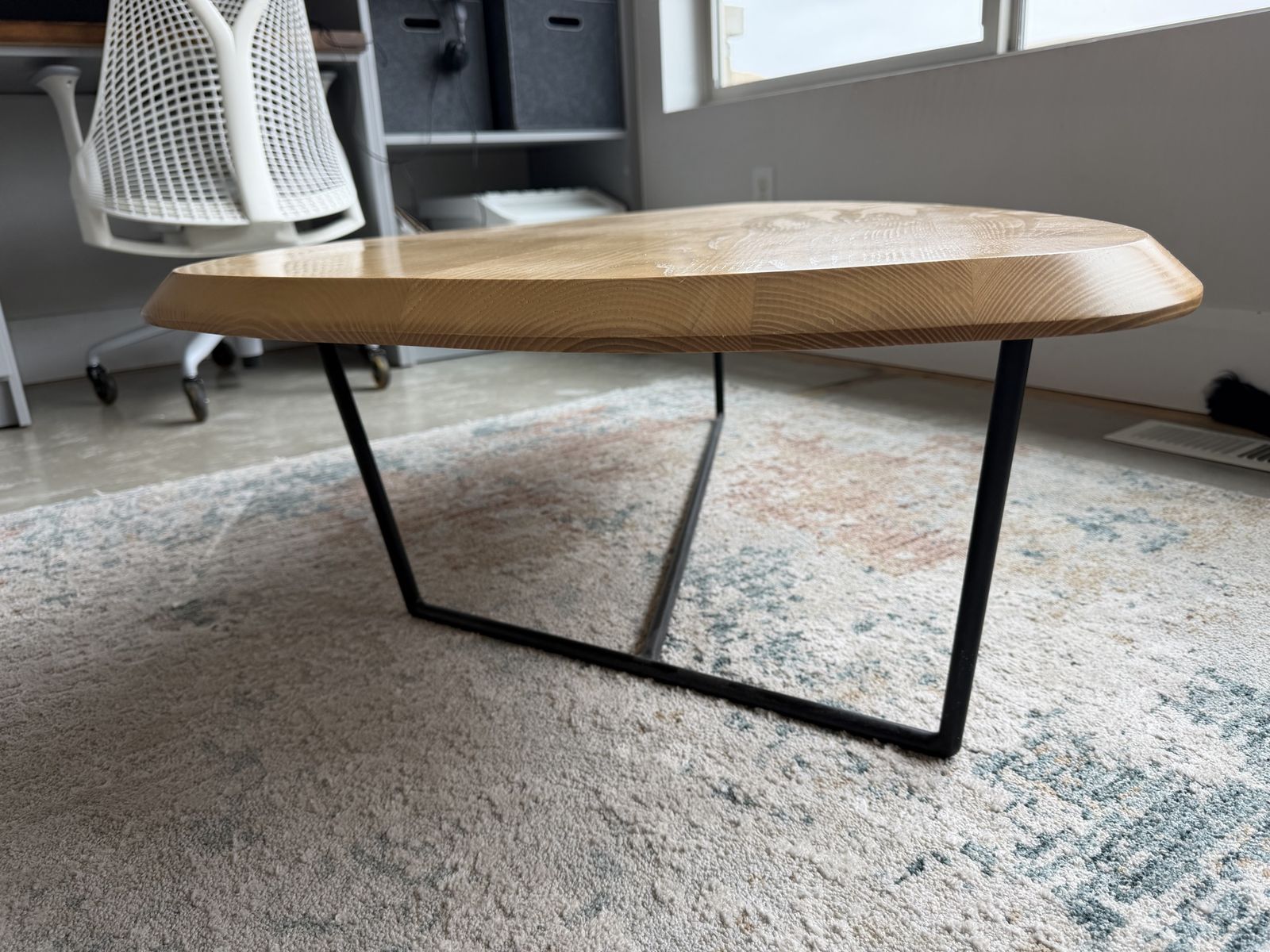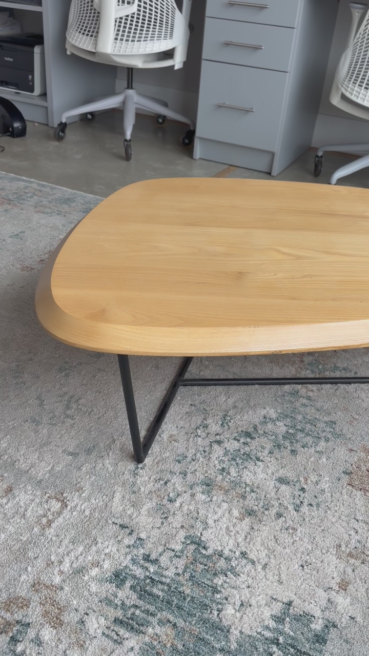 ApplePayBeautiful mid-century modern wood coffee table with black metal legs.