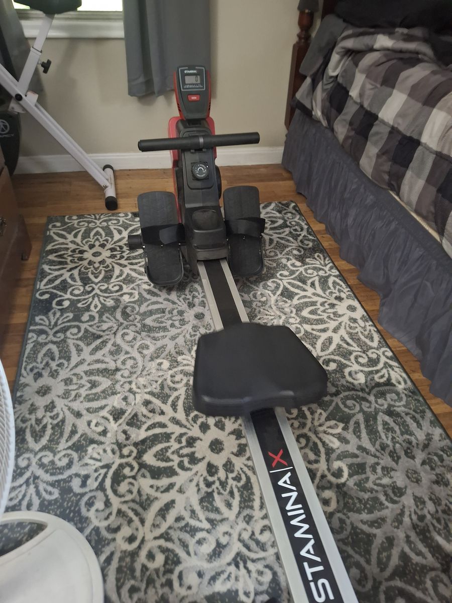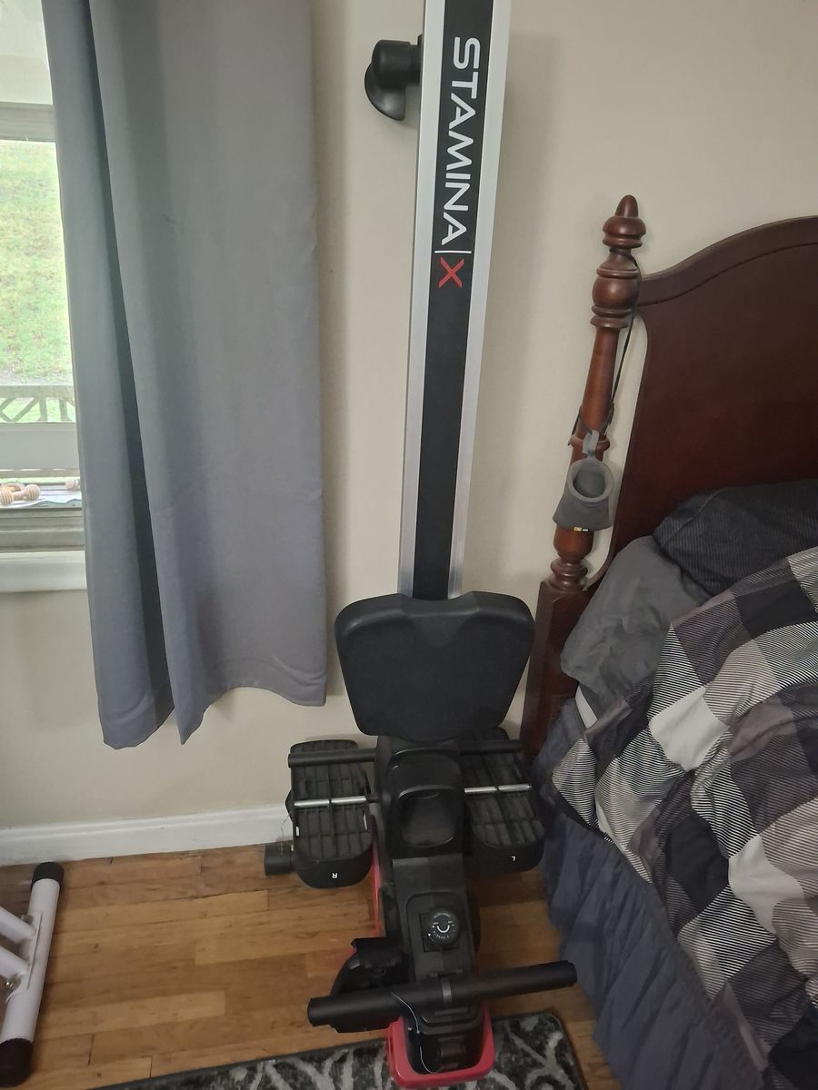 PayPalStamina X rowing machine. Very little use and still in great condition. Has wheels for easy movement, and stores against the wall for small footprint. Dial magnetic resistance