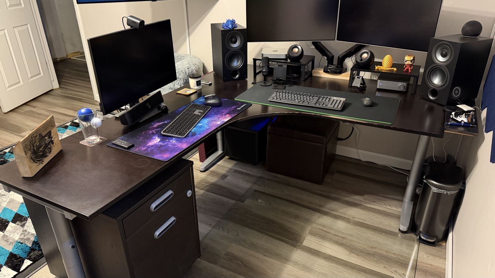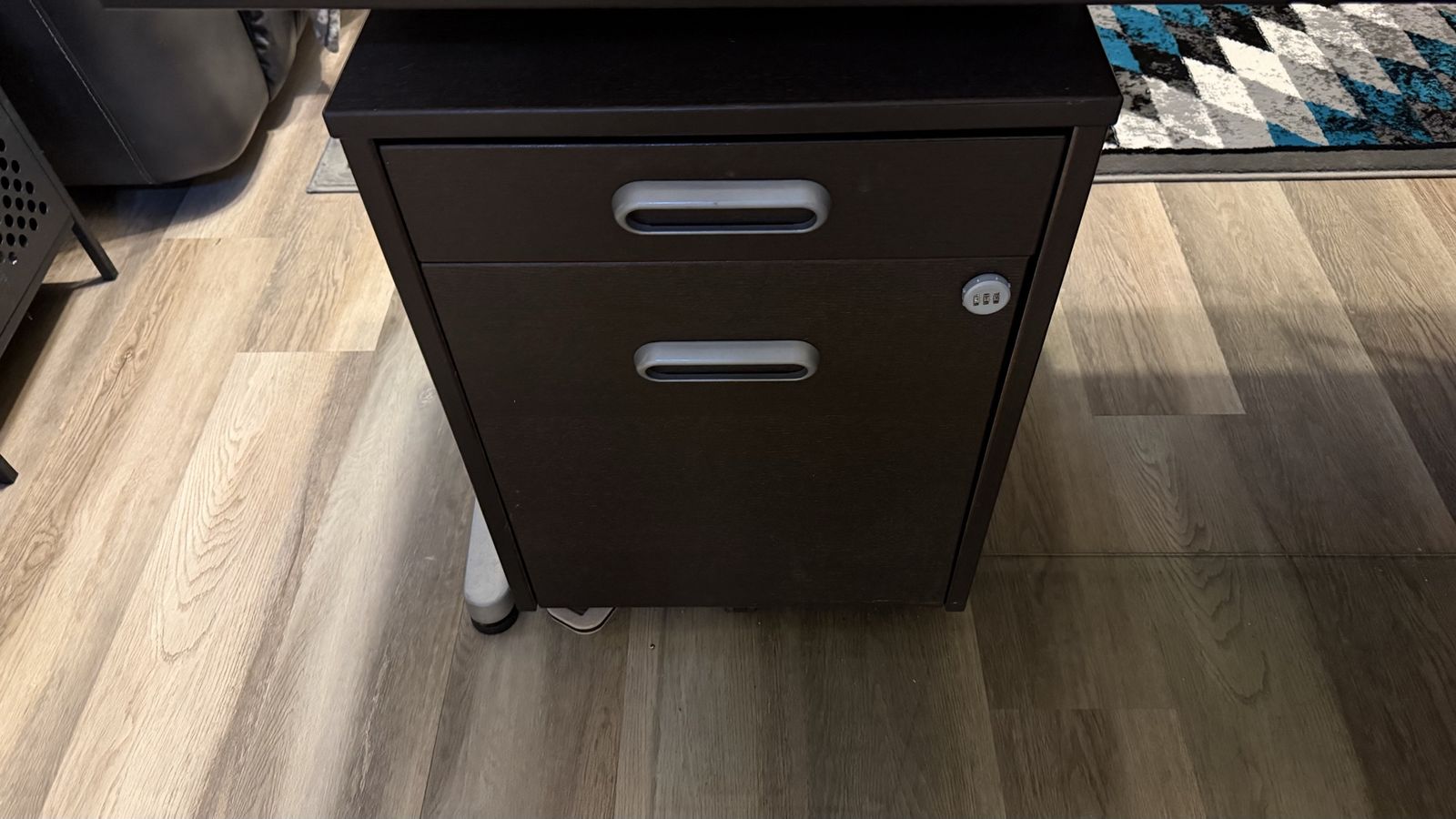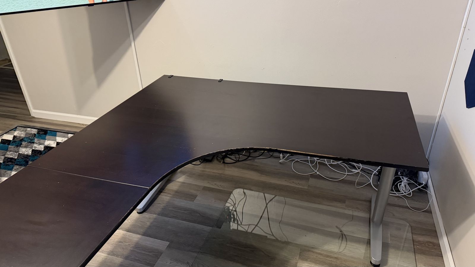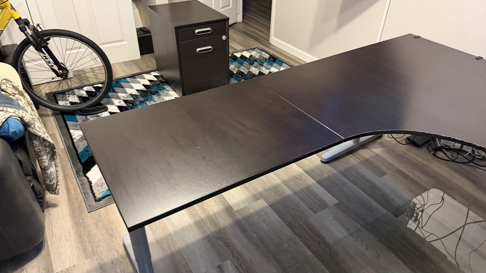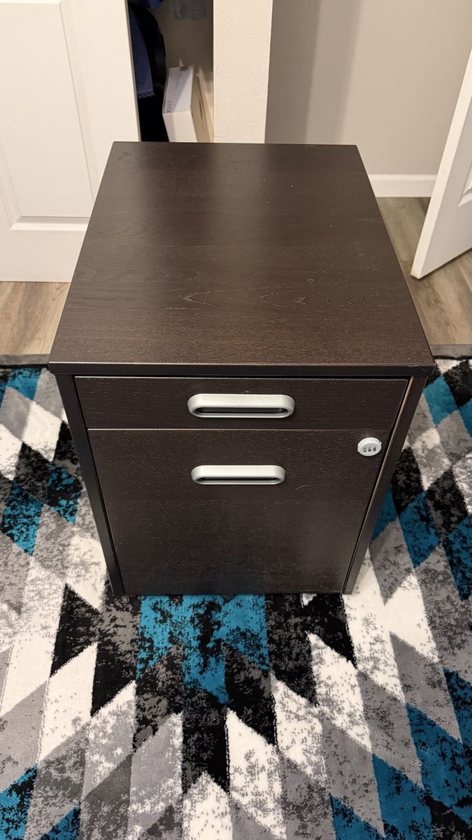 VenmoIkea l-shaped desk in good condition. Left side width 78 3/4 depth 23 1/2 Right side width 63 depth 30 1/2 Matching locking file cabinet in good condition. Width 18 depth 24 1/4