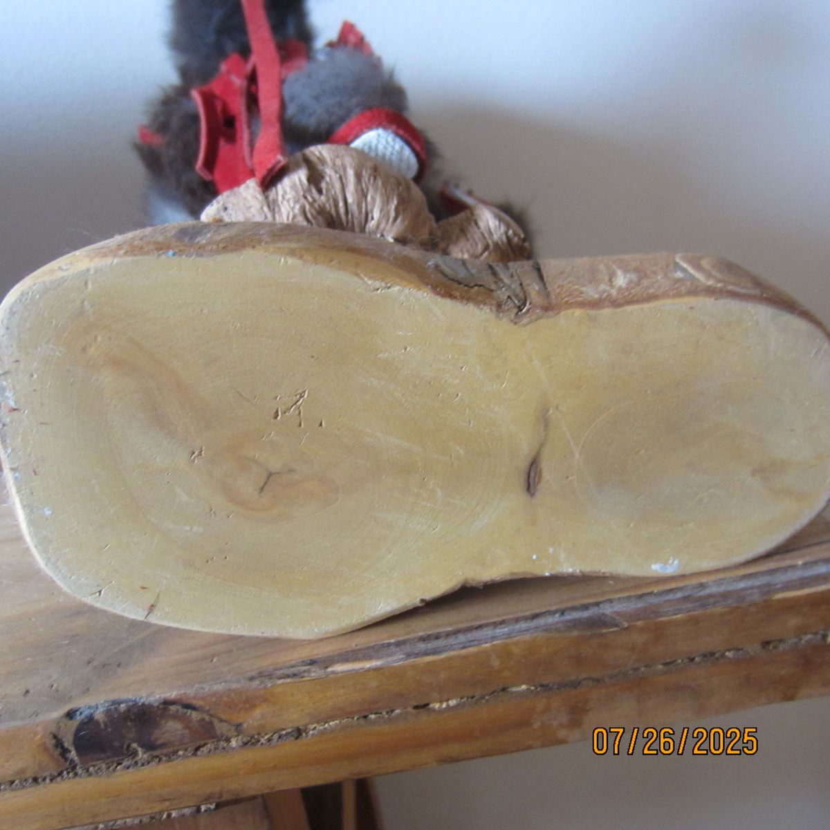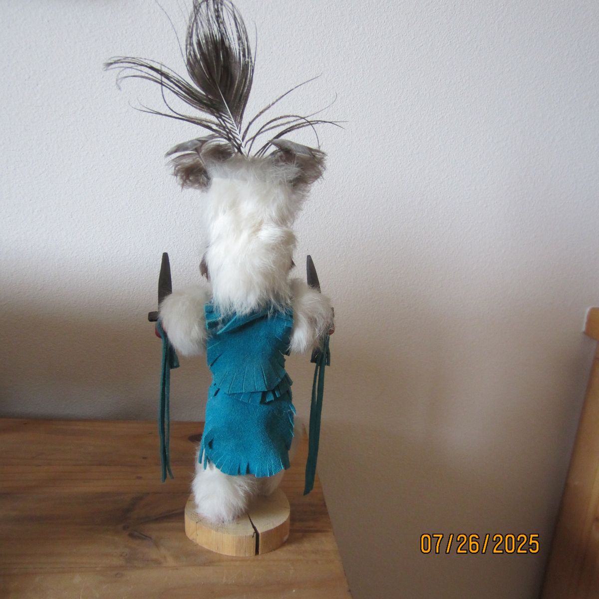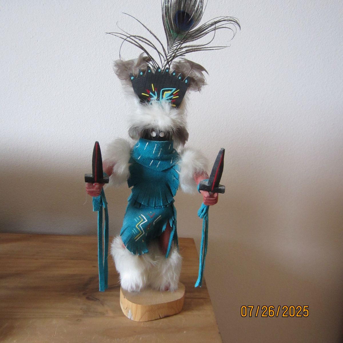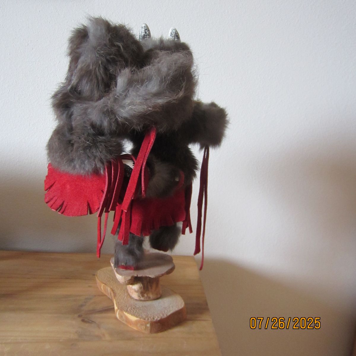 These are a mixture of Navajo and Apache handmade Kachina Dolls that stand approximately 15" to 16" tall each. Two of them are signed with the artist's name, the name of the doll and the serial number. They are priced as following: The bear and bear cub in gray and red is $100.00. The second named "Sunface" and the third being Apache are both $85.00 EACH.