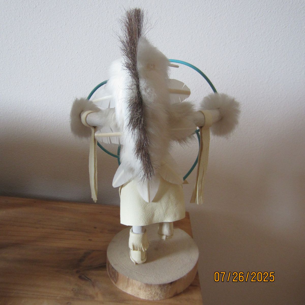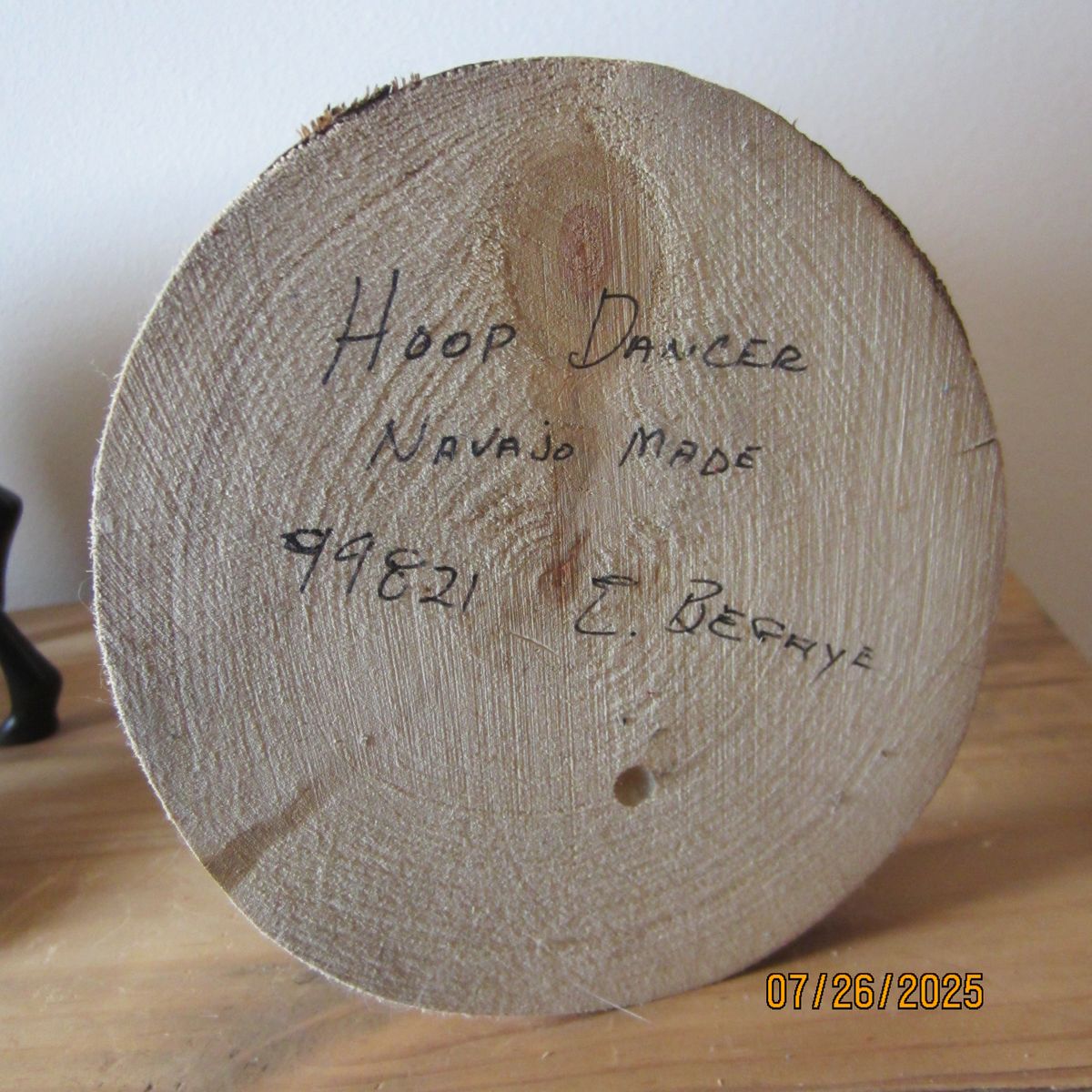 The handmade Navajo Hoop Dancer Doll is approximately 14" tall and is sign by the artist on the bottom of the doll along with the artist and serial number. It is over 20 years old and is selling for $80.00.