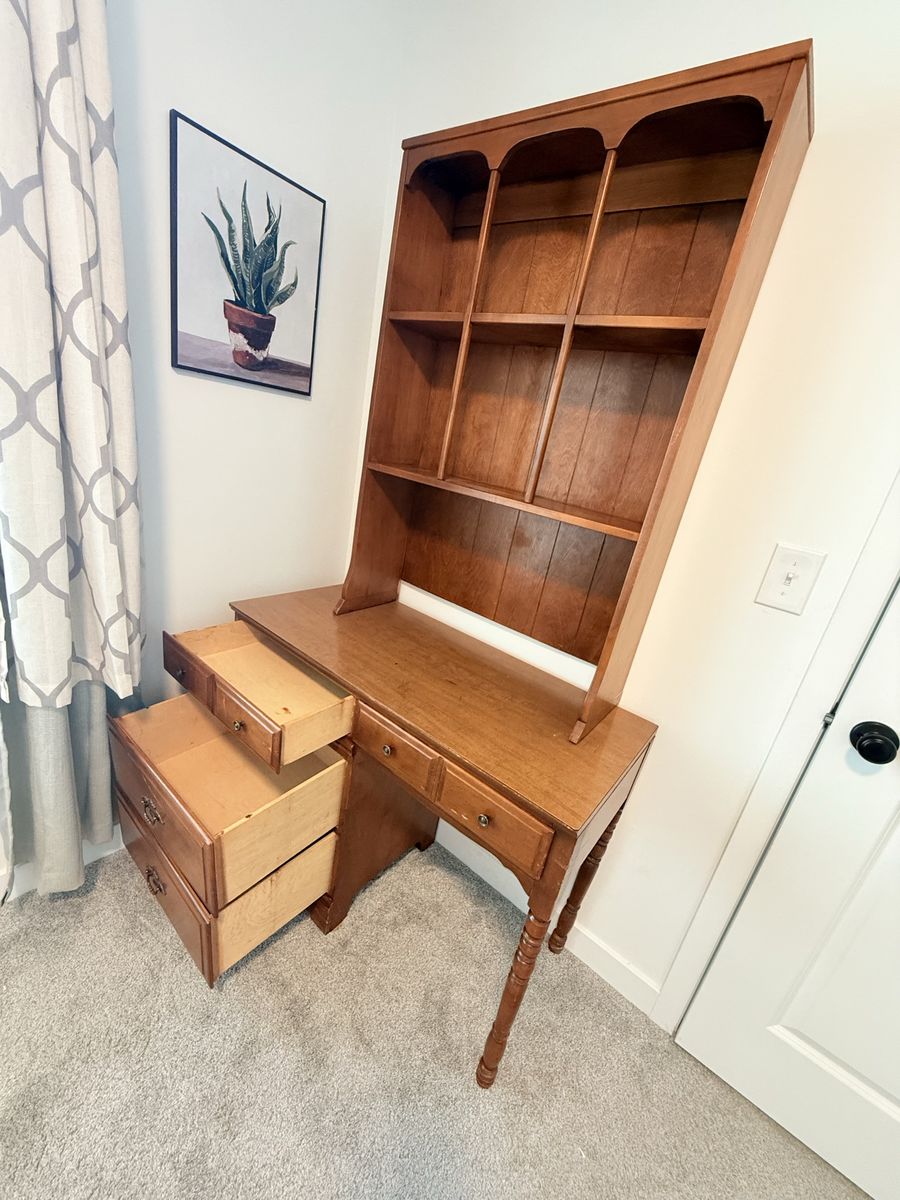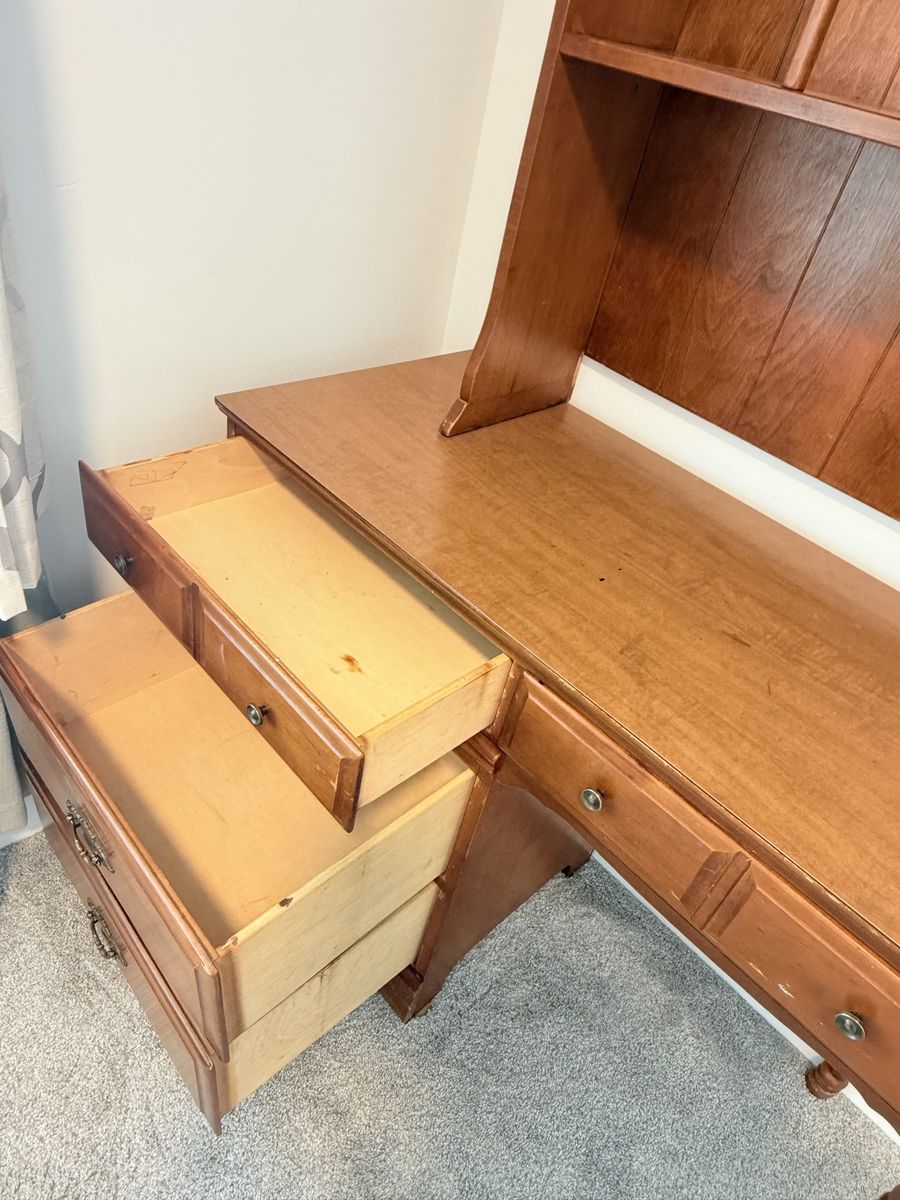 One of the best things about it is the drawer space — they’re deep and actually useful, not like newer desks. You can fit a lot in them (books, papers, craft supplies, etc.) and keep everything organized.