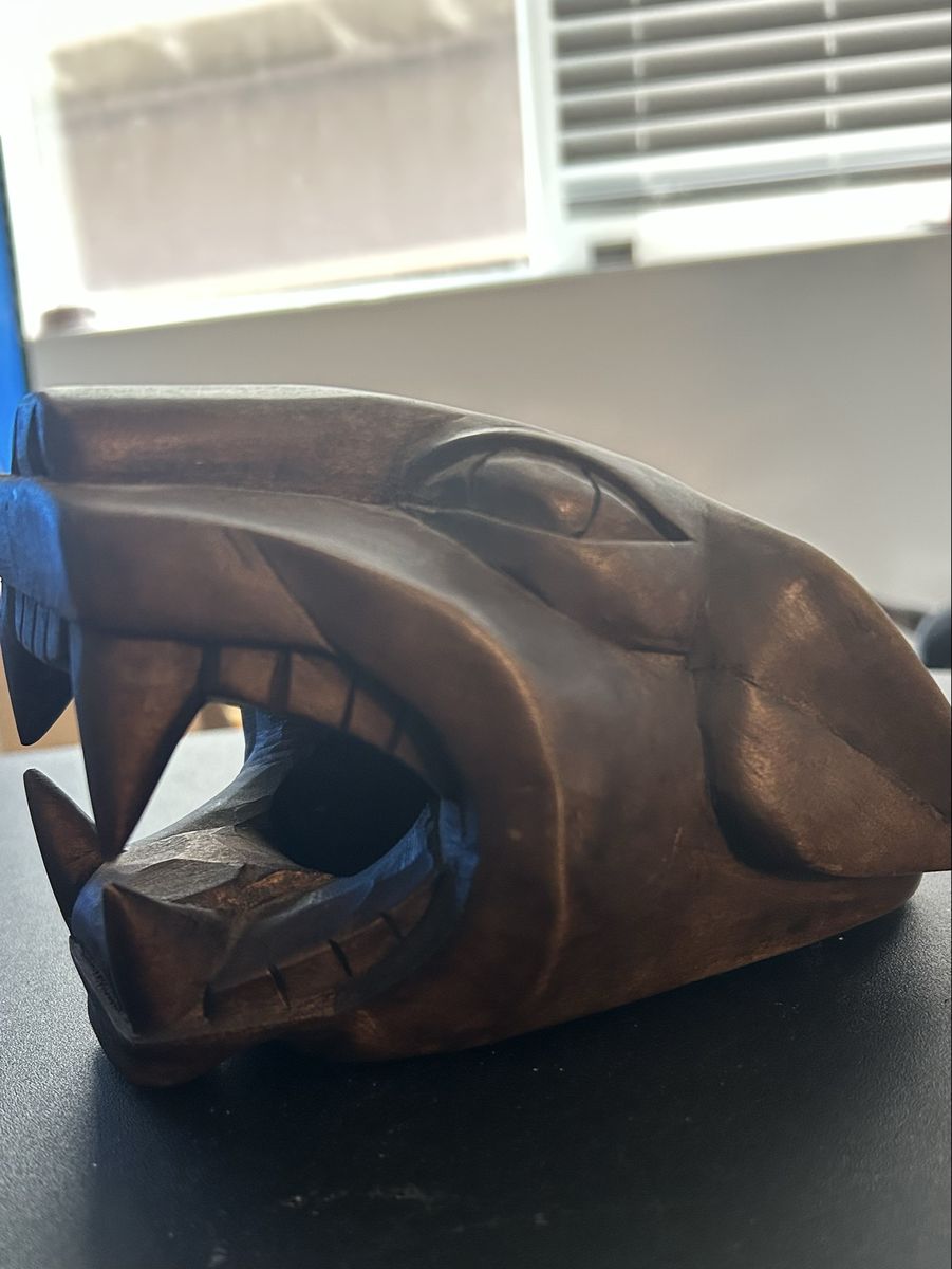 ApplePayThis item is a vintage hand-carved wooden jaguar or black panther head sculpture, often classified as Mexican or Mayan folk art. Material: Typically carved from a single solid piece of dark exotic hardwood. Design: Features an open mouth with visible teeth and sharp fangs, portraying a roaring or aggressive expression. Purpose: Primarily used as a decorative home accent or figurine. Origin: Frequently made by indigenous artisans in regions formerly part of the Mayan empire.