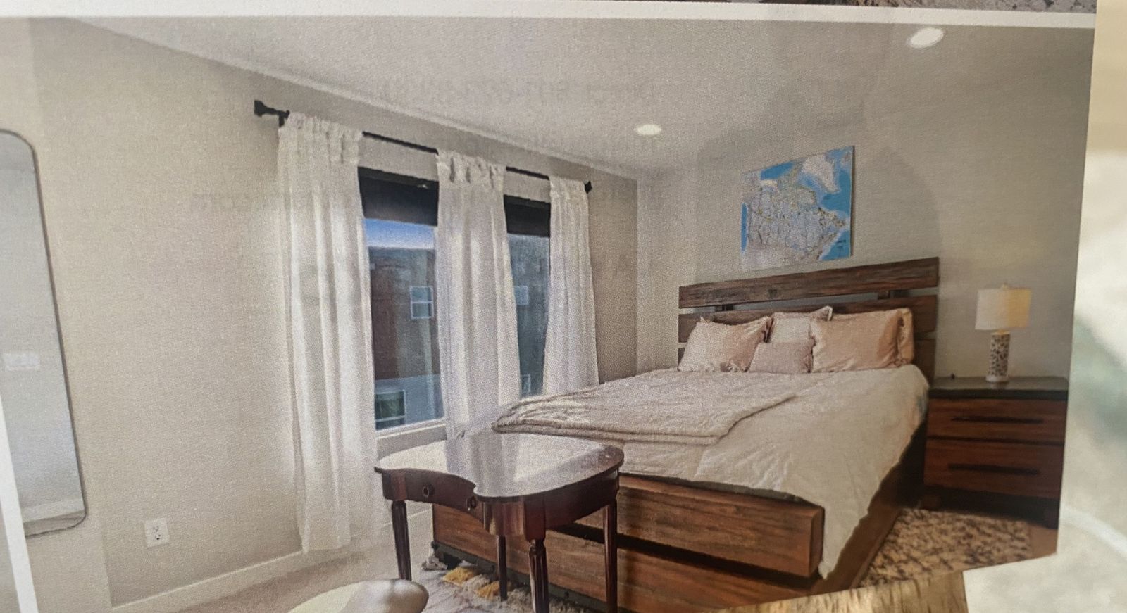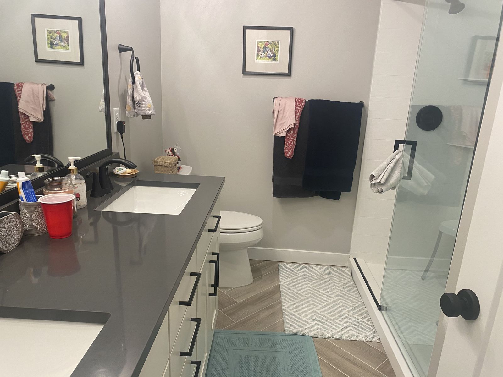 Step into the full bathroom just outside your bedroom, bathroom is private and closed off, where you'll find a delightful shower double sink vanity with ample storage space, and a mirror that reflects the thoughtfully designed space.