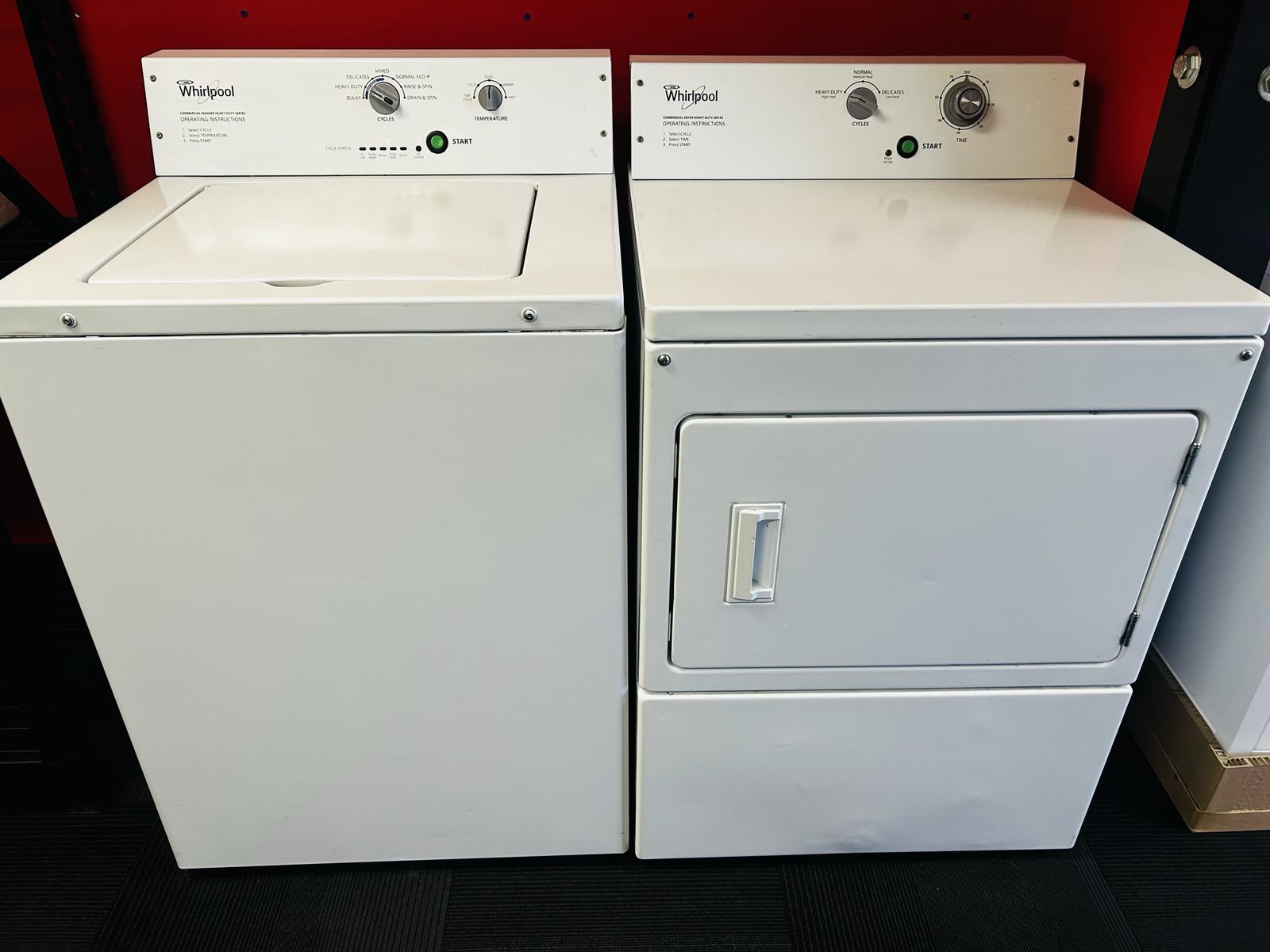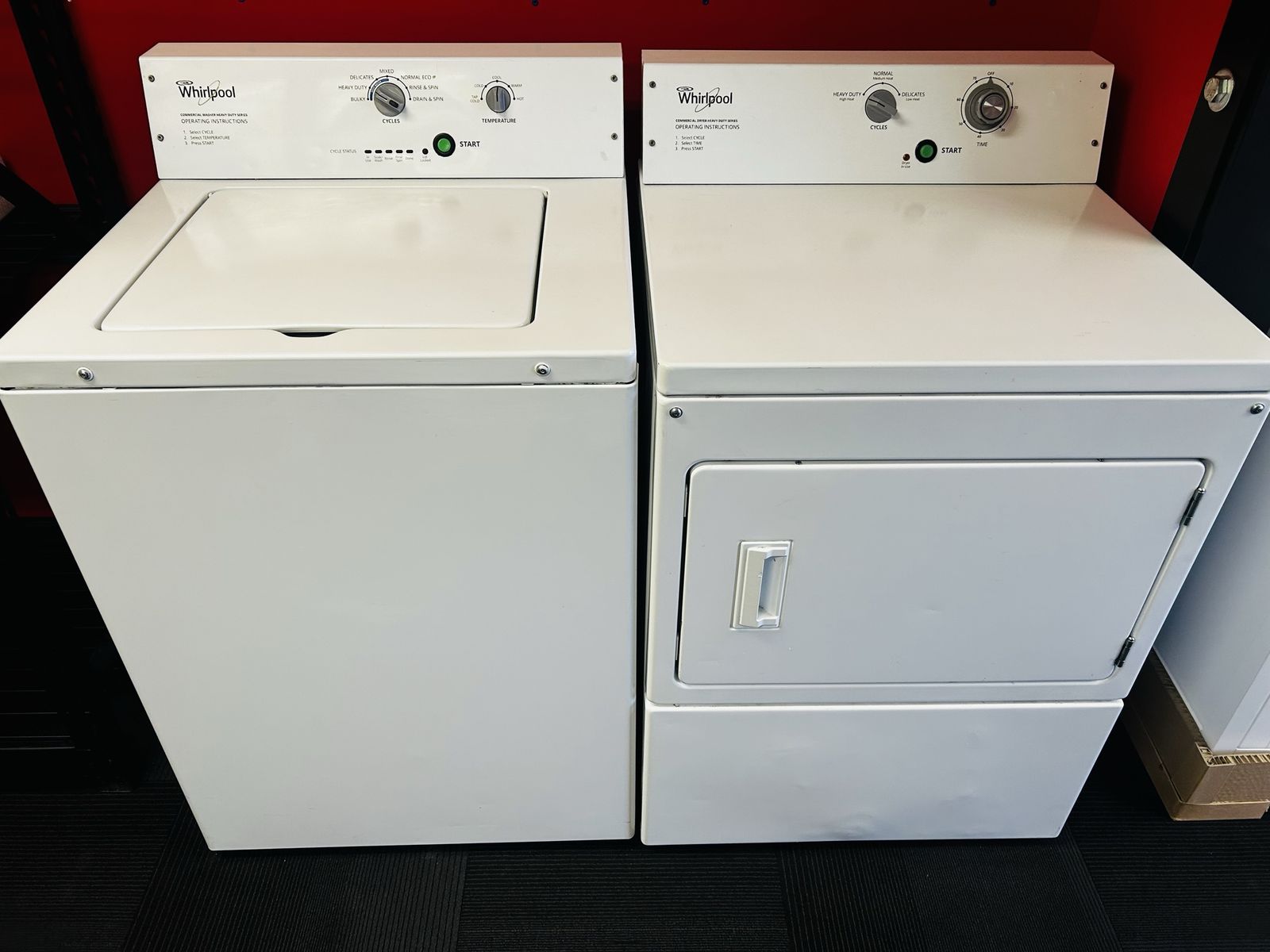 Whirlpool commercial heavy duty series washer bulky delicates mixed normal eco rinse and spin drain and spin etc..Whirlpool commercial heavy duty series electric dryer high heat normal medium heat delicate low heat time dry etc..They work great, clean, 45 day warranty, delivery/install available.
