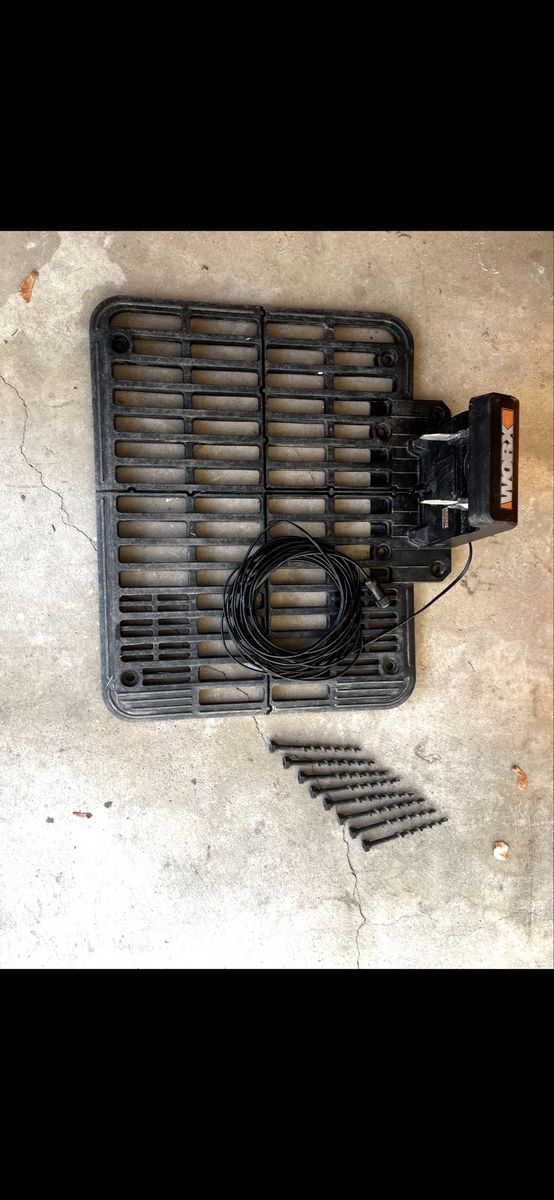 Runs like new used for two years, very clean, no hassle once you set it up. Set it and watch it go. Will turn off and go back to house if rain. No raking. Makes mowing so easy. There is a computer control panel located on top of the Robot with identified computer buttons to operate the Robot powered by a 20V battery mounted in the rear compartment. The underside housing of the Robot contains a circular wheel with three sharp cutting blades to mow the lawn. The orange colored contoured body is made of tough cast metal. The two front round shaped hard black material wheels independently rotate 360 degrees allowing the robot to turn in any direction. The two back wheels are made of hard material mounted in a fixed rotating position with “tread” that provides traction as it moves. The back two wheels are operated by the Robot computerized motor and are capable of turning in unison going forward or backward in unison or separately allowing the Robot to automatically move forward, backward, right or left to trim around trees, bushes or flower gardens within the mowing area.