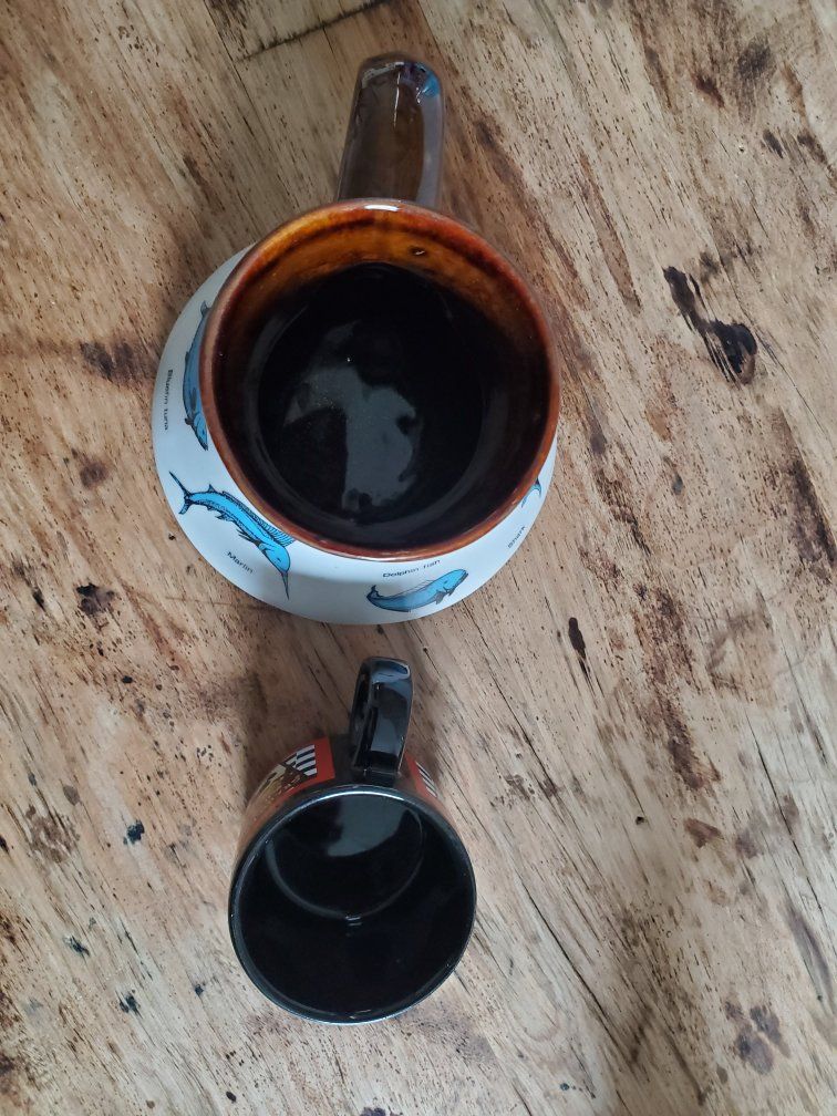 Bearly Surviving Sea Fishing Wide Bottom No Spill Coffee Mug. Made in USA. Enjoy your coffee in style with this Bearly Surviving Sea Fishing Wide Bottom No Spill Coffee Mug. This mug features a beautiful pattern of deep-sea fishes and is made of high-quality porcelain material. The top diameter of the mug is 2.5", while the bottom diameter is 4.5", and it stands at a height of 4". Perfect for all occasions, this multicolor mug is a great addition to your serveware collection. It was manufactured in the United States in 1982 by Bearly Surviving. This mug is a must-have for any fishing enthusiast.