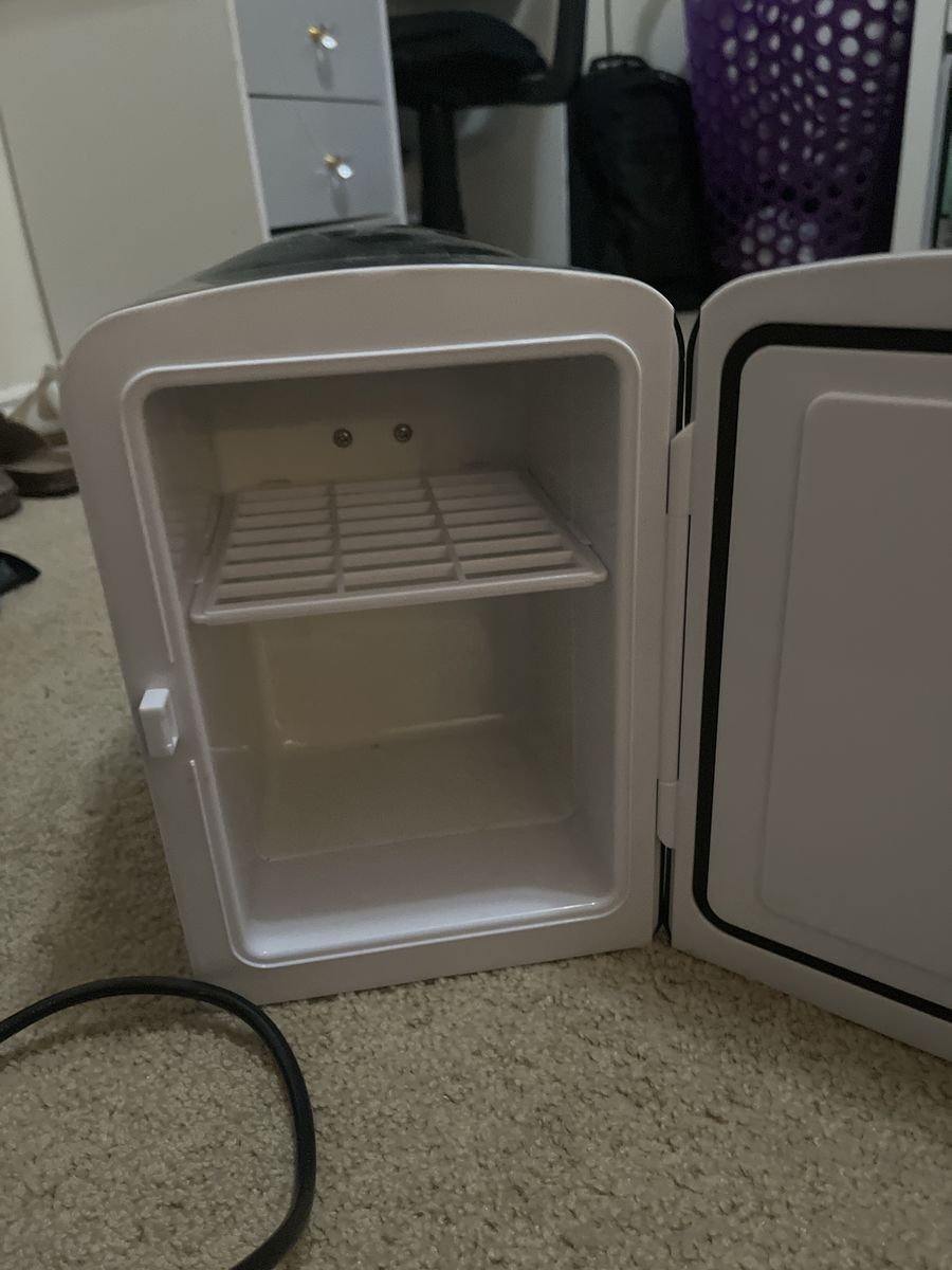 Black mini fridge in good working condition. Perfect for dorm rooms, offices, or small spaces. Compact yet spacious enough for drinks and snacks. Clean, functional, and ready to use. Shelf inside comes out.