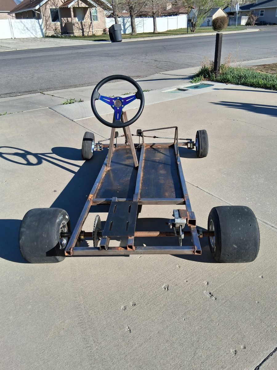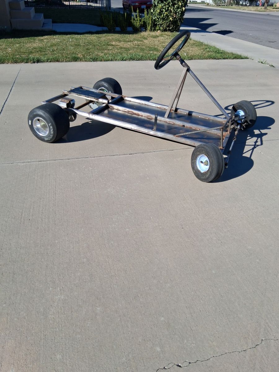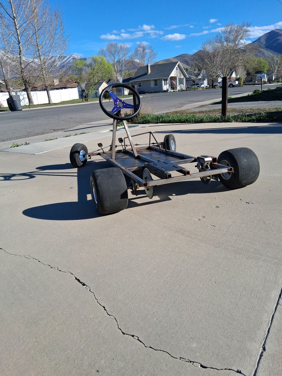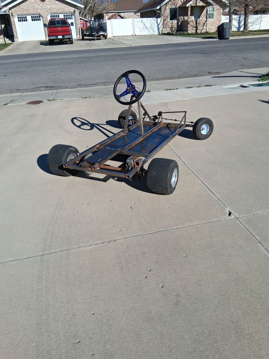 VenmoHomemade go cart frame with rubber slicks on the back for drifting. This thing has been a lot of fun to drive. My friend and I worked on this for a small prodject and it was a blast. It has a slightly hard time turning on asphalt because the back tires get too much grip. But when it is on grass, dirt, or gravel it rips. The back tires slowly deflate after a little bit because they have been sitting outside for a while. If you do a couple burnouts it will seel up the micro cracks and you will be fine. The front tires are off the bead and are a little worn out and will need replacing in the future. Little bits of rust on the body. Has a disk brake on the back axil, just needs to be connected to one of the peddals. Dementions: 5 ft long, 2 ft wide. Axil width 43 in. How high the steering wheel is fom the frame, 15 in. Types of engines that I know are compatable with the mounting plate: Preditor 212, Briggs and straton.