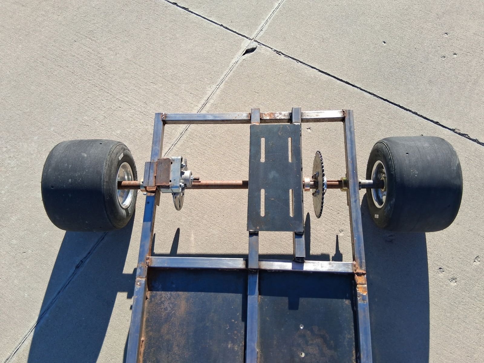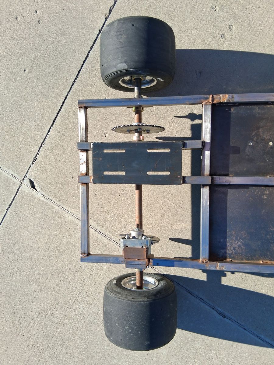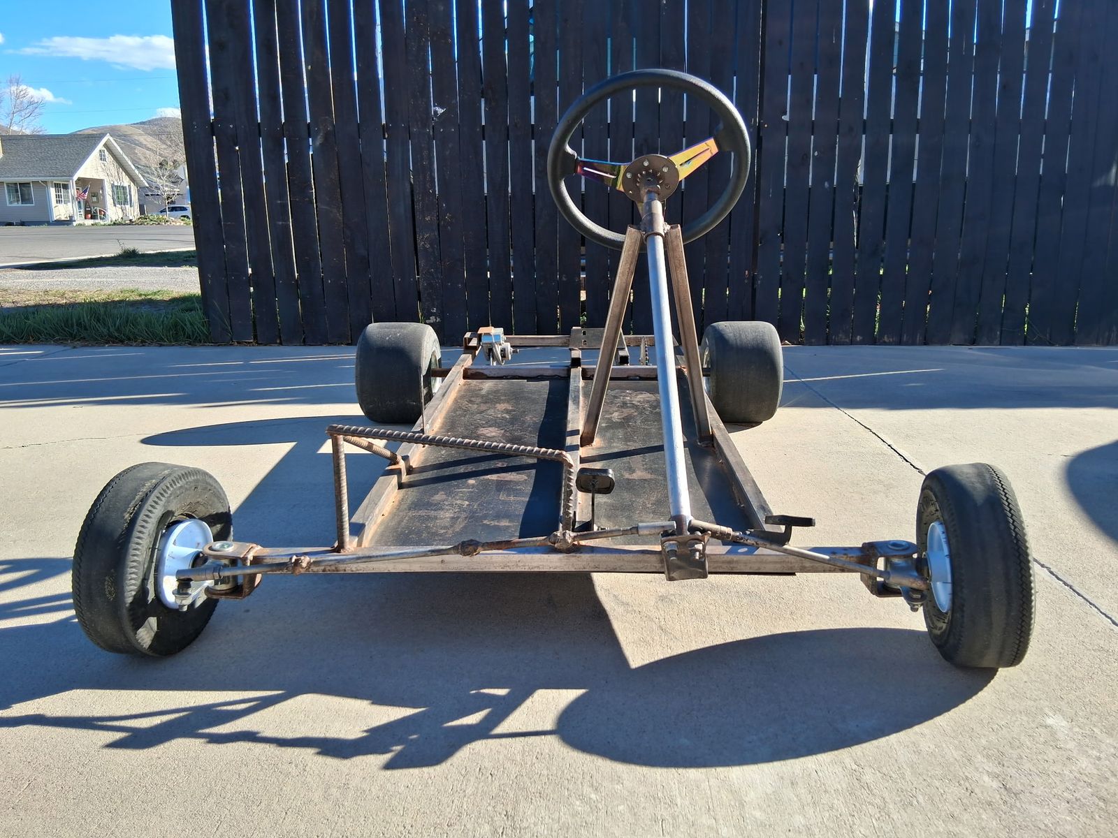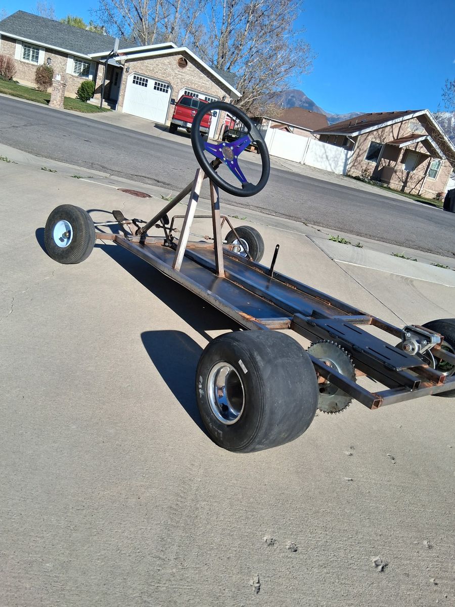 VenmoHomemade go cart frame with rubber slicks on the back for drifting. This thing has been a lot of fun to drive. My friend and I worked on this for a small prodject and it was a blast. It has a slightly hard time turning on asphalt because the back tires get too much grip. But when it is on grass, dirt, or gravel it rips. The back tires slowly deflate after a little bit because they have been sitting outside for a while. If you do a couple burnouts it will seel up the micro cracks and you will be fine. The front tires are off the bead and are a little worn out and will need replacing in the future. Little bits of rust on the body. Has a disk brake on the back axil, just needs to be connected to one of the peddals. Dementions: 5 ft long, 2 ft wide. Axil width 43 in. How high the steering wheel is fom the frame, 15 in. Types of engines that I know are compatable with the mounting plate: Preditor 212, Briggs and straton.