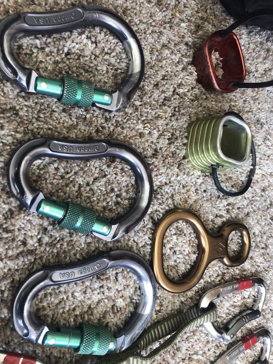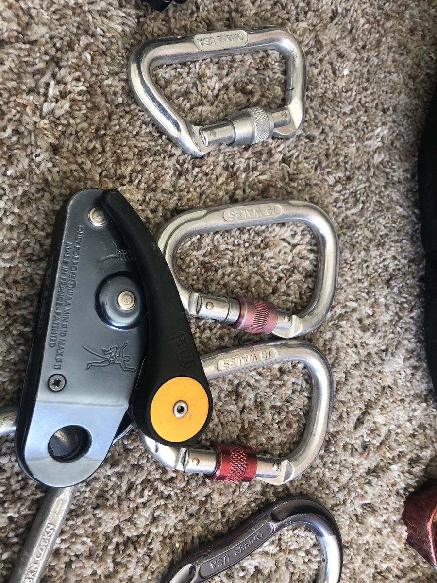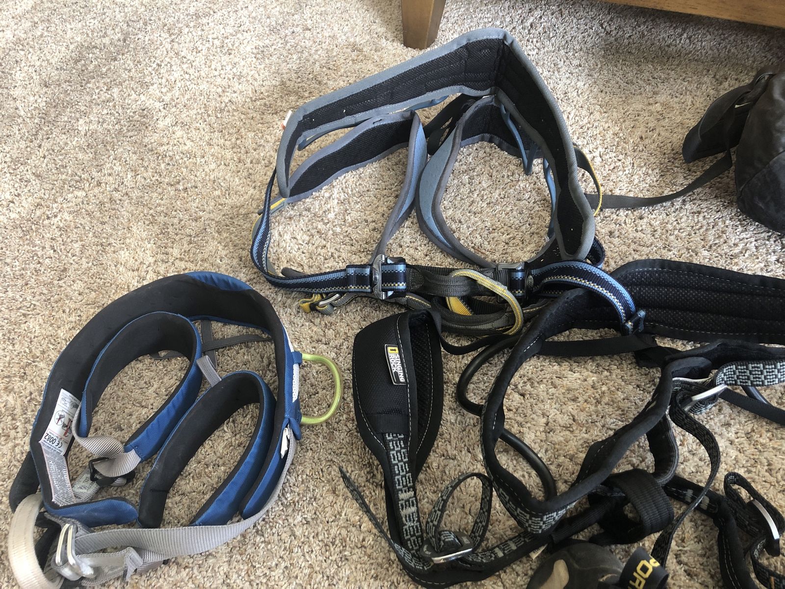 We have 2 adult harnesses and 1 child. 6 lead climbing clips 6 locking carabiner 4 belay devices including 1 Petzl grigri 2 chalk bags 1 rope bag and rope(should be retired soon) two La sportive shoes. Size 13 and 7 in men’s. I’m looking to sale as a lot feel free to call or text