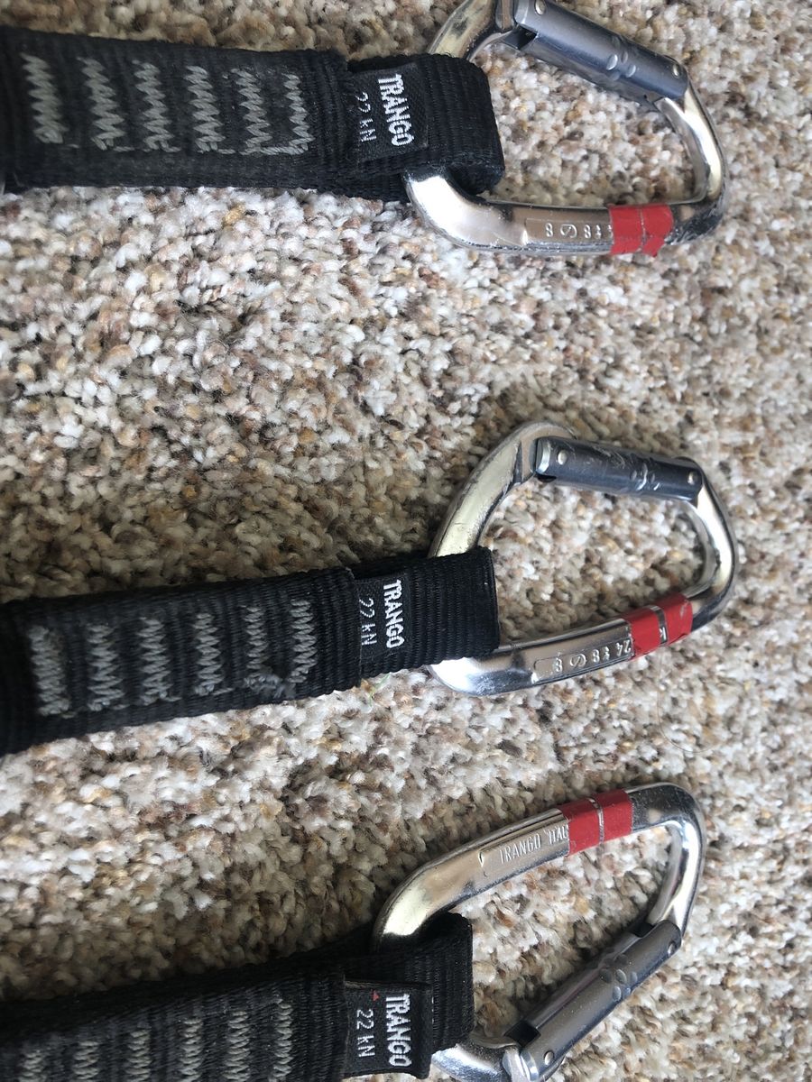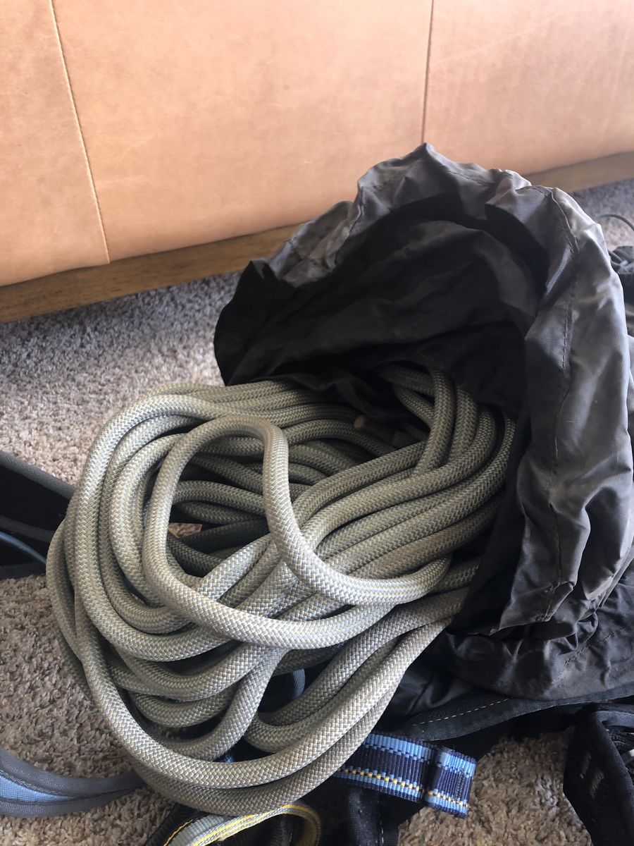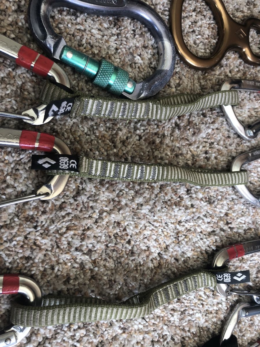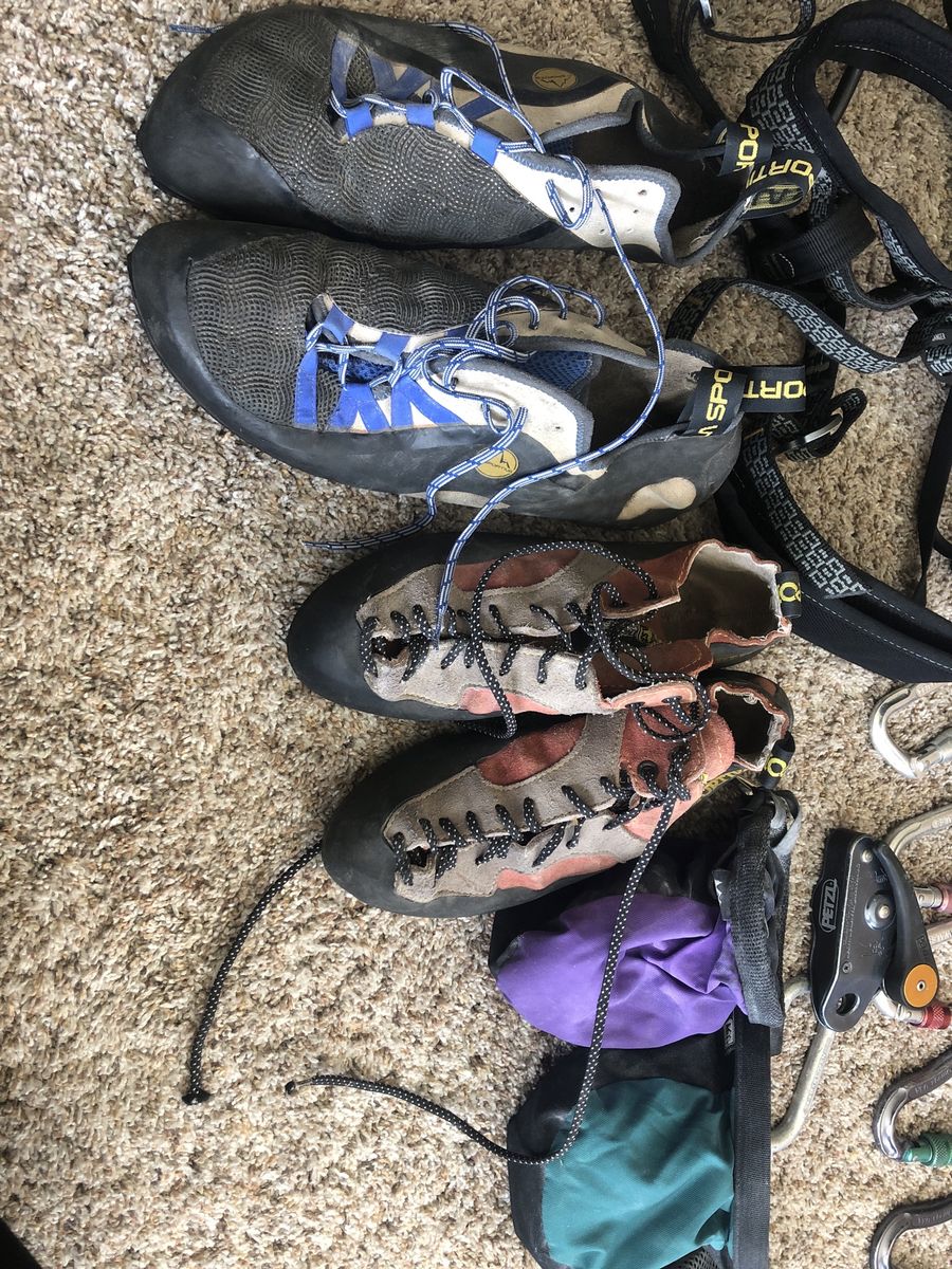 We have 2 adult harnesses and 1 child. 6 lead climbing clips 6 locking carabiner 4 belay devices including 1 Petzl grigri 2 chalk bags 1 rope bag and rope(should be retired soon) two La sportive shoes. Size 13 and 7 in men’s. I’m looking to sale as a lot feel free to call or text