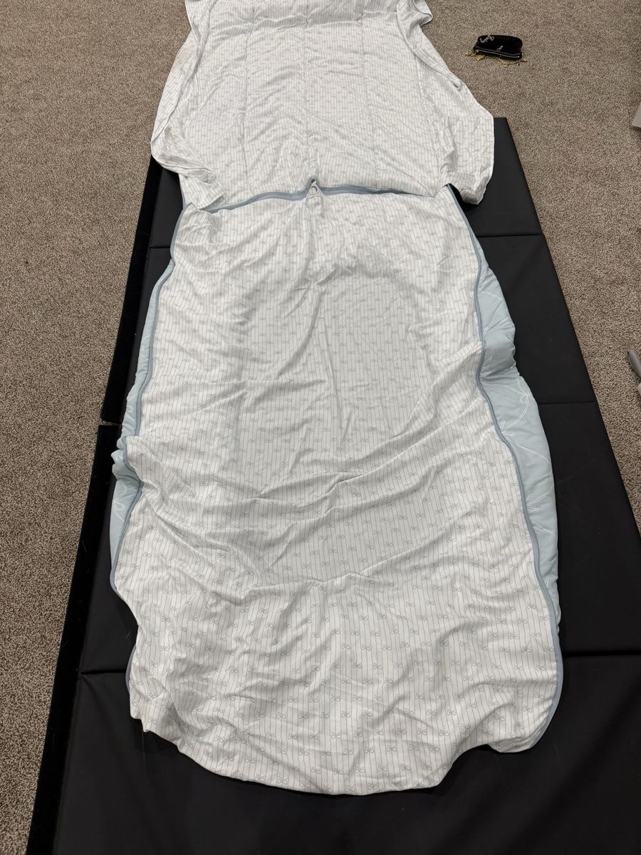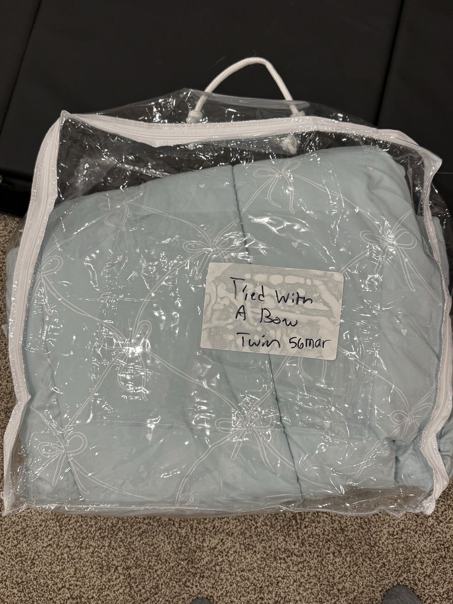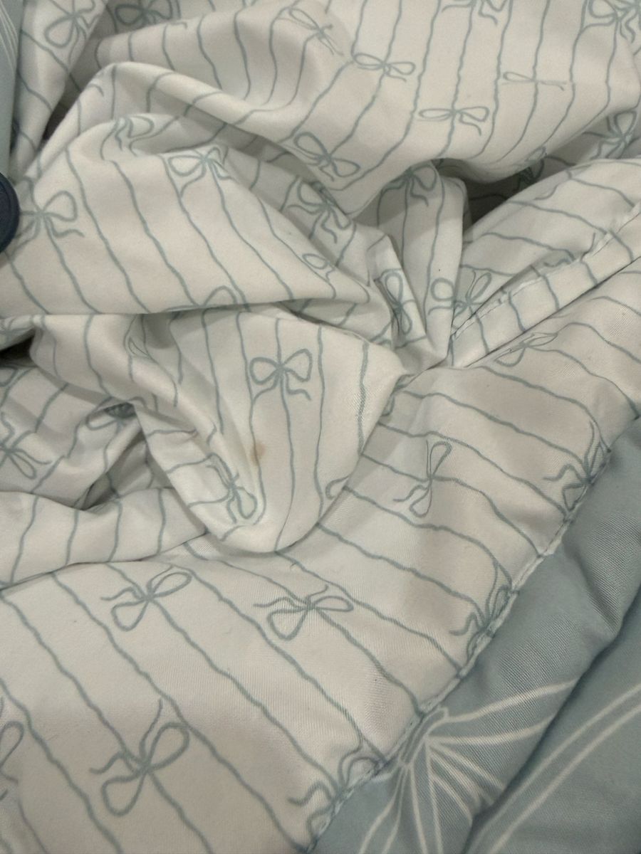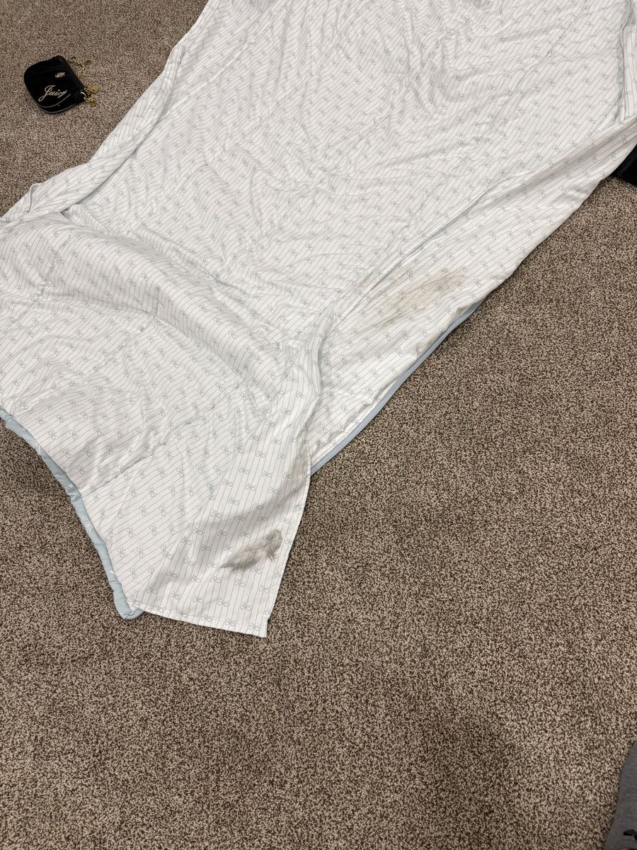 Has a sham and a case, some dirt scuffs on side panel and a small stain on sheet. MAR56