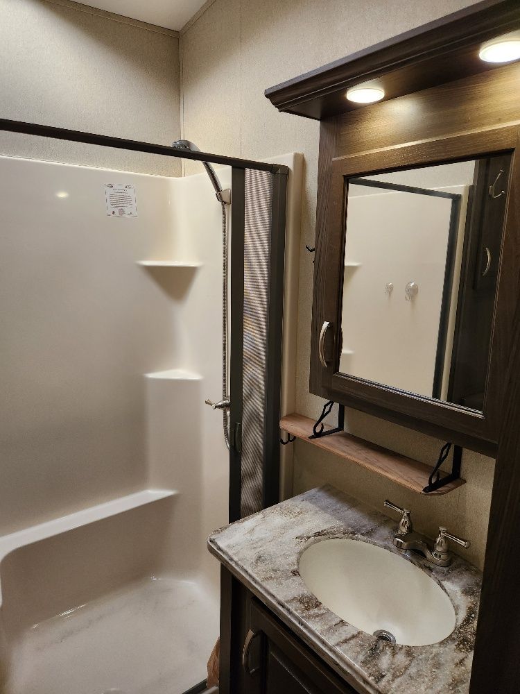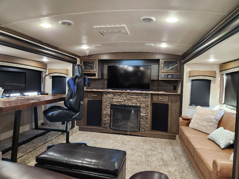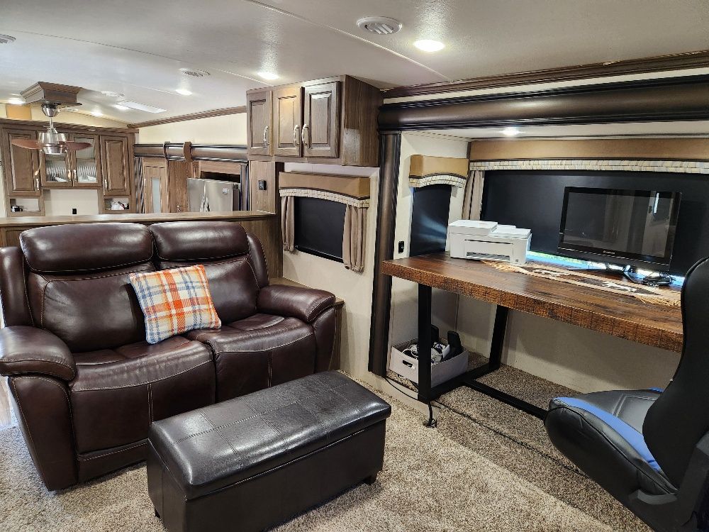 Experience residential-style comfort and distinctive front living luxury in this 42' fifth wheel crafted for extended stays and upscale travel. This spacious and well-designed RV delivers the feeling of a true home on wheels, combining elegant finishes, smart storage solutions, and premium amenities throughout.