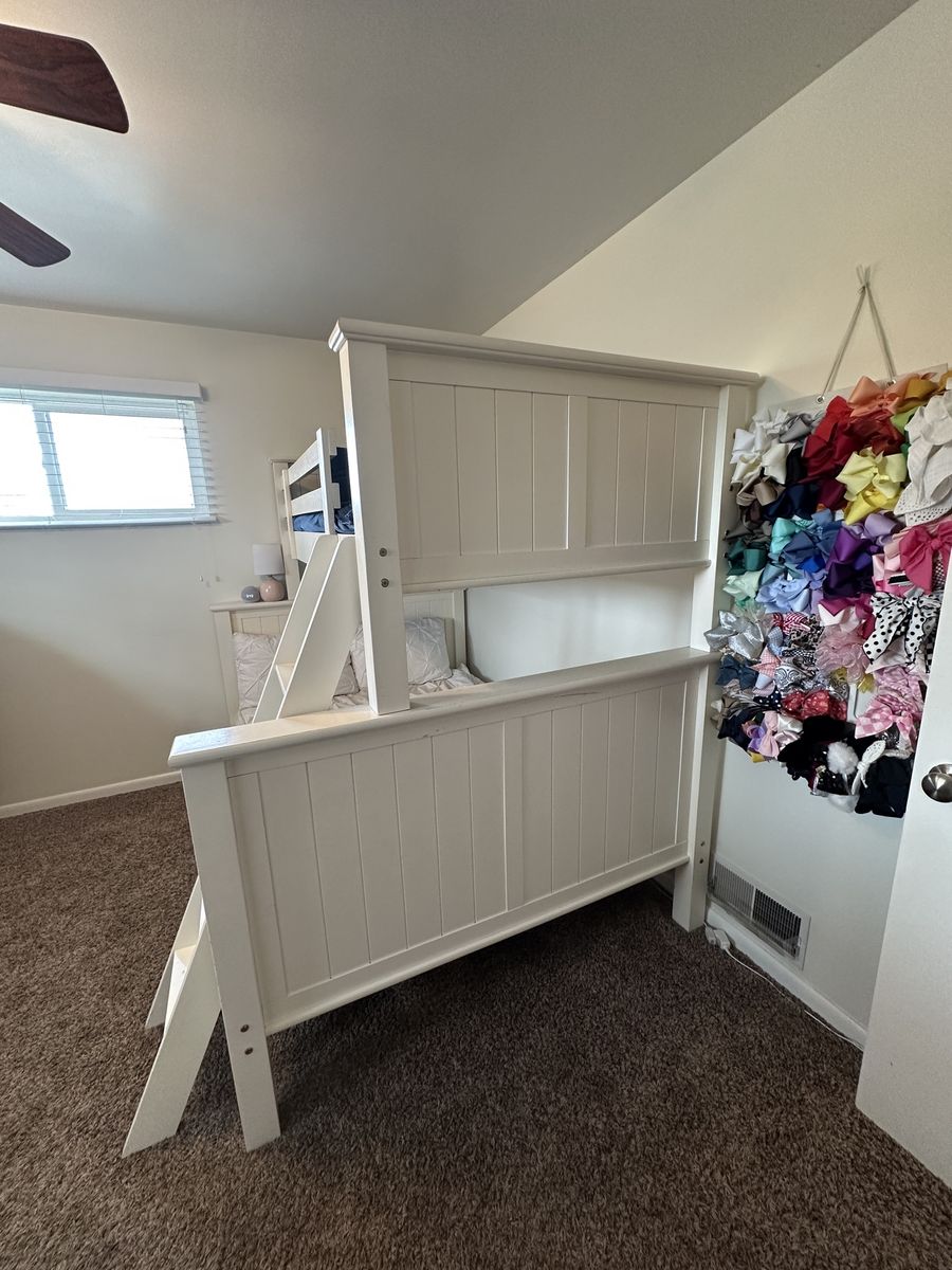 Kids white bunk bed. Can be separated to have a full-size & a twin-size. 81” length x 58.5” width (full) x 42.5” width (twin). Mattresses included, if desired. $200 OBO, OOS, FCFS, pickup in So. Ogden.