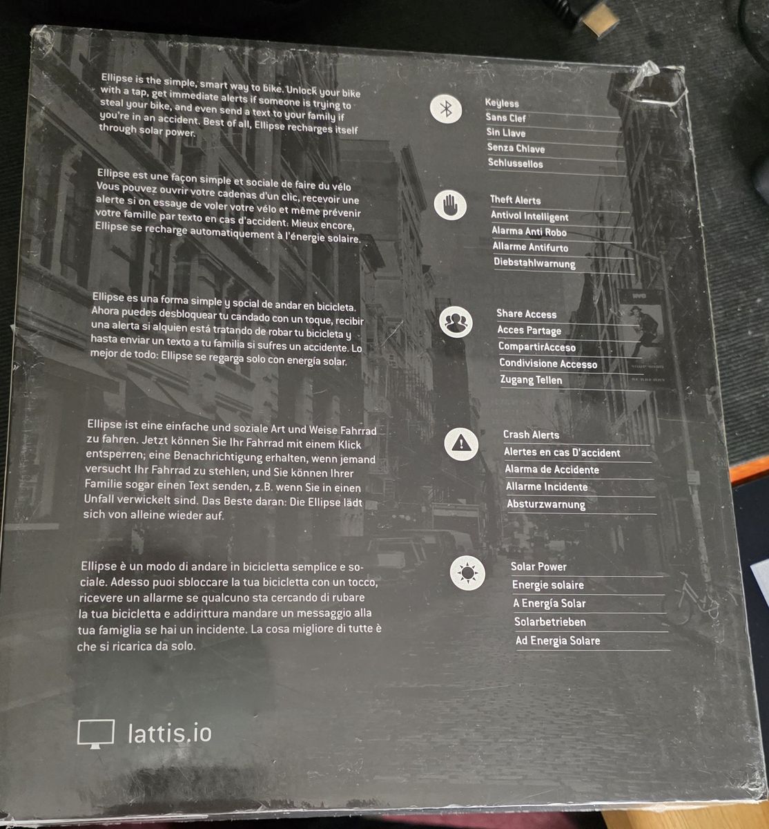 ZelleEllipse Smart Bike Lock By Lattis New In Sealed Package Apple Android. Works with most Bluetooth-enabled Android and Apple® iOS devices; downloadable Ellipse Lock app; fits most bikes; keyless entry; solar-powered and self-charging; crash alerts; IPX4 splashproof construction; shockproof and ruggedized design; 17mm steel shackle. Has never been used, is still in the sealed package. Could ship for $15.