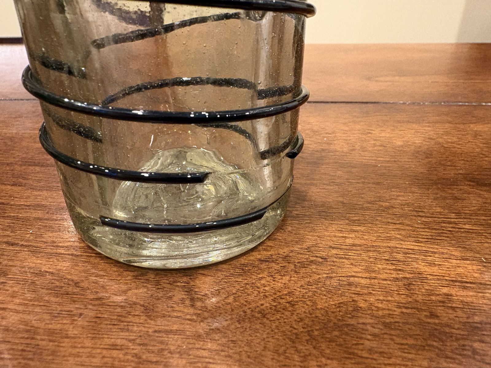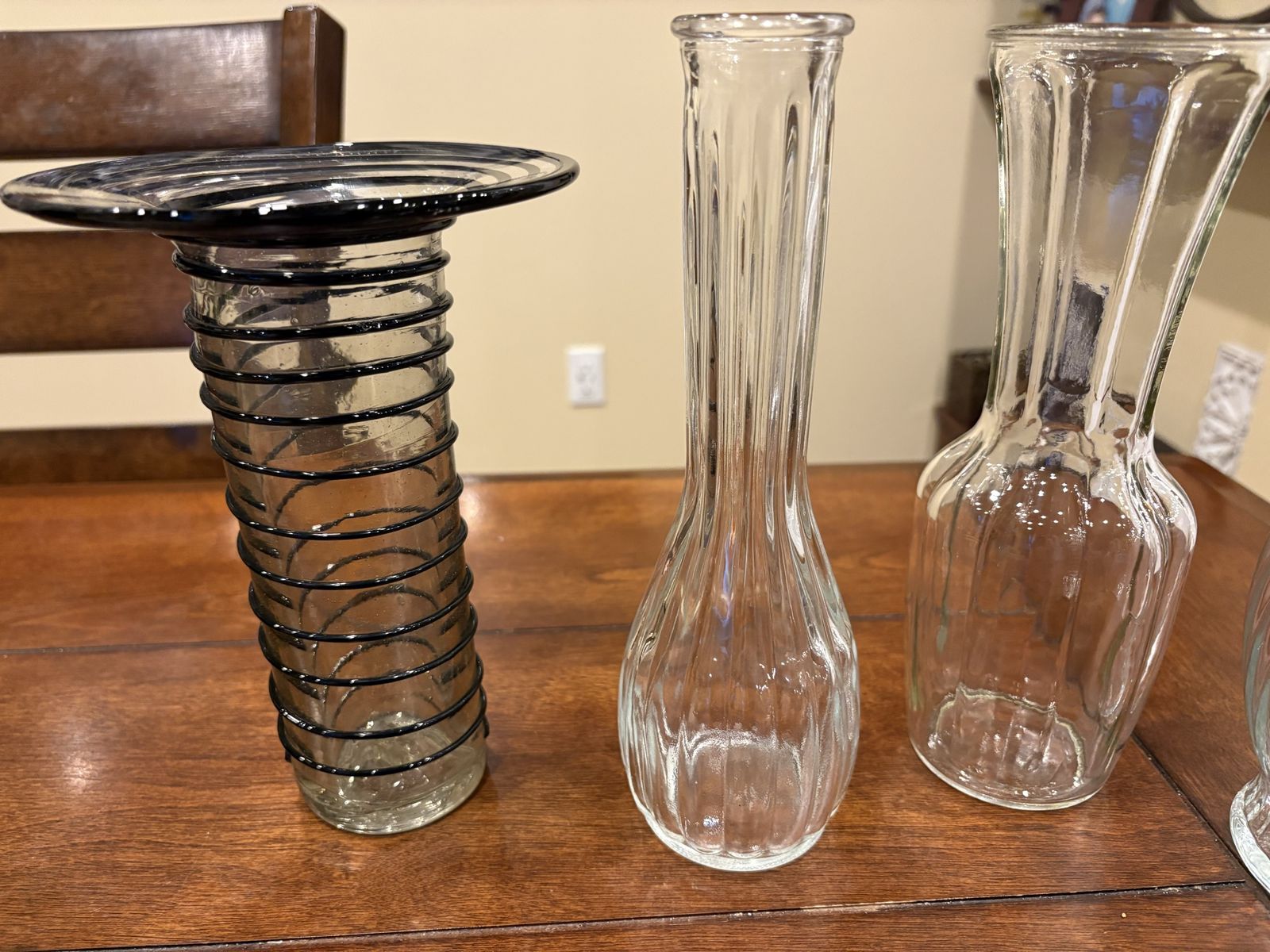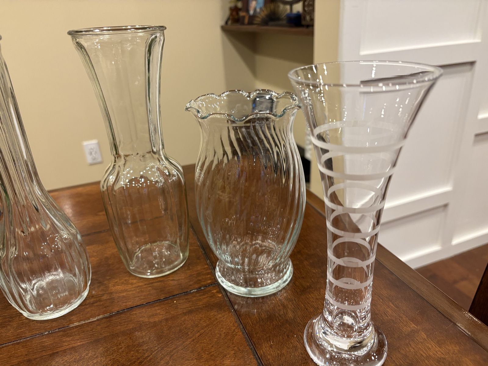 I have 5 glass vases that are all different from each other. The shortest is 7 inches tall and the tallest is 9 inches tall. They are all clear glass. One has frosted white stripes and one has black plastic or metal wrapped around the outside of it. A small piece of the black has broken off on the bottom of one side (see the last picture for a close up). The price is for all of them together. See my other ads for jewelry, artwork, home decor and more.