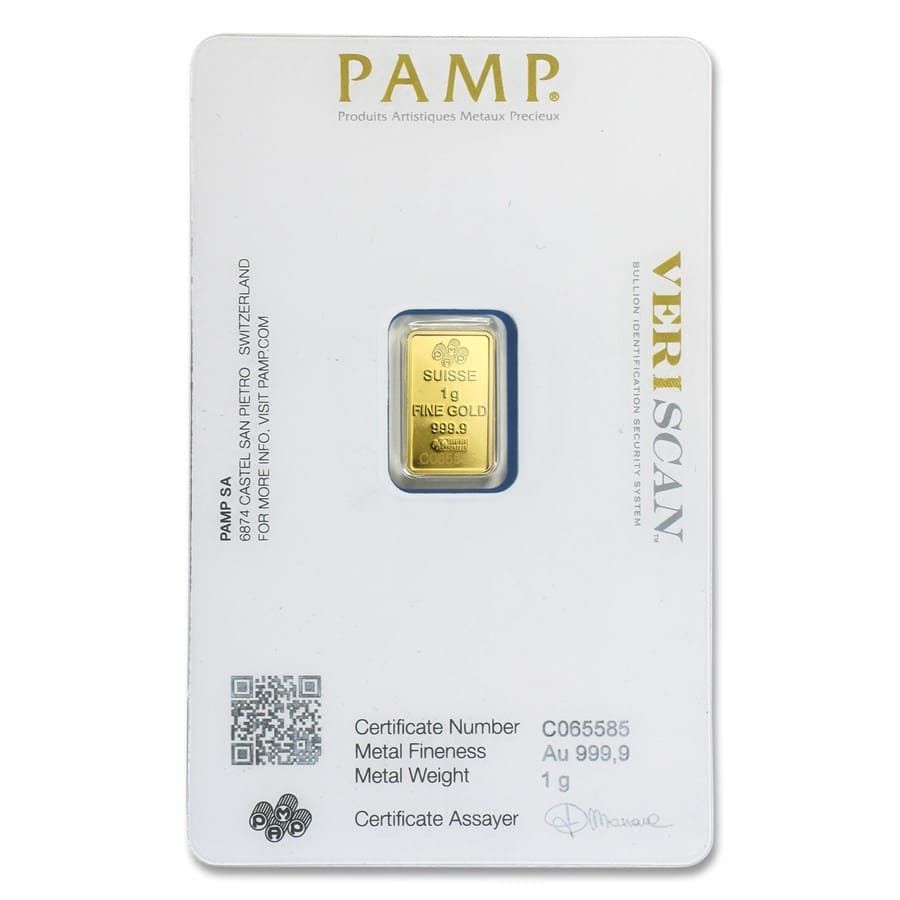 New PAMP Gold Bar straight from the Suisse Mint. New, BU (Brilliant Uncirculated), Mint Condition, Never opened, Never touched, Never pre-owned. In credit card anti-tamper packaging. The Veriscan technology used in these gold bars is the creation of PAMP Suisse. The proprietary technology allows buyers to authenticate their gold bars by scanning the QR code on the packaging. It contains the microscopic markers found on the bar’s surface, and correlates to the identifying markers scanned by PAMP Suisse when the bar was minted.