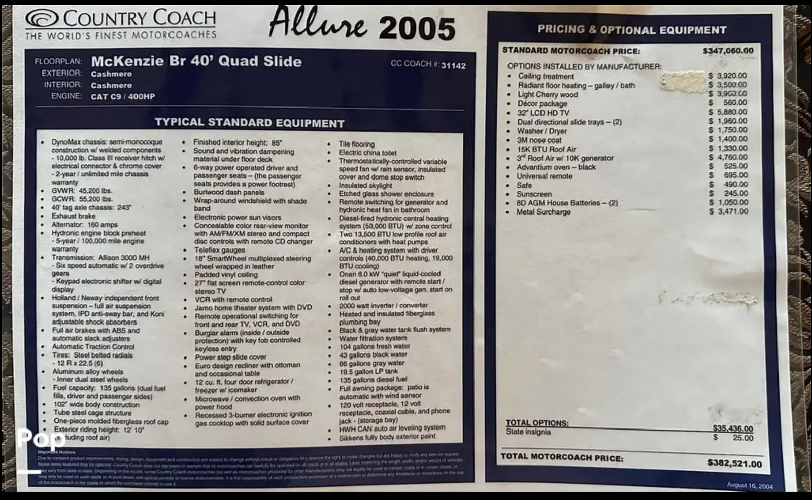 This 40 foot length, Quad Slide 2005 CAT Powered Country Coach Allure 470 McKenzie Bridge represents a rare opportunity to own one of the finest luxury all-inclusive motorcoaches ever built.