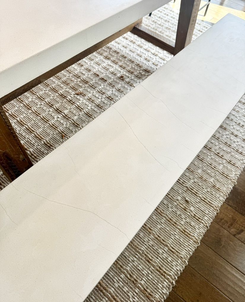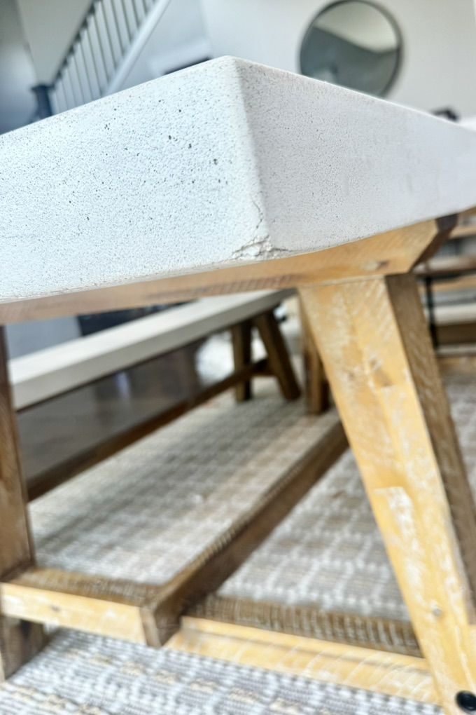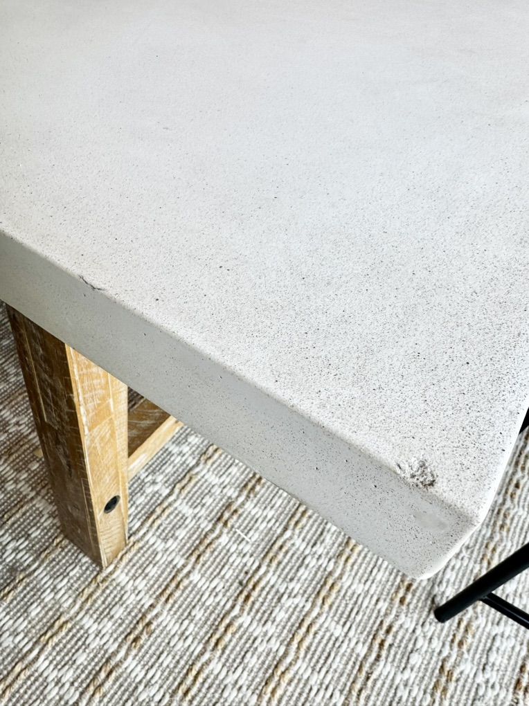 This table is from the Beaumont collection of downeast home. Dimensions are 89.5 x 39.5 inches. It is a large table that seats 8 or even up to 10 if you have several littles. HEAVY sturdy table, with a thick wooden base and concrete top. Matching bench is also included. Because of the porousness of concrete, there are a few small stains/patina areas, similar to marble. But with the right concrete cleaner & sealer I'm sure they could be buffed/cleaned out! A few small chips pointed out in photos. Also some hairline cracks here & there. Never bothered us because they're kind of indicative of concrete and kind of just blend with the natural look of the stone. We are only selling because our growing family needs something bigger. Txt for more info or to come see/purchase!!