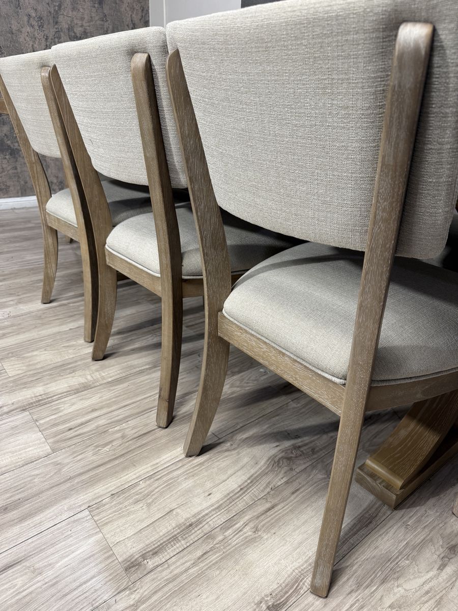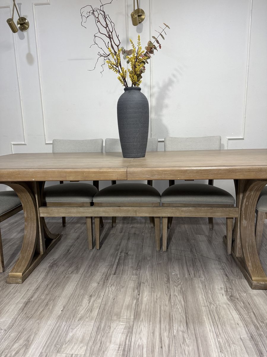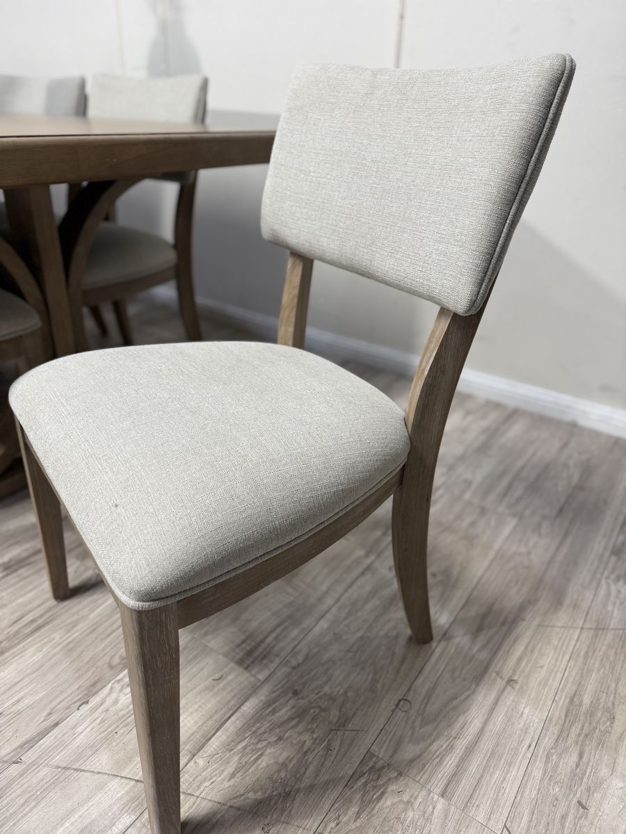 Introducing the Mercer Dining Set by Pike & Main, a perfect blend of elegance and functionality. This stunning set boasts a natural finish, showcasing the beauty of oak veneers and solid rubberwood. Its easy transitional styling effortlessly complements any décor, while the upholstered chairs offer supreme comfort for your dining experience.. Elevate your dining space with the Mercer Dining Set, where timeless design meets modern convenience.