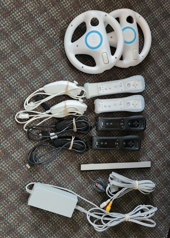 PayPalComplete Wii gaming system. includes cords, 4 controllers (one control extension) & 4 nunchucks. Balance board. 10 games. 2 steering wheels. Kinect sensor. $200 OBO no codes.