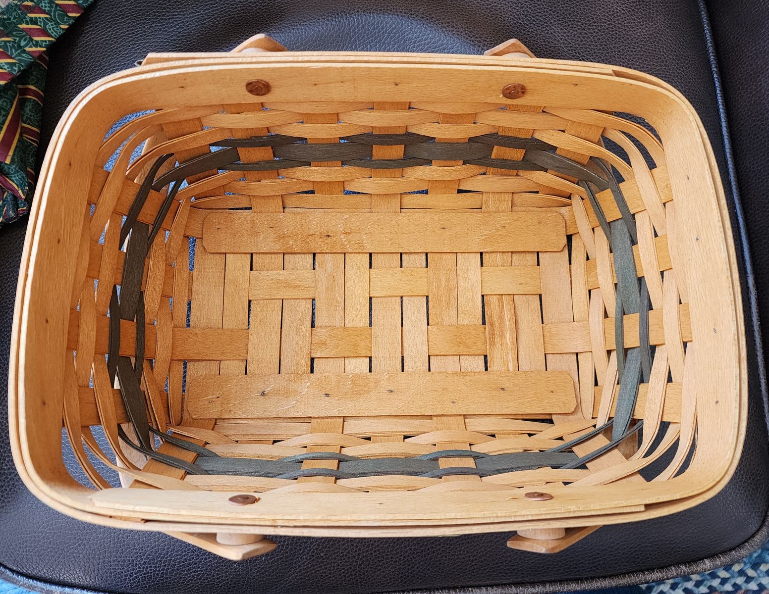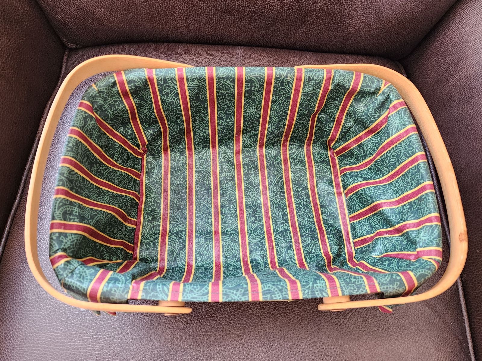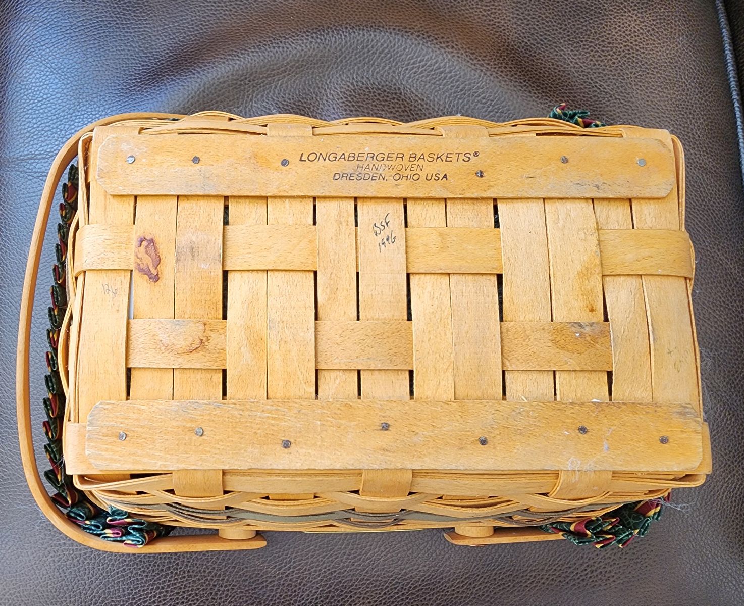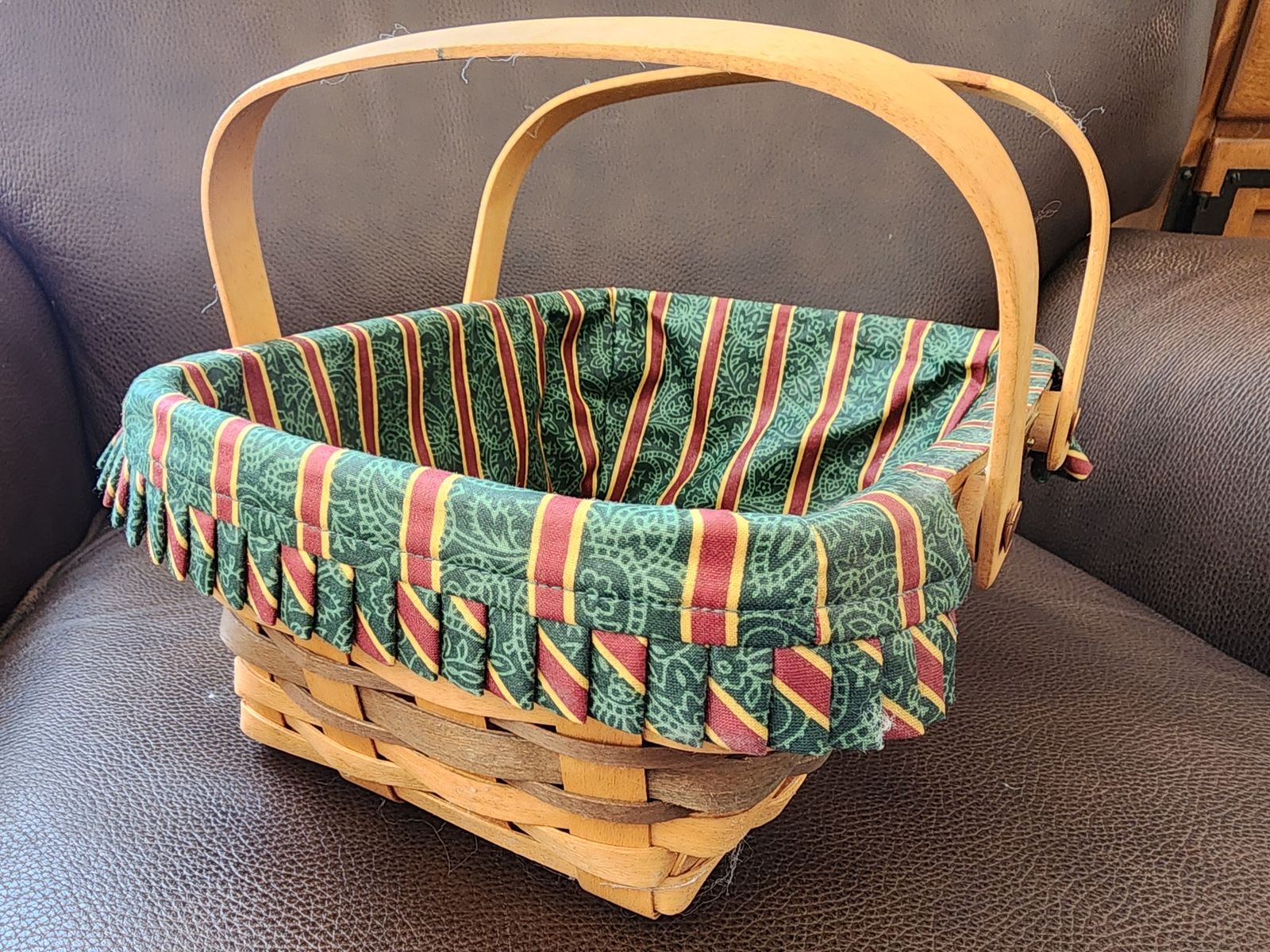 VenmoWoven basket with tack reinforced bottom, sewn pleated fabric liner, 2 handles, wooden lid. 12"x9"x4¼" (to top edge of basket, 5½" to top of lid knob, 8" to top of handles when up.)