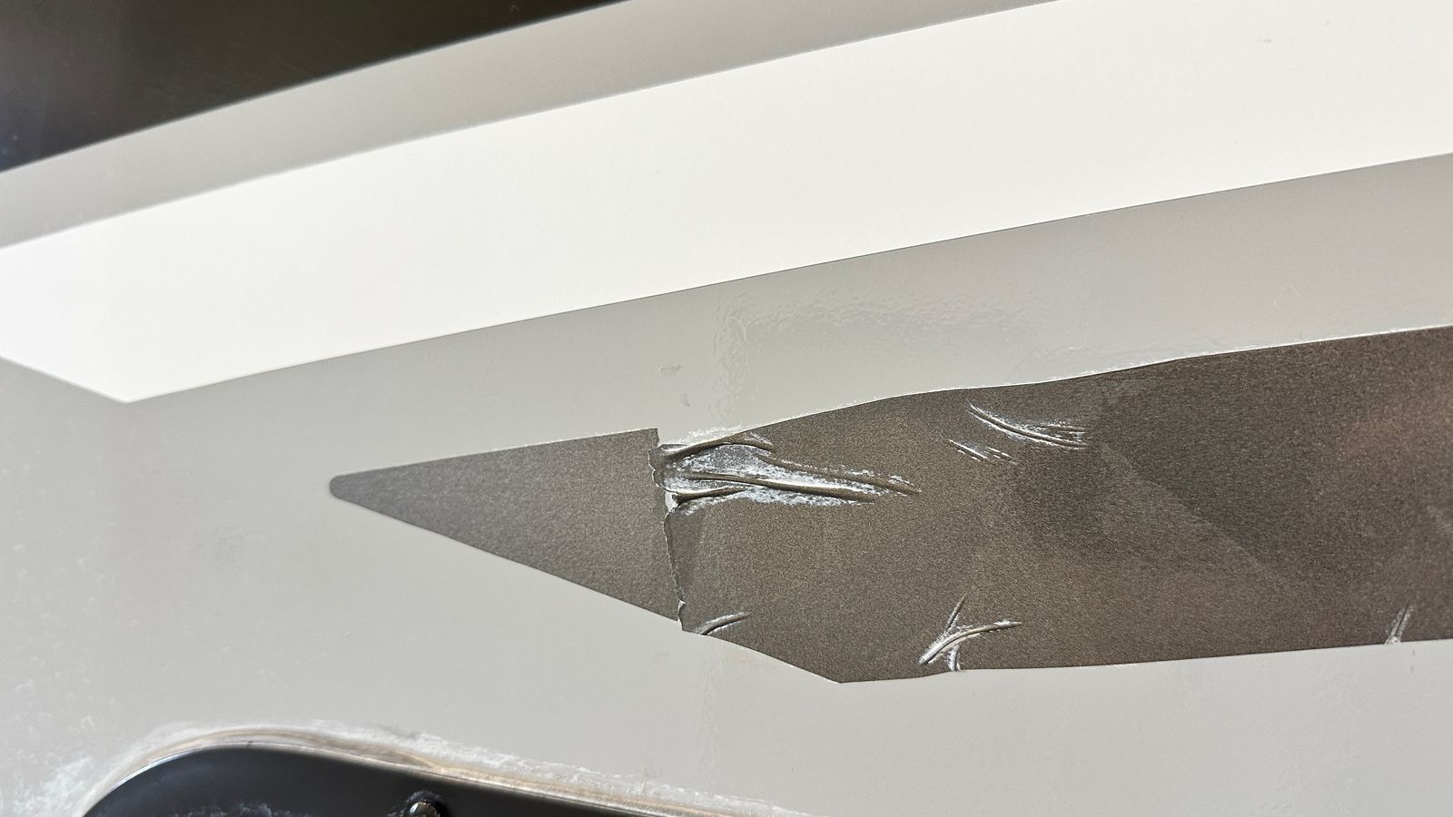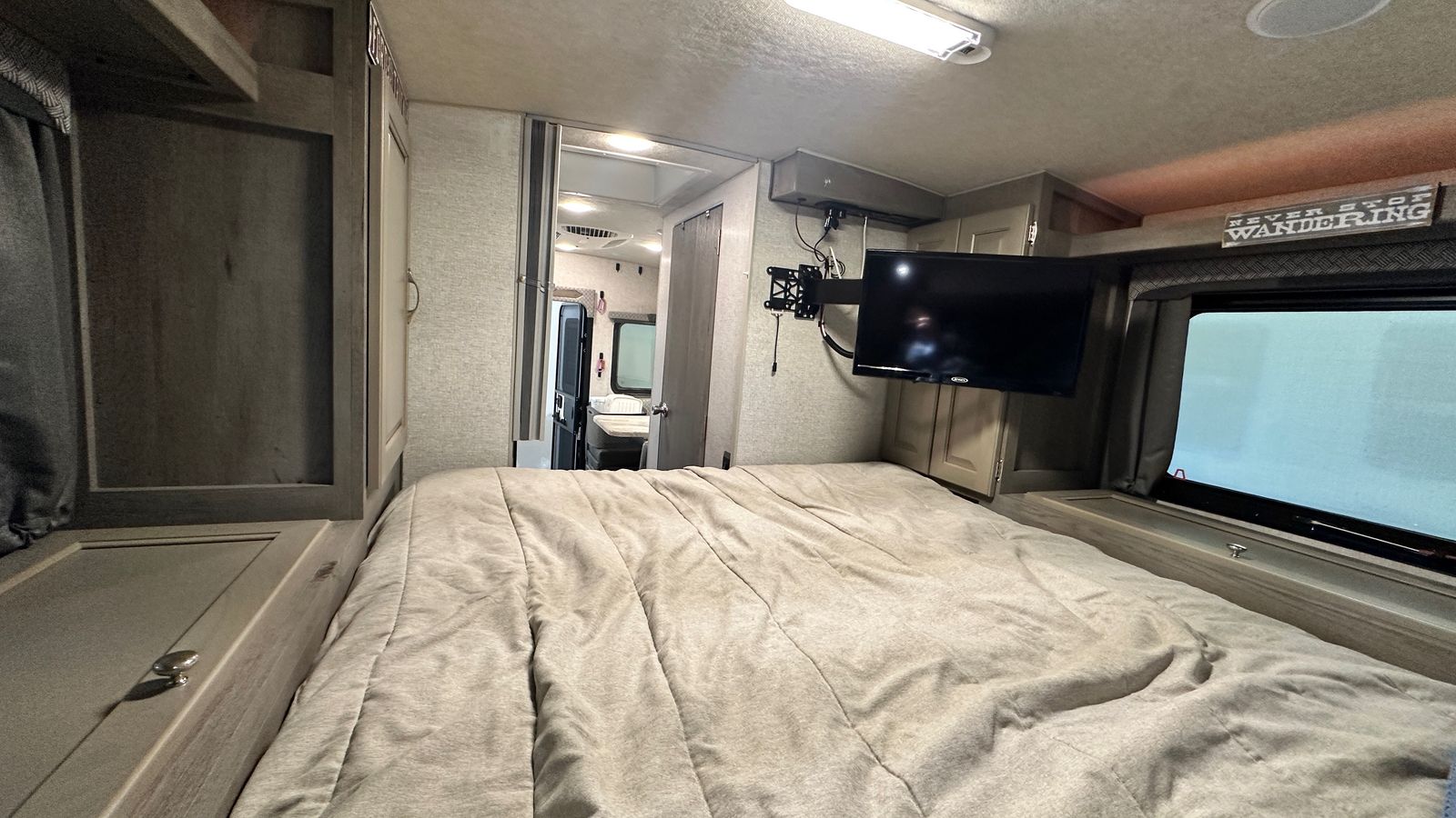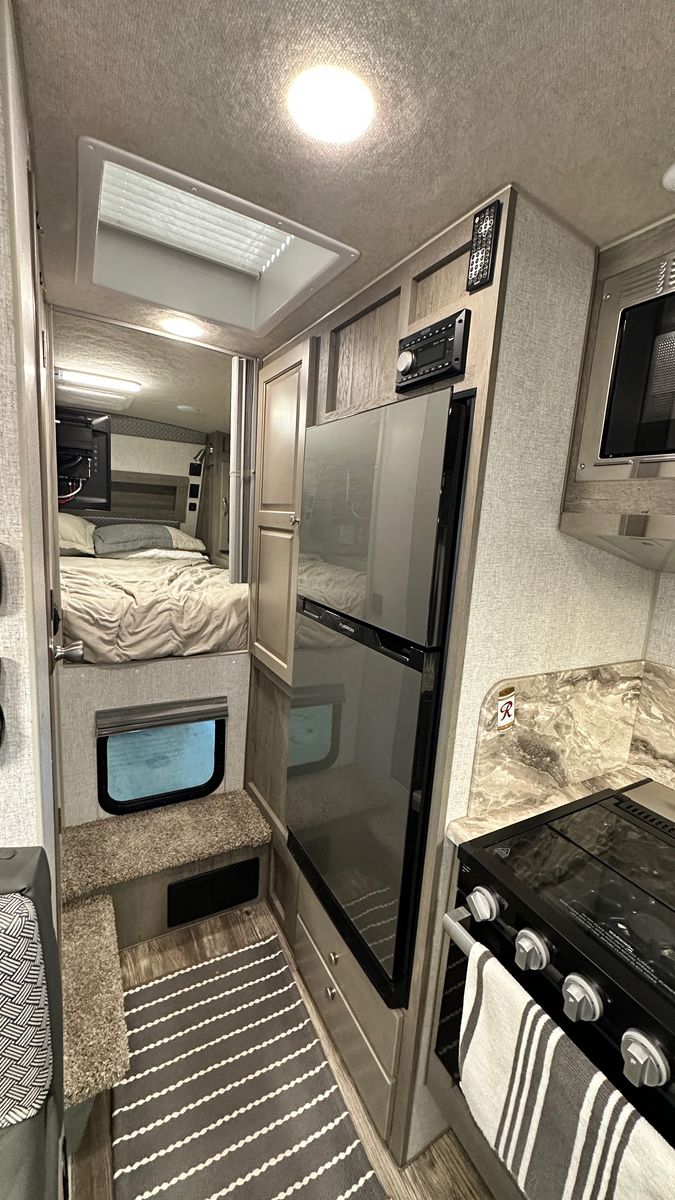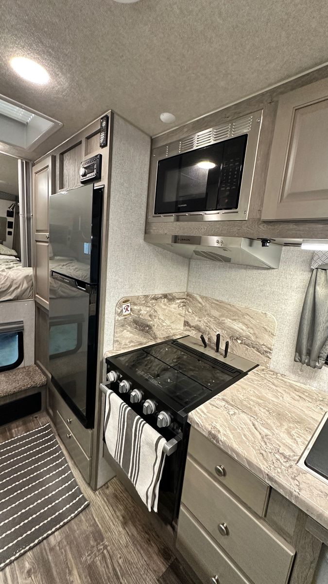 There is one cosmetic blemish on the exterior, visible in picture on right side of RV, plus one close-up picture…..one of the decals started to peel off as I was removing the plethora of manufacturer advisement and marketing stickers that come with all new RVs. As I was removing one of them, the decal started to come off, I reattached the decal, but it’s noticeable. Otherwise, this camper is pristine inside and out.