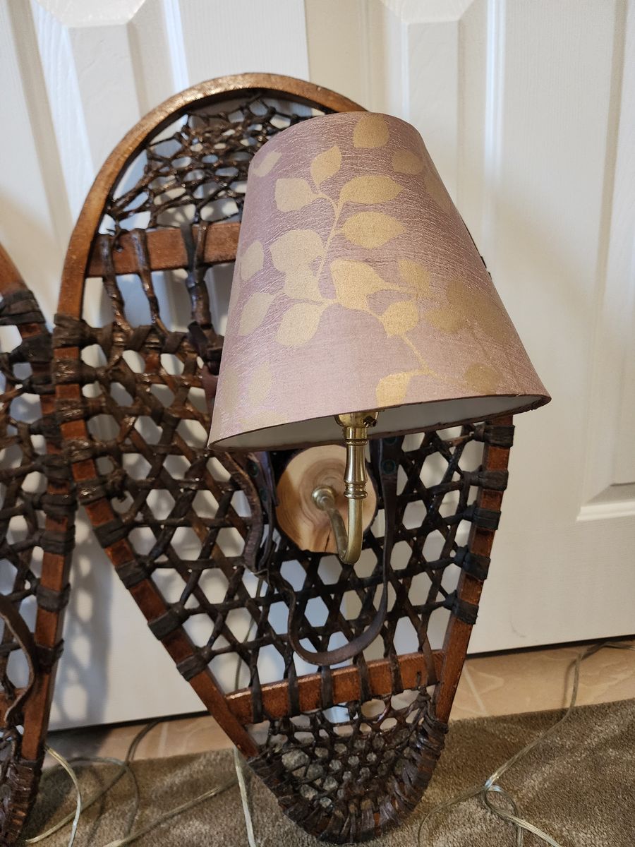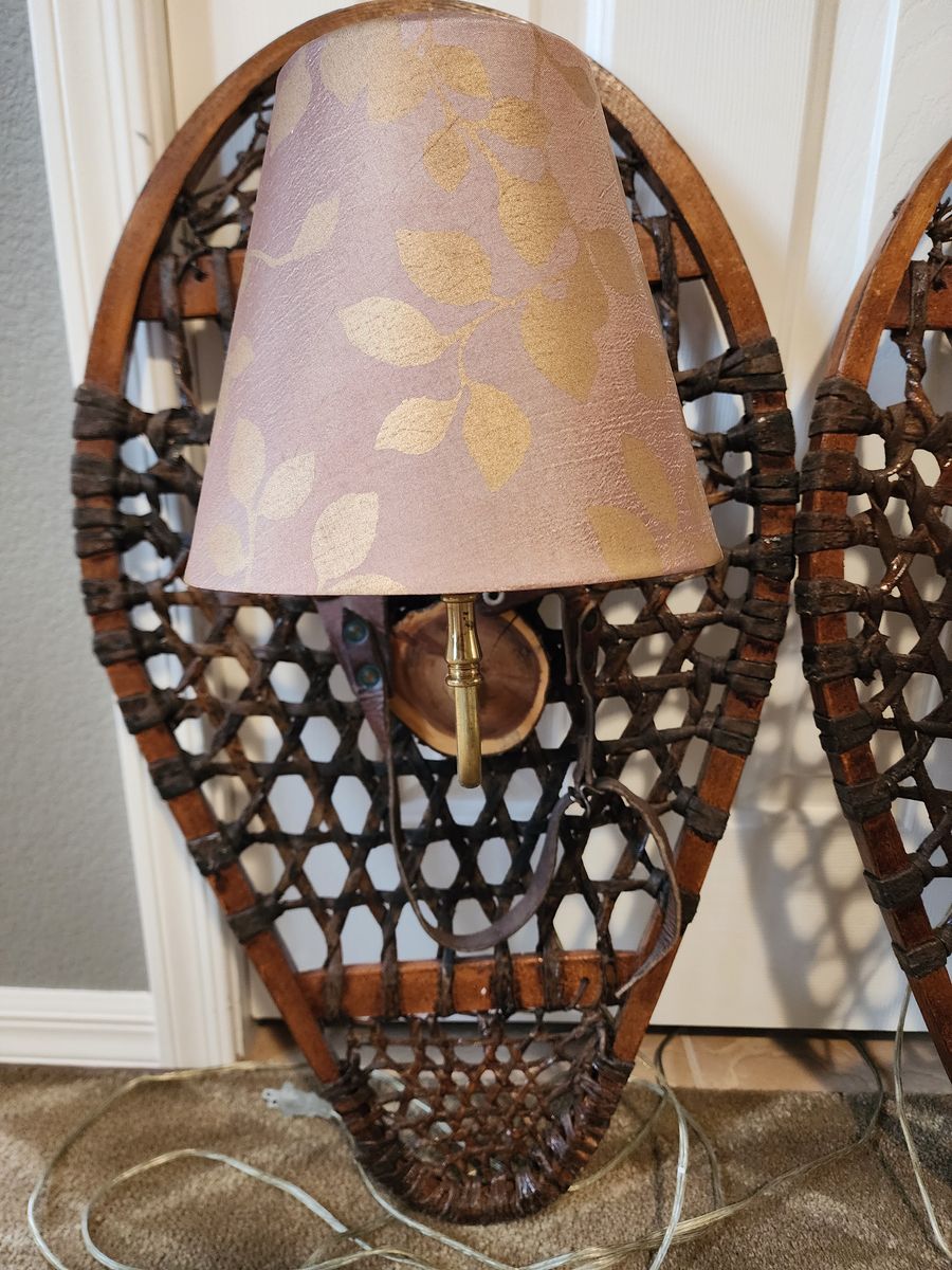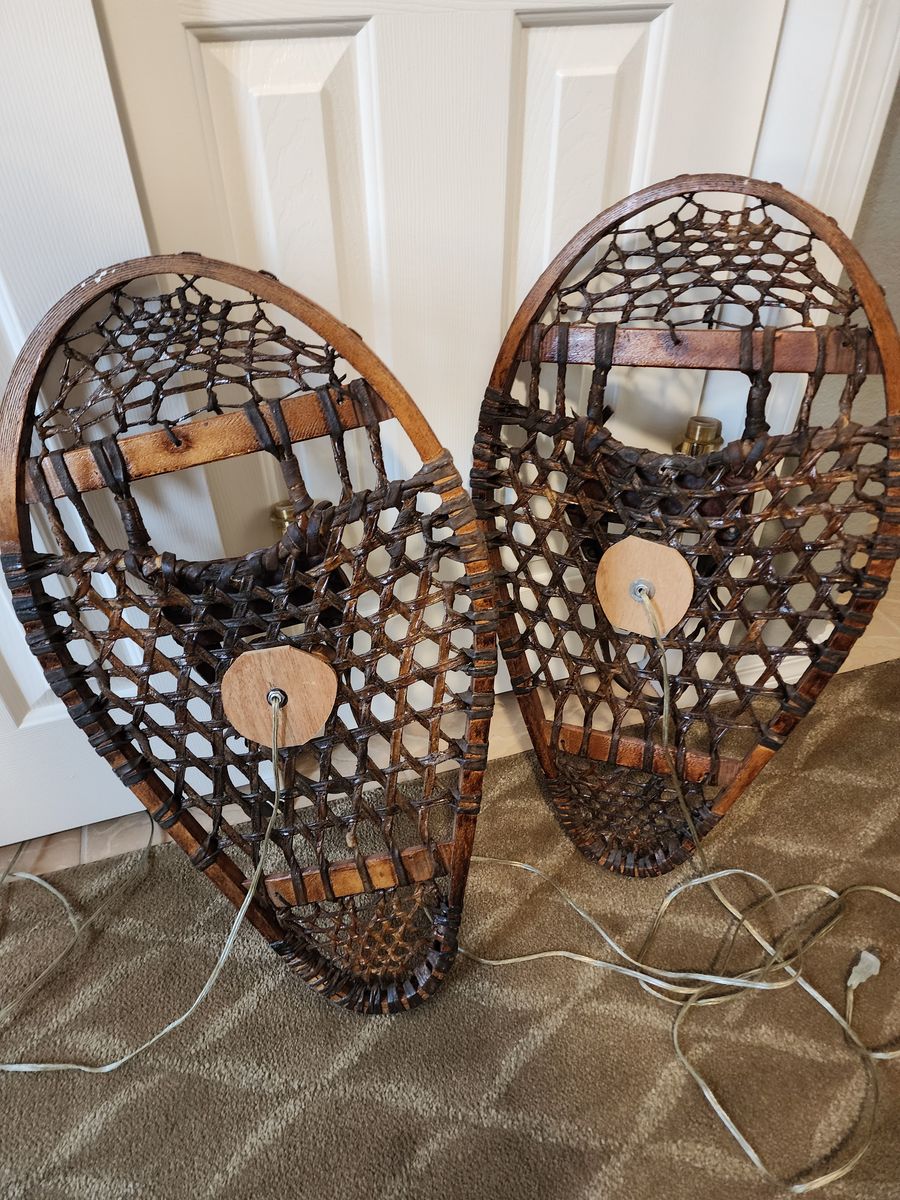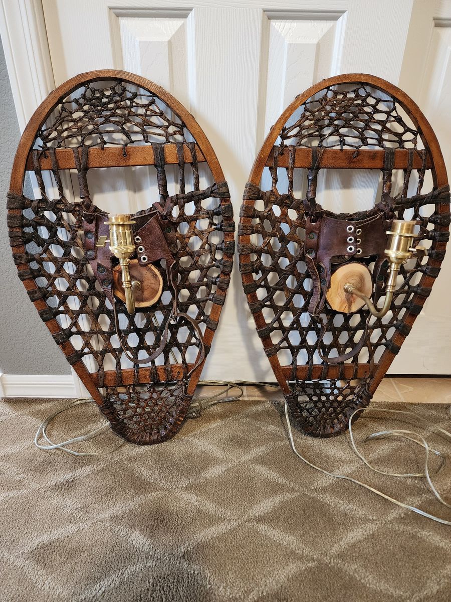 This is for the pair of antique snowshoes that have been made into wall sconces. They are in perfect working condition. 29" tall, 16" wide, and the electrical cord is about 130" long, for ease of reaching the outlets. Great functional decoration. They are located in Heber City.