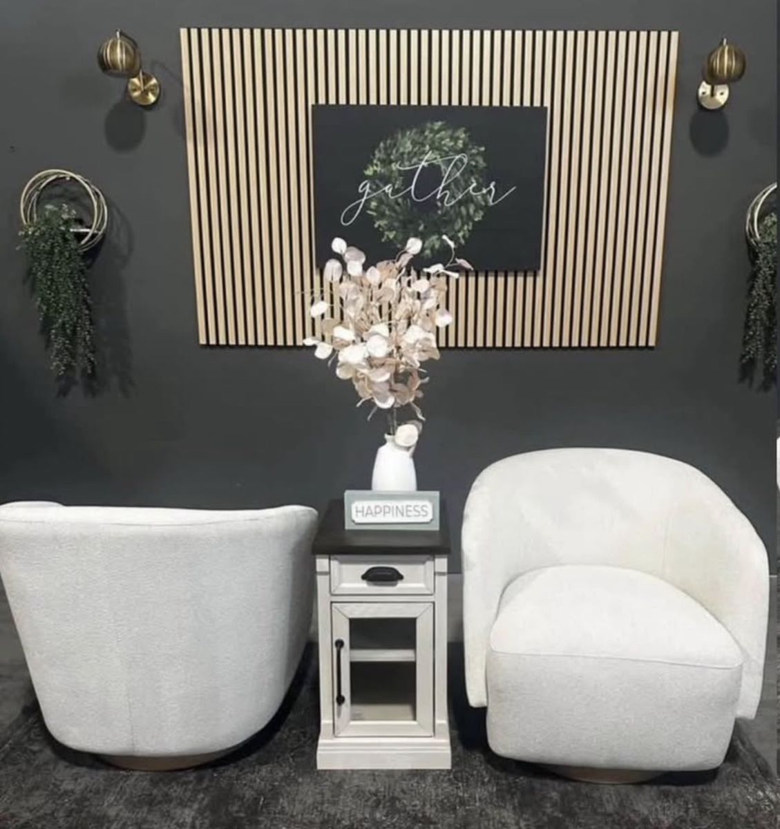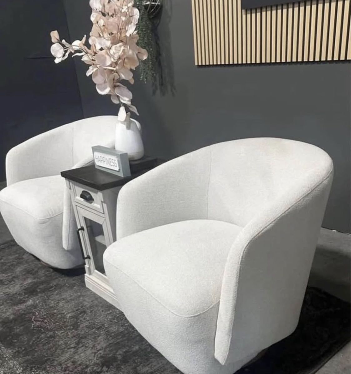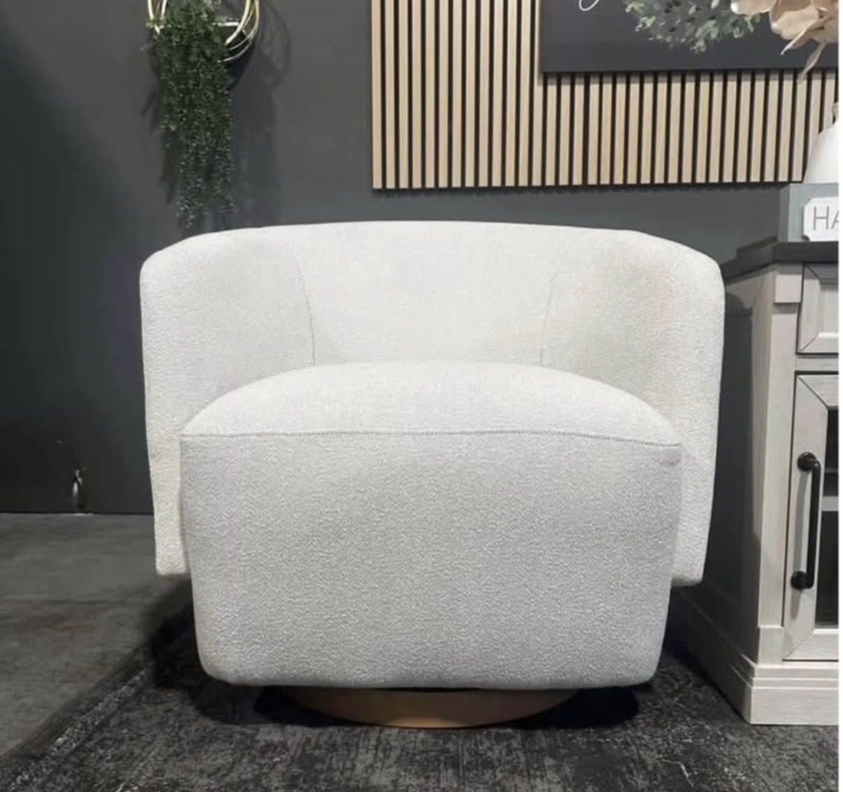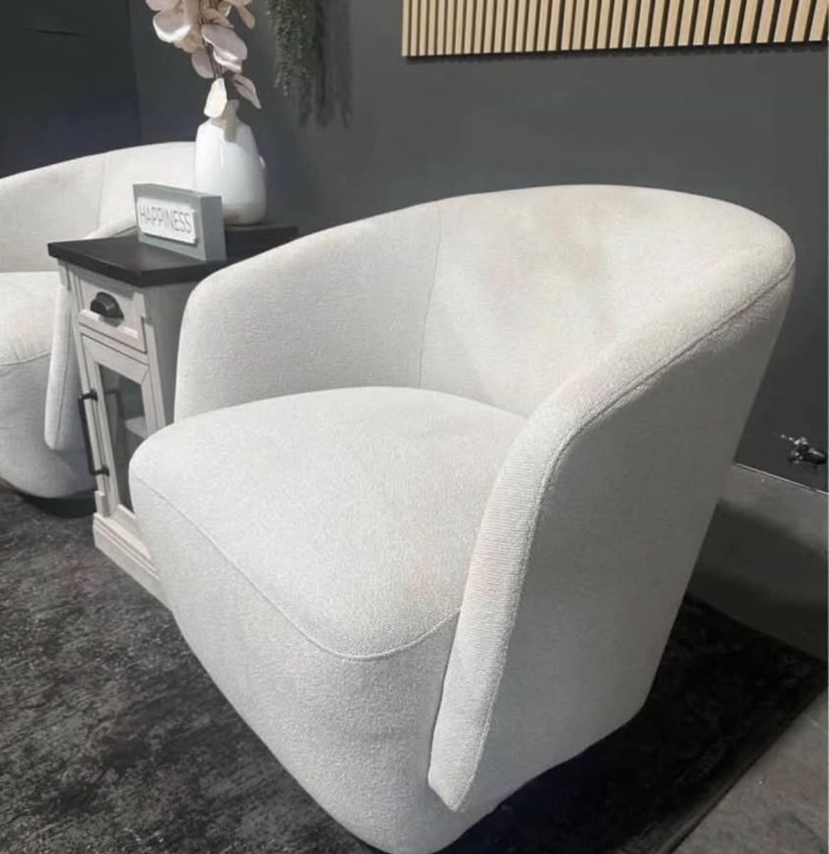 Conveniently enjoy the freedom to face any direction with the effortless 360-degree swivel feature. The gently cascading edge promotes relaxation and reduces pressure, creating a stylish and supportive seating experience. The stunning wood swivel base accent chair is sturdy and adds a touch of elegance and functionality. The distinctive arm design not only adds flair but also ensures a delightful and relaxing seating experience. An elegantly sturdy barrel design that not only offers superior back support but also adds a touch of style to your space. Sumptuously textured boucle that creates a soft, cozy, and inviting texture. Color is cream.