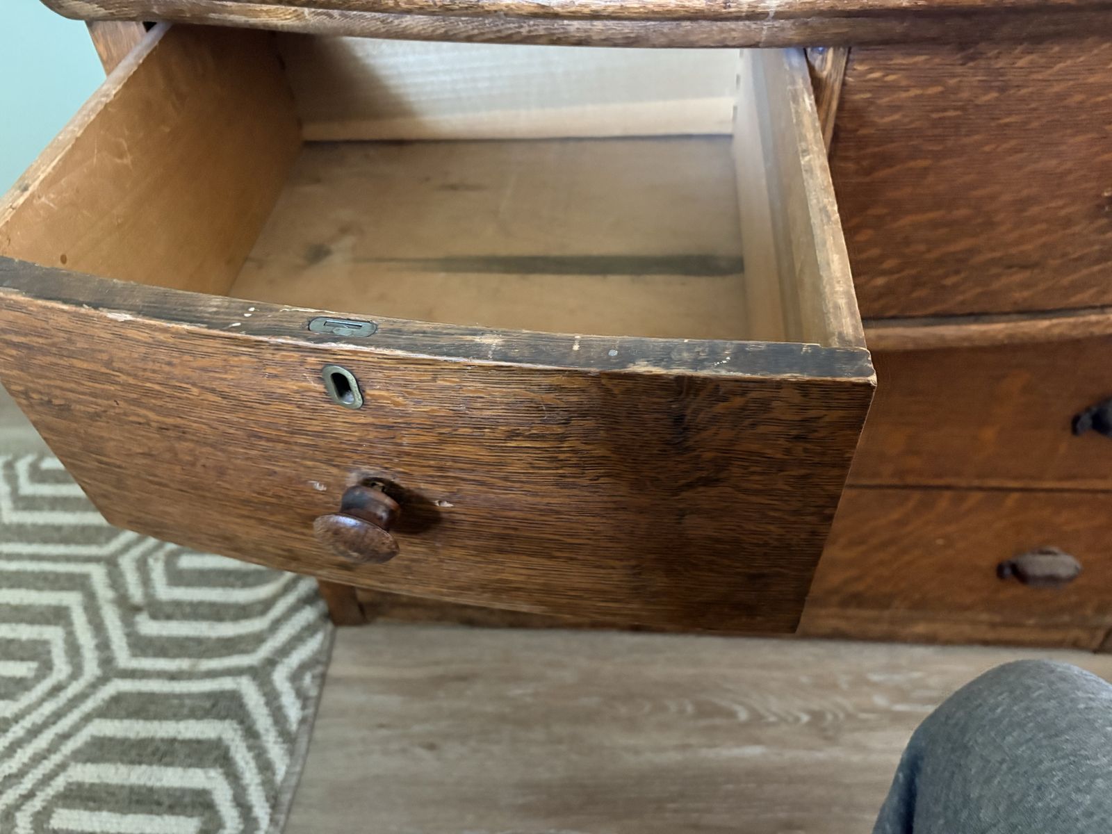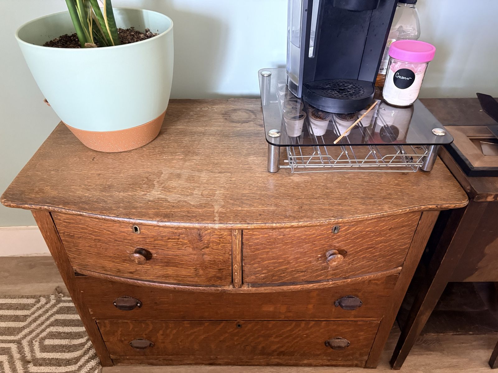 Zelle27”H x 35.5 W x 19” L Dresser is from the early 1900s. Iron and wood handles. Some water stains on top.