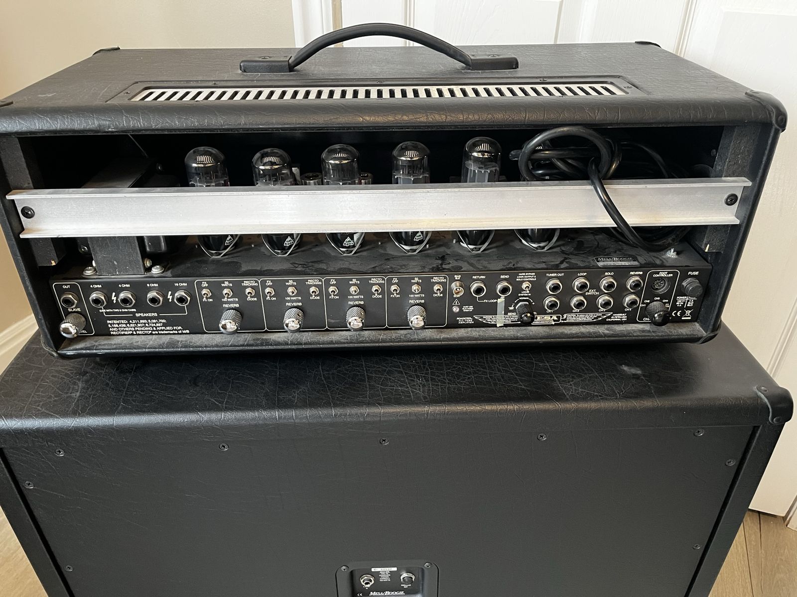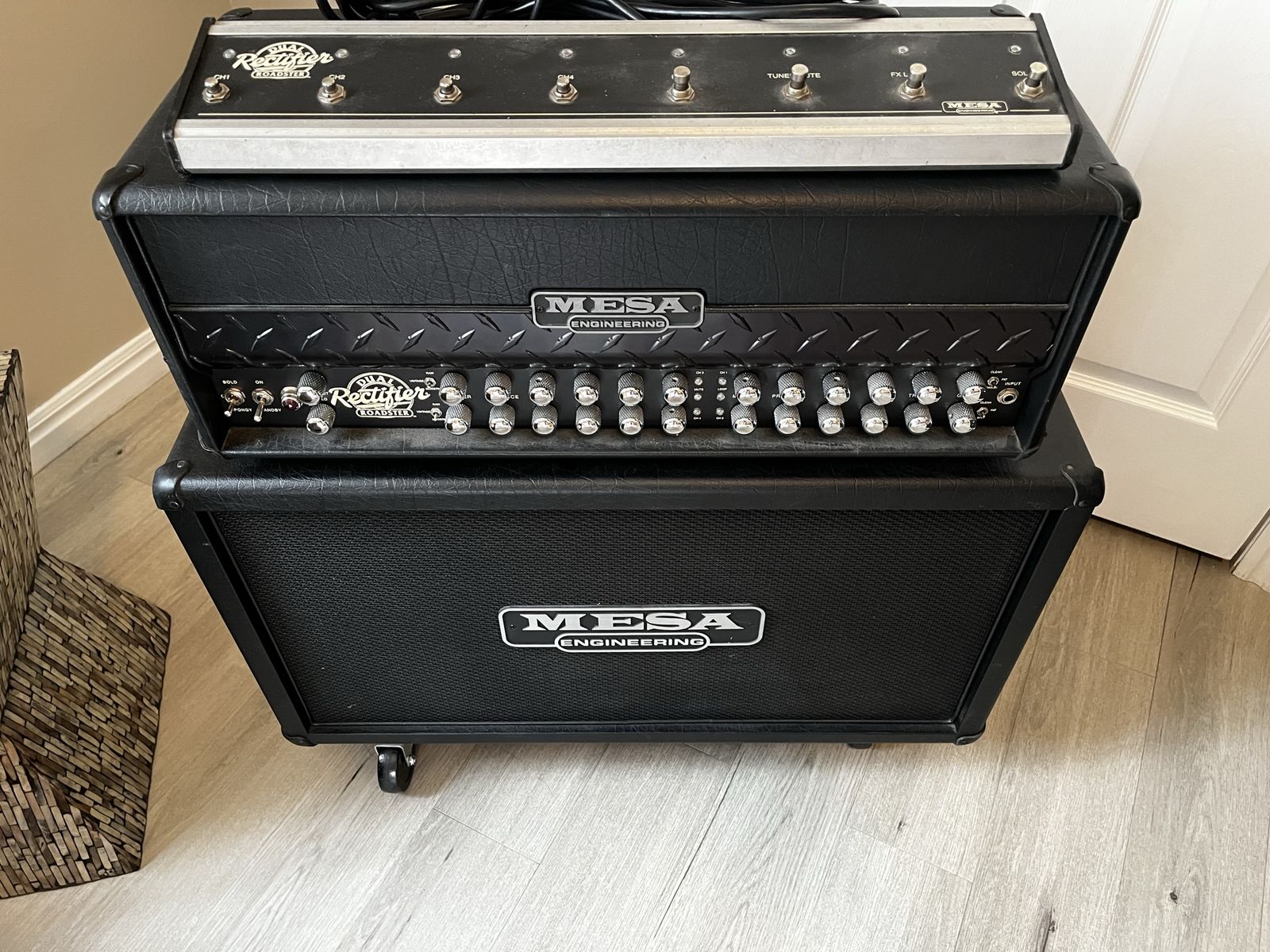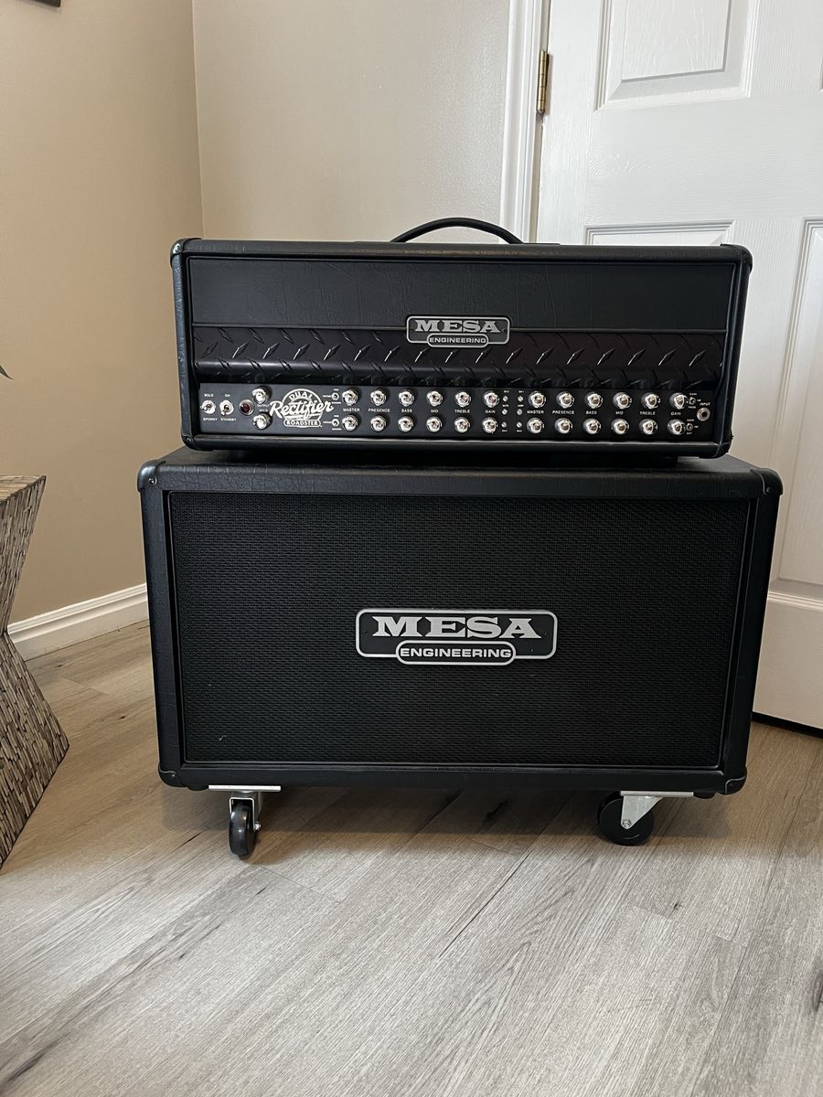 Everything works as designed. Includes original foot pedal in excellent condition. This includes a Mesa rectifier 2 x 12 cabinet. In excellent condition with Cover. The cabinet is loaded with Mesa branded Celestion V 30s