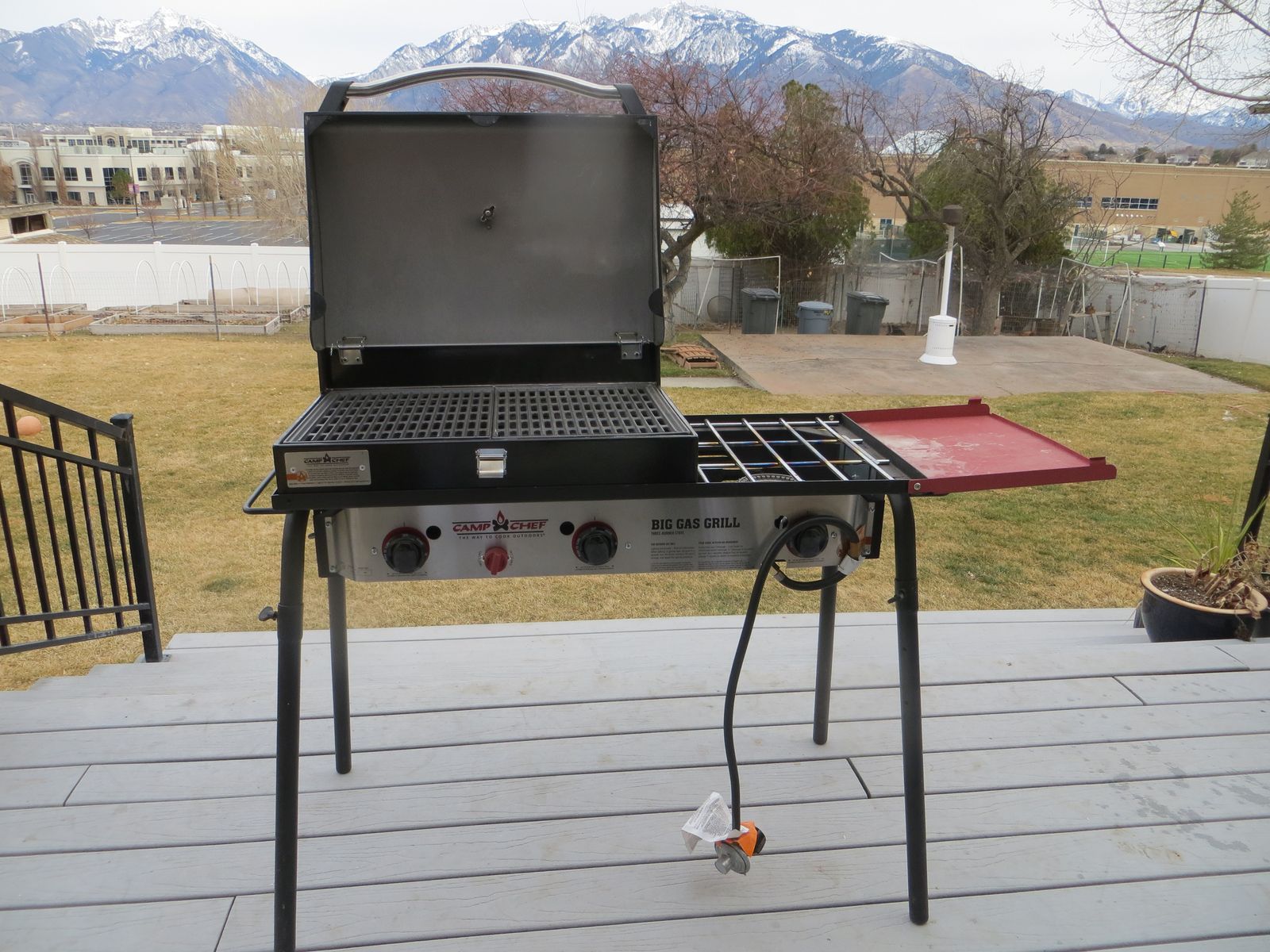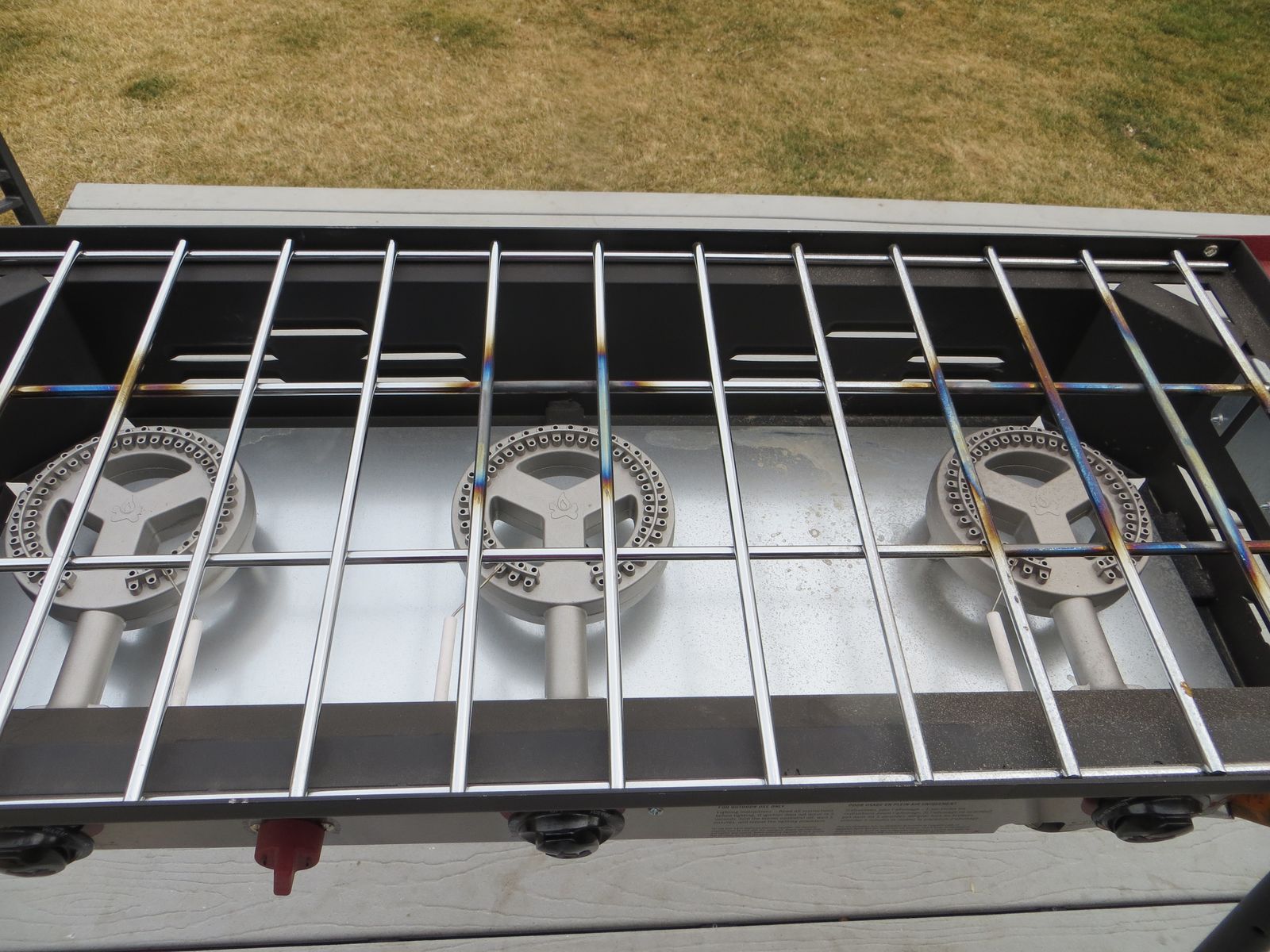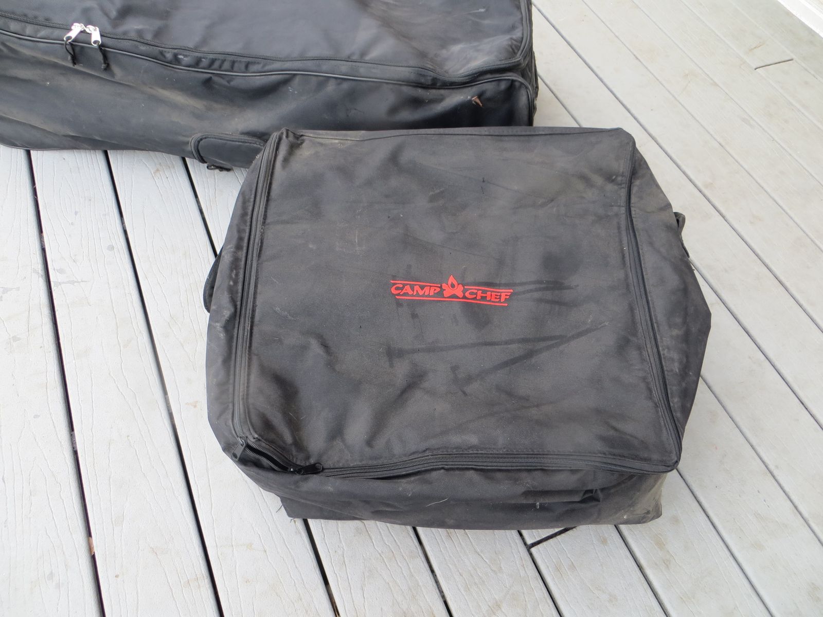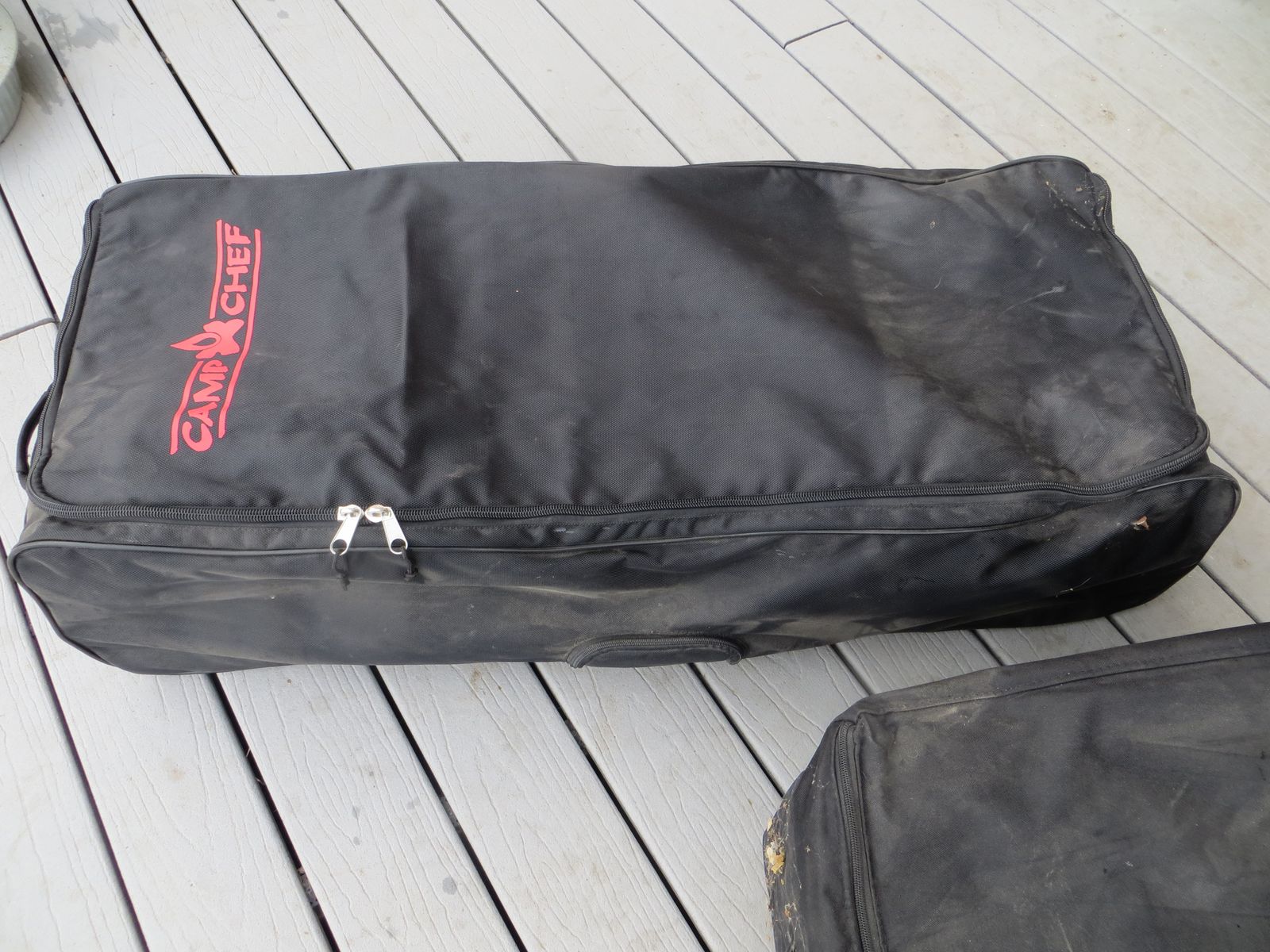 3 Burner Camp Chef for sale. Excellent condition. Like new. Used one time. Includes removable BBQ grill. Comes with covers/storage bags. Retails for over $400. 38" x 30" x 16" . Propane.