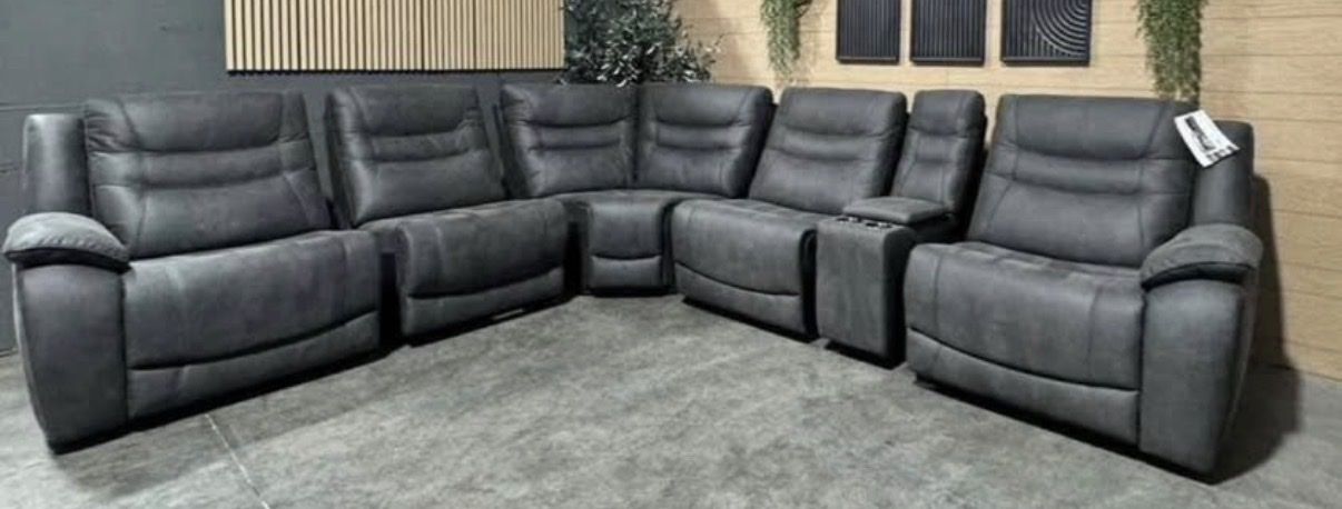 The Gilman Creek Furniture® Kelsee 6-piece Fabric Reclining Sectional in gray is here to elevate your relaxation game. With power headrests and footrests on three seats, plus USB and USB-C charging ports, you'll never have to compromise comfort for connectivity again. Customize your setup by placing an armless seat and a flexible armless power recliner on either side of the sectional to suit your space. With a storage console with cup holders, 110V power outlets, and extra USB and USB-C chargers, you can have your devices charged and drinks within arms reach. Sink into relaxation and stay connected with the Kelsee gray reclining sectional!