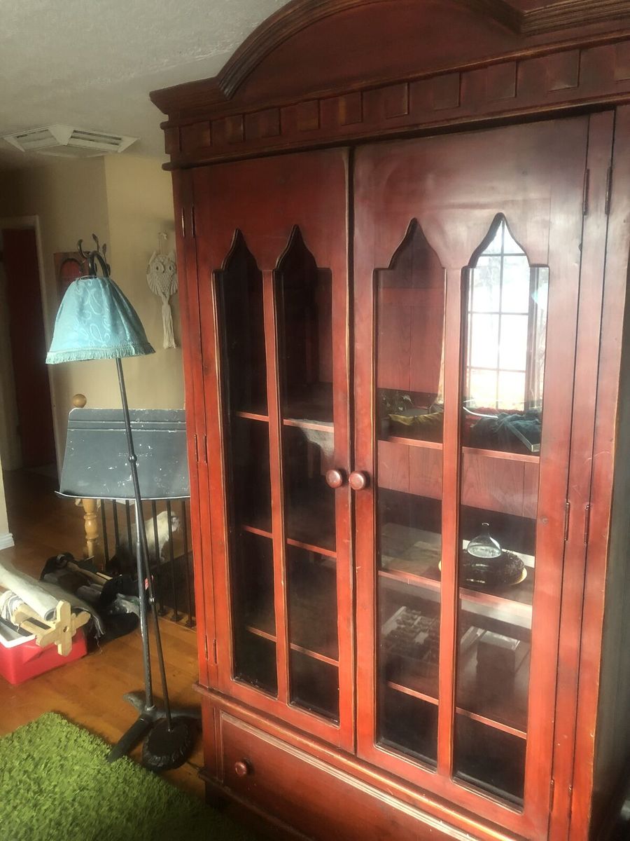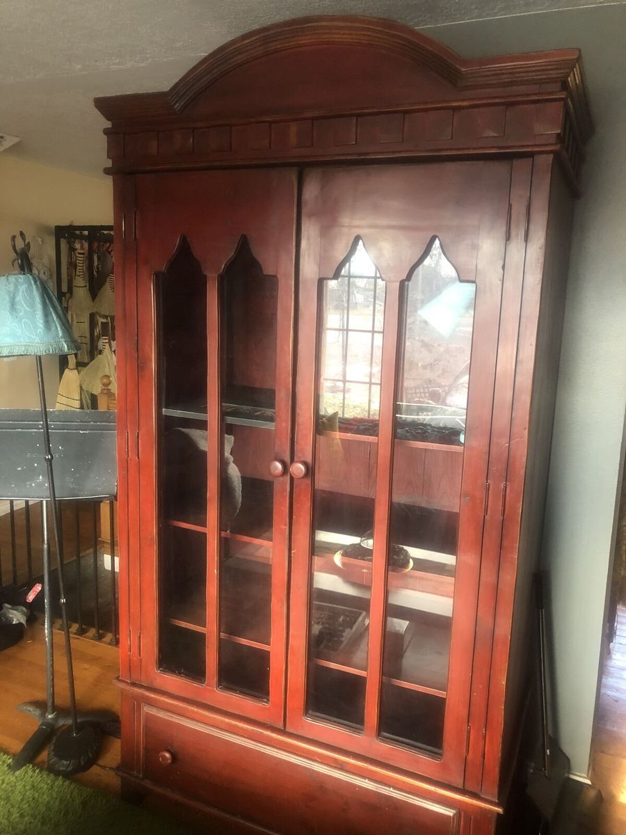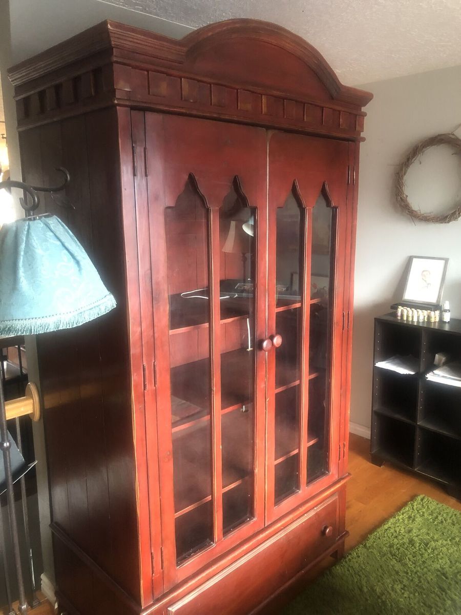 VenmoBeautiful hardwood wardrobe armoire, finished in a rich, warm red tone. Standing approximately 7 feet tall, it features four glass-paneled doors with double hinges, paneled detailing, and an arched crown. Measures 49"w x 27"d x 90"h.