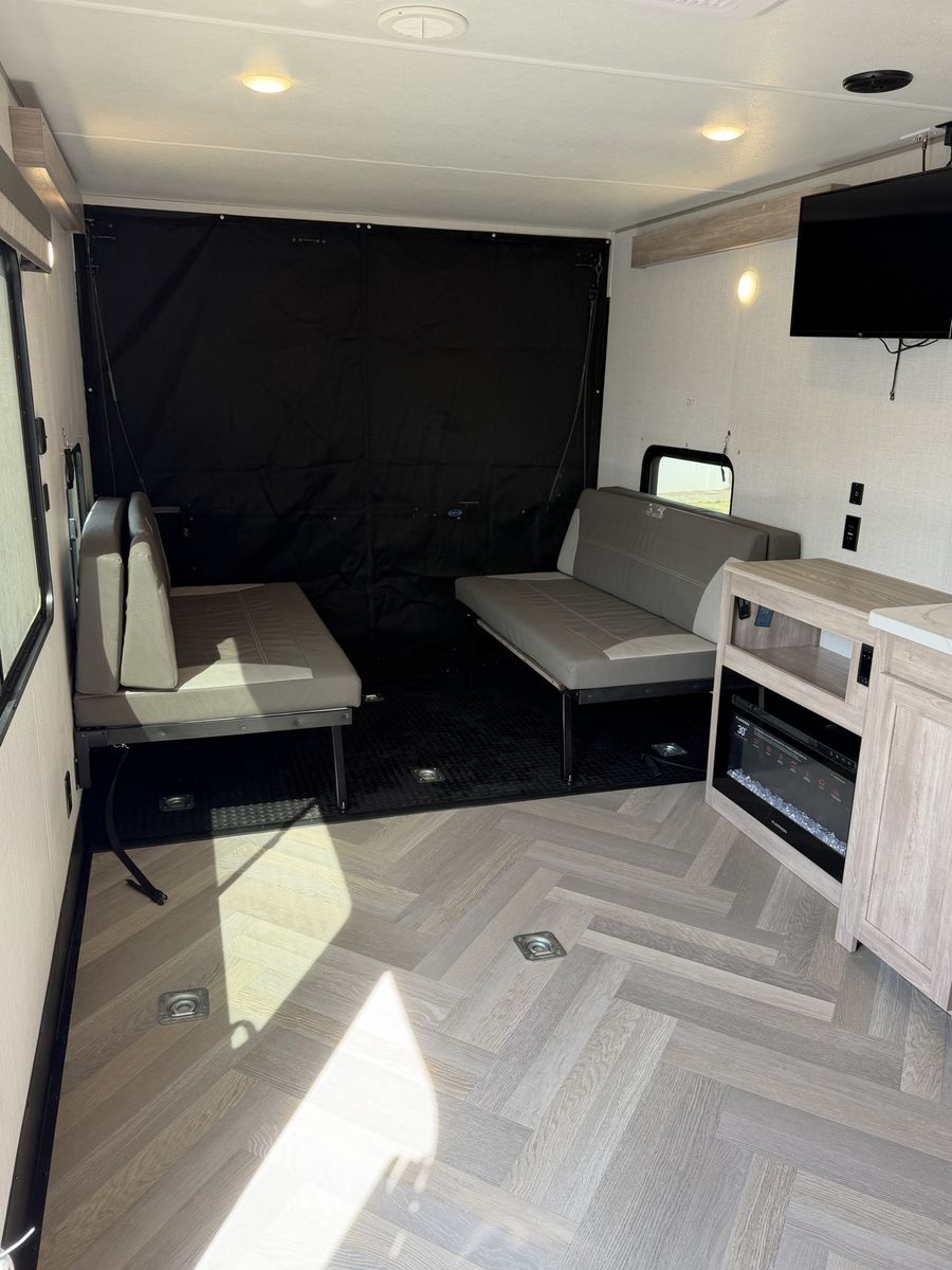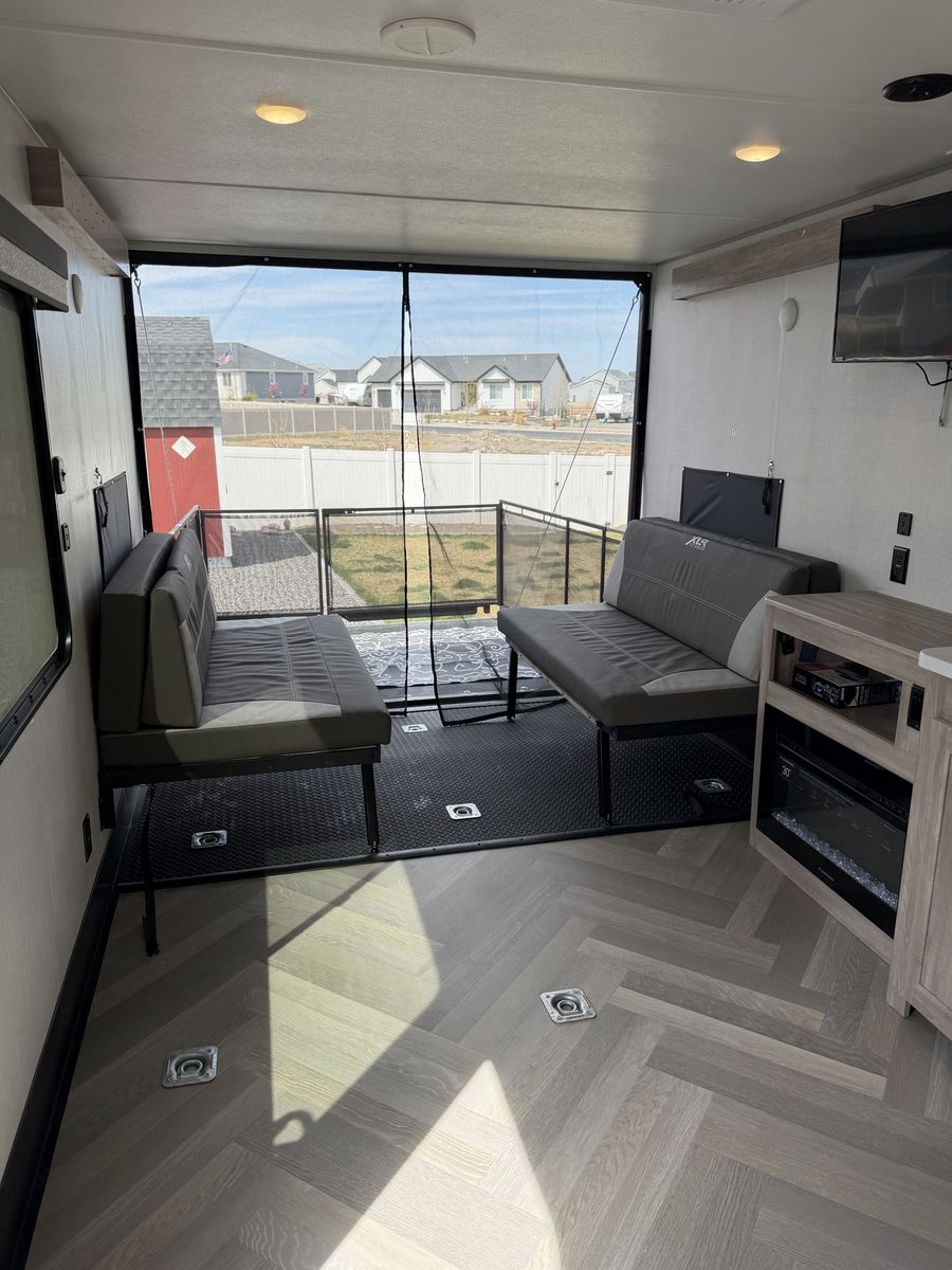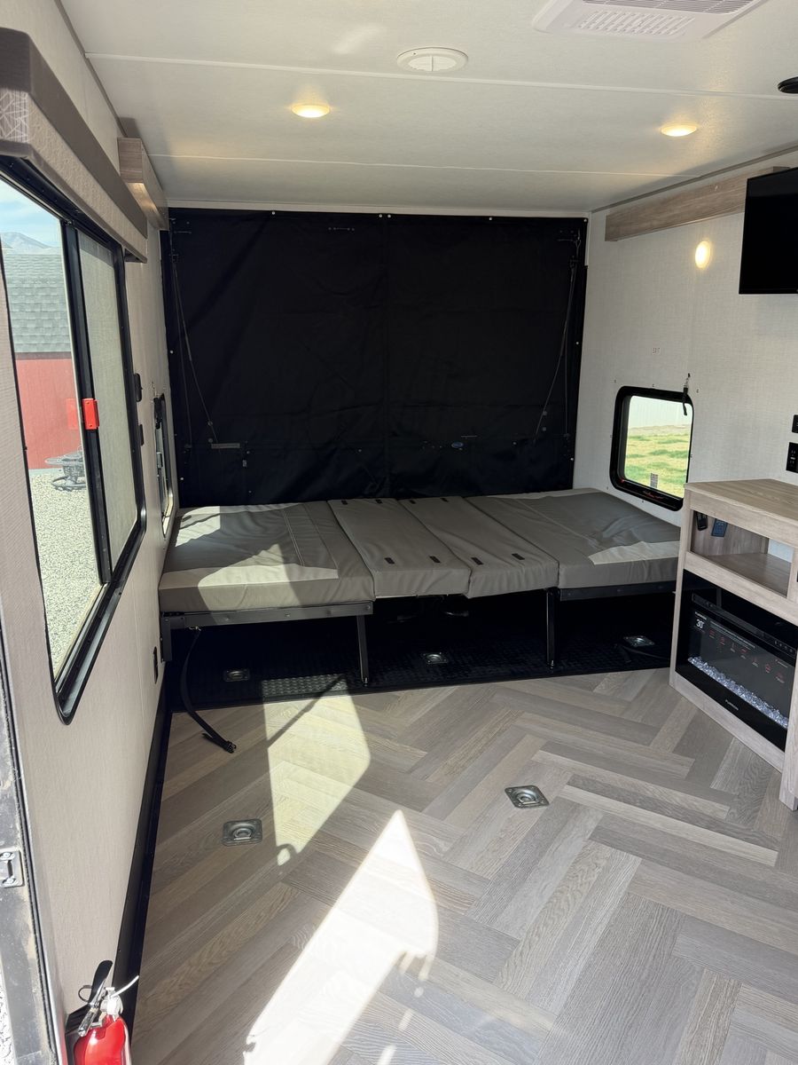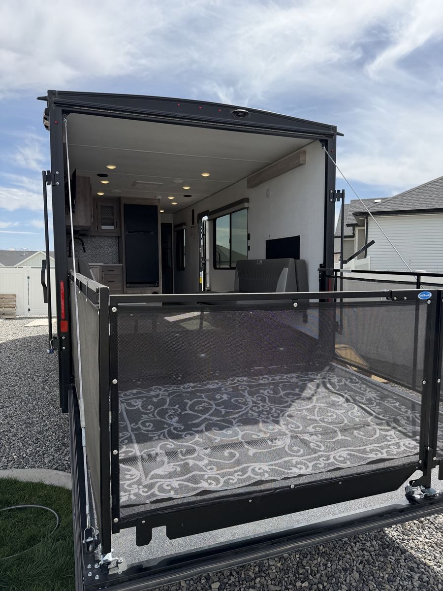 Length: 32' 5" Dry Weight: 7,063 lbs (easy to tow with most half-ton trucks) GVWR: 11,470 lbs Cargo Capacity: 4,407 lbs 14' 2" garage with ramp door — easily fit our full-size Polaris General XP 4-seater Sleeps 6–8 people Walk-around queen bed with brand new 10-inch Green Tea Cooling Gel Memory Foam mattress (never slept on – we upgraded it immediately) Two gaucho sofas that convert into additional sleeping space 10 cu. ft. 12V refrigerator, 3-burner cooktop, convection microwave, and 30" fireplace Valuable Extras Included: