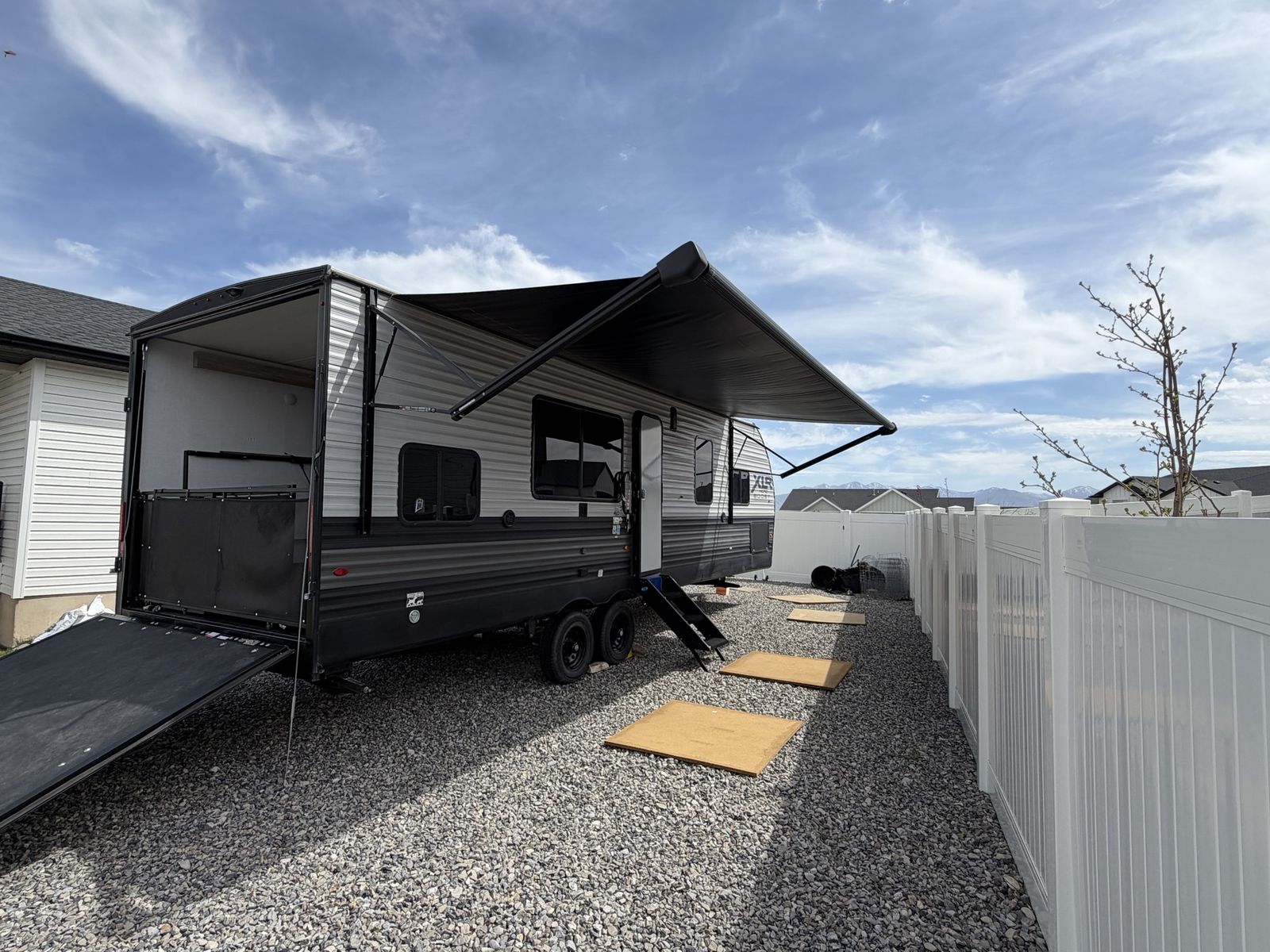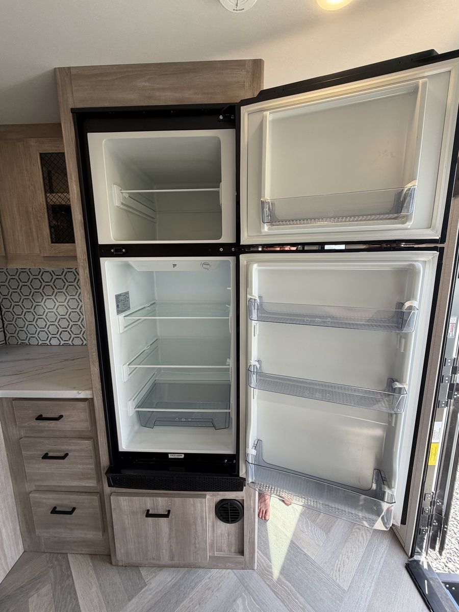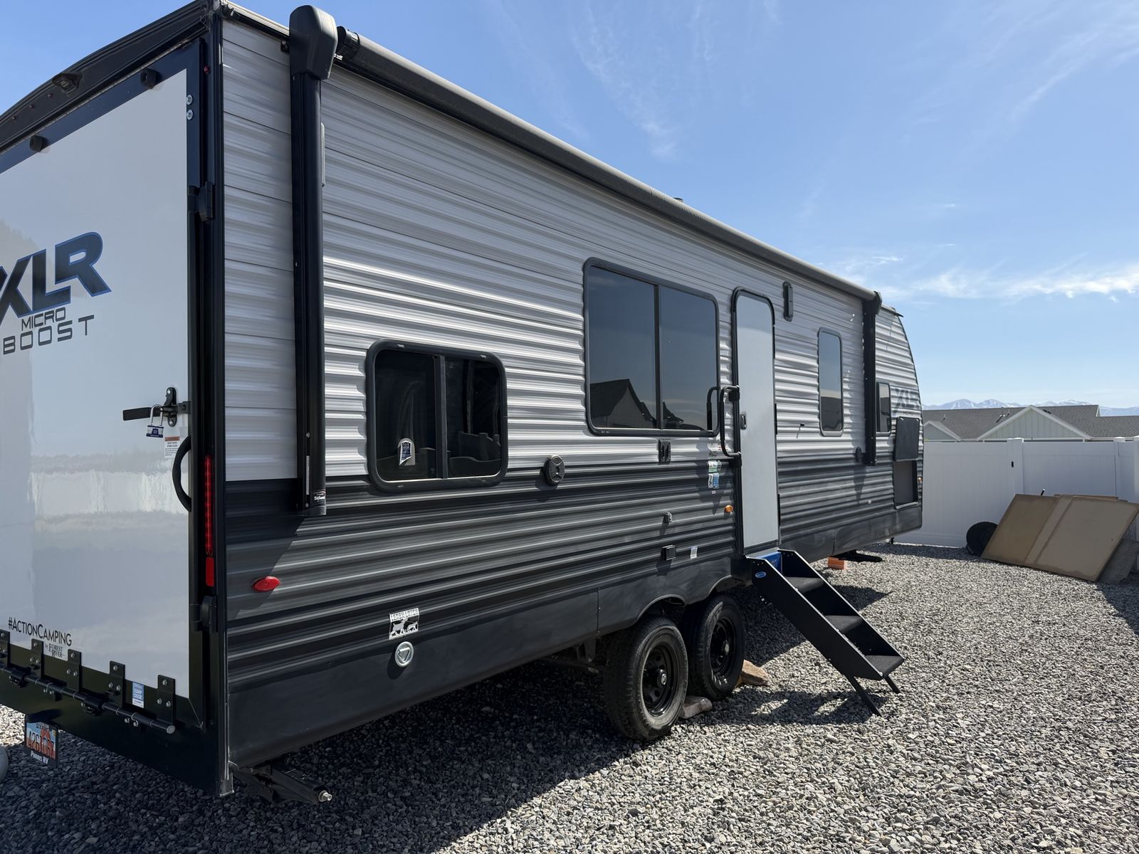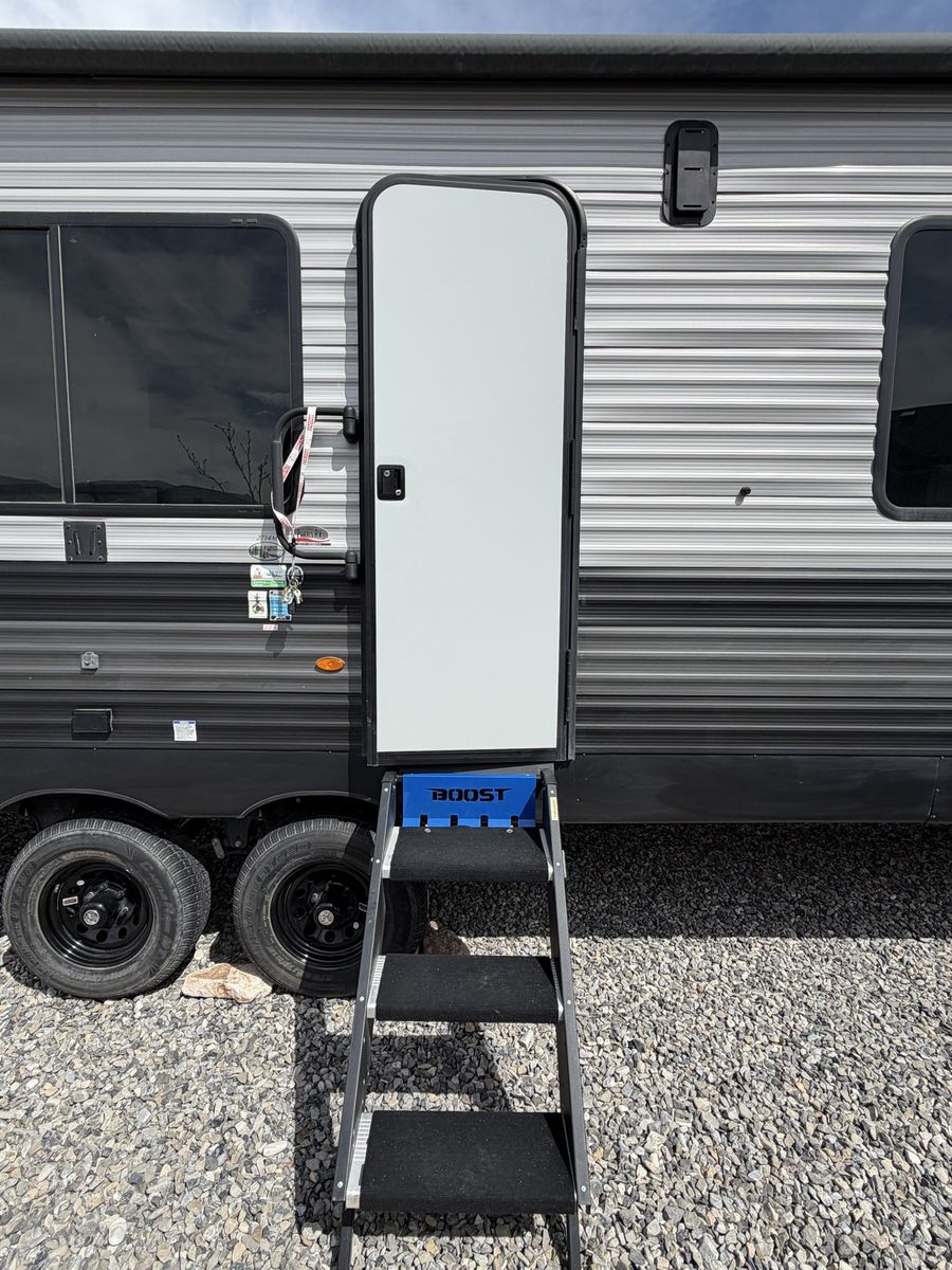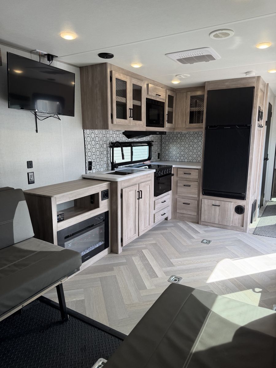 Length: 32' 5" Dry Weight: 7,063 lbs (easy to tow with most half-ton trucks) GVWR: 11,470 lbs Cargo Capacity: 4,407 lbs 14' 2" garage with ramp door — easily fit our full-size Polaris General XP 4-seater Sleeps 6–8 people Walk-around queen bed with brand new 10-inch Green Tea Cooling Gel Memory Foam mattress (never slept on – we upgraded it immediately) Two gaucho sofas that convert into additional sleeping space 10 cu. ft. 12V refrigerator, 3-burner cooktop, convection microwave, and 30" fireplace Valuable Extras Included: