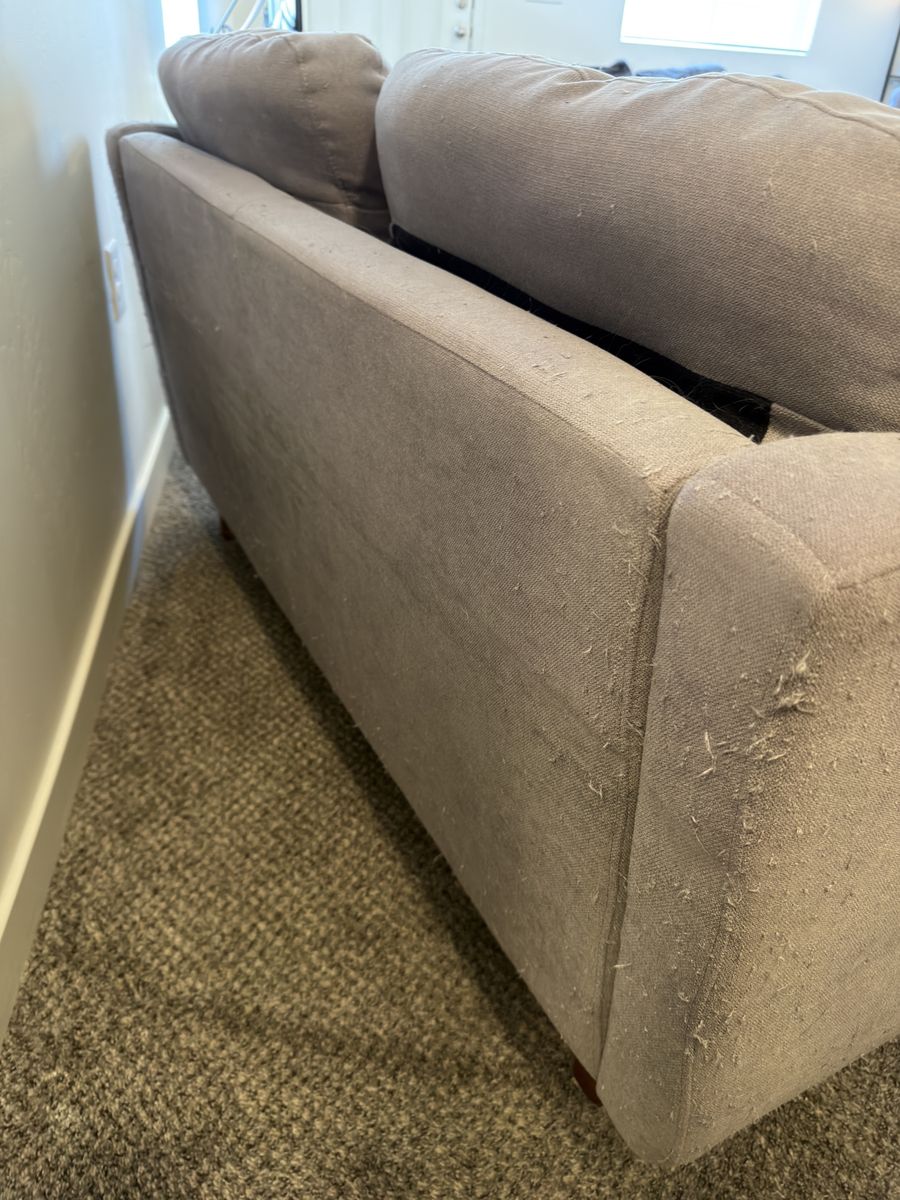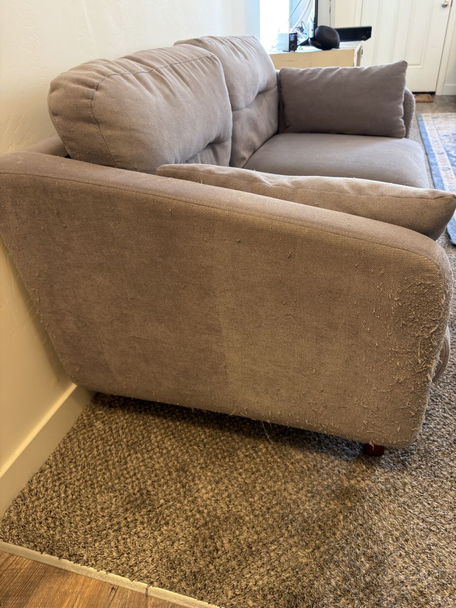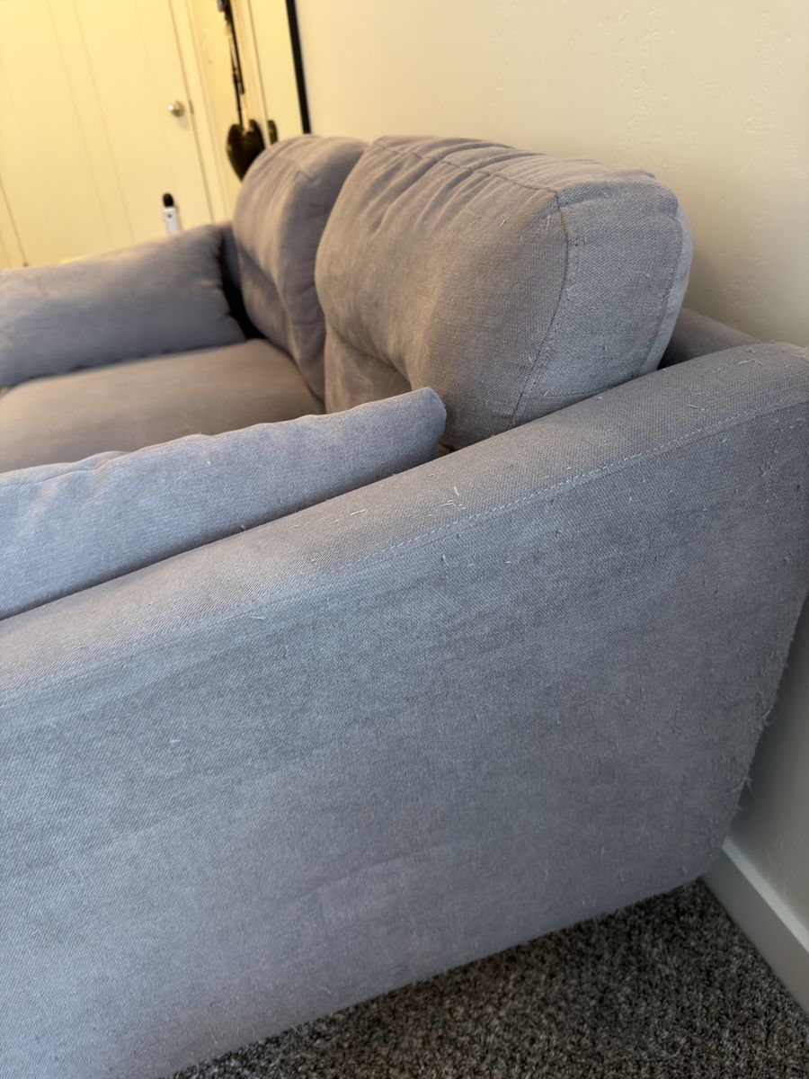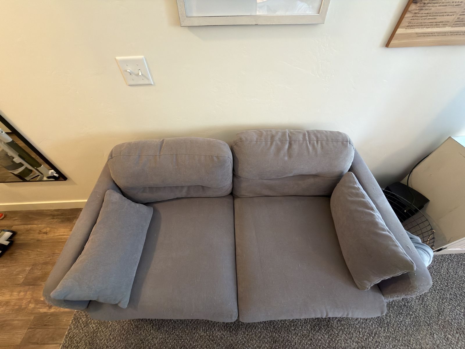 ApplePayComfy grey loveseat for sale. Sadly, we just couldn’t give it the care and attention it deserves. Has obvious cat scratch damage, but seats and cushions are all in good shape and very comfortable. Looking for someone to take it to a loving home.